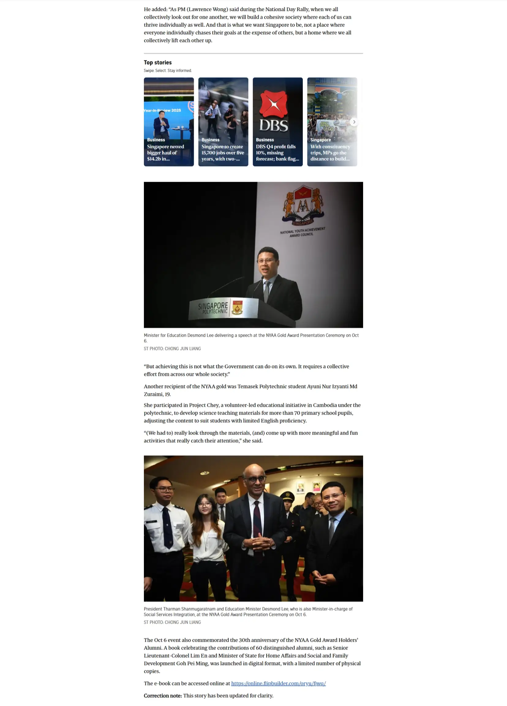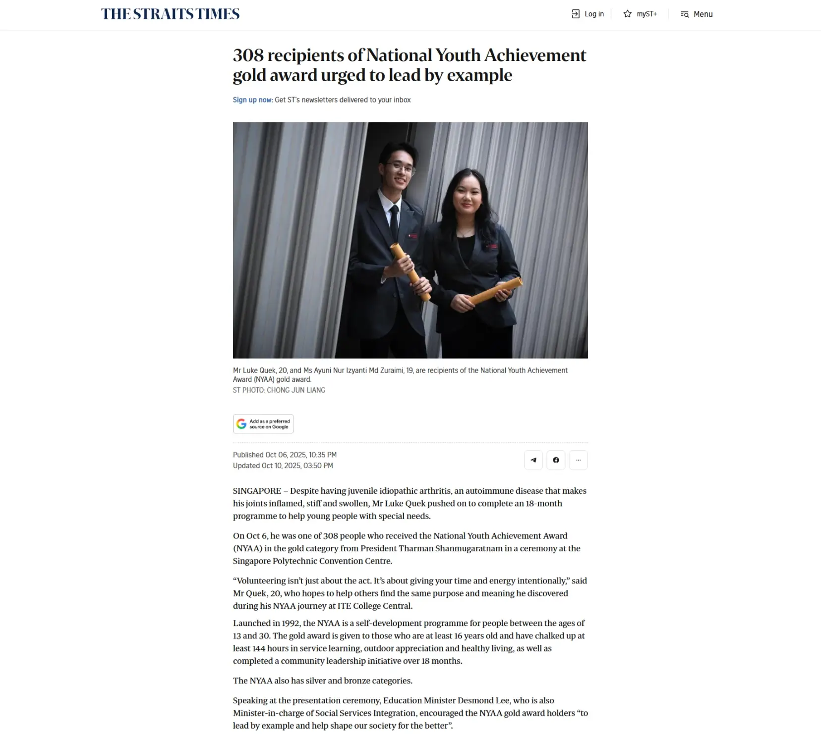 Ayuni Nur Izyanti Mohamad Zuraimi, a third-year Medical Biotechnology student at Temasek Polytechnic (TP), was awarded the Gold Award at the National Youth Achievement Award (NYAA) ceremony on 6 October 2025, in recognition of her exceptional contributions to community service and leadership..