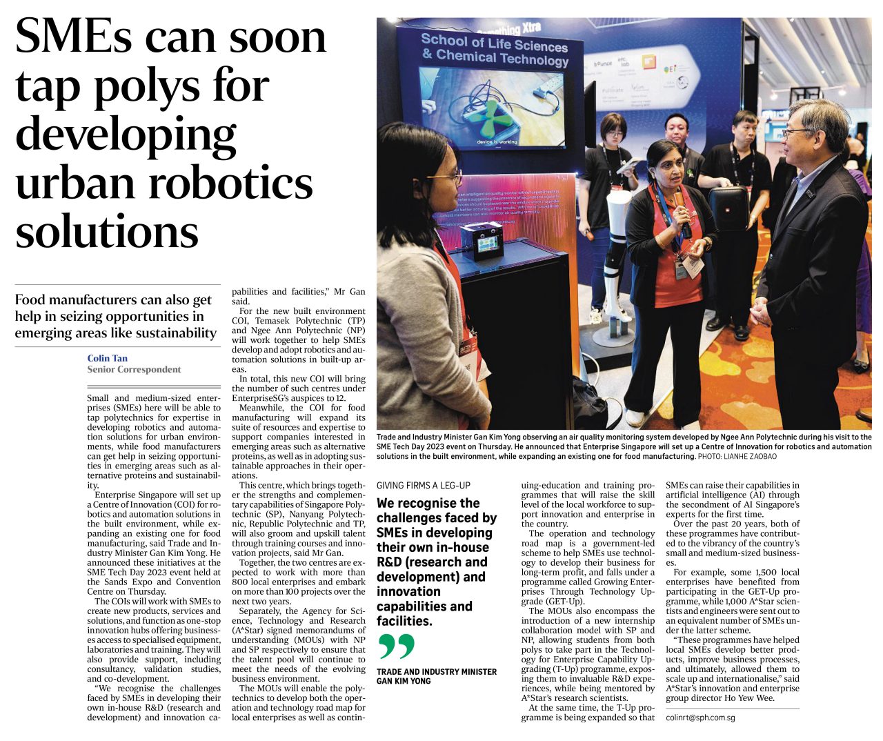 Small and medium-sized enterprises (SMEs) here will be able to tap polytechnics for expertise in developing robotics and automation solutions for urban environments, while food manufacturers can get help in seizing opportunities in emerging areas such as alternative proteins and sustainability. For the new built environment COI, Temasek Polytechnic (TP) and Ngee Ann Polytechnic (NP) will work together to help SMEs develop and adopt robotics and automation solutions in built-up areas.