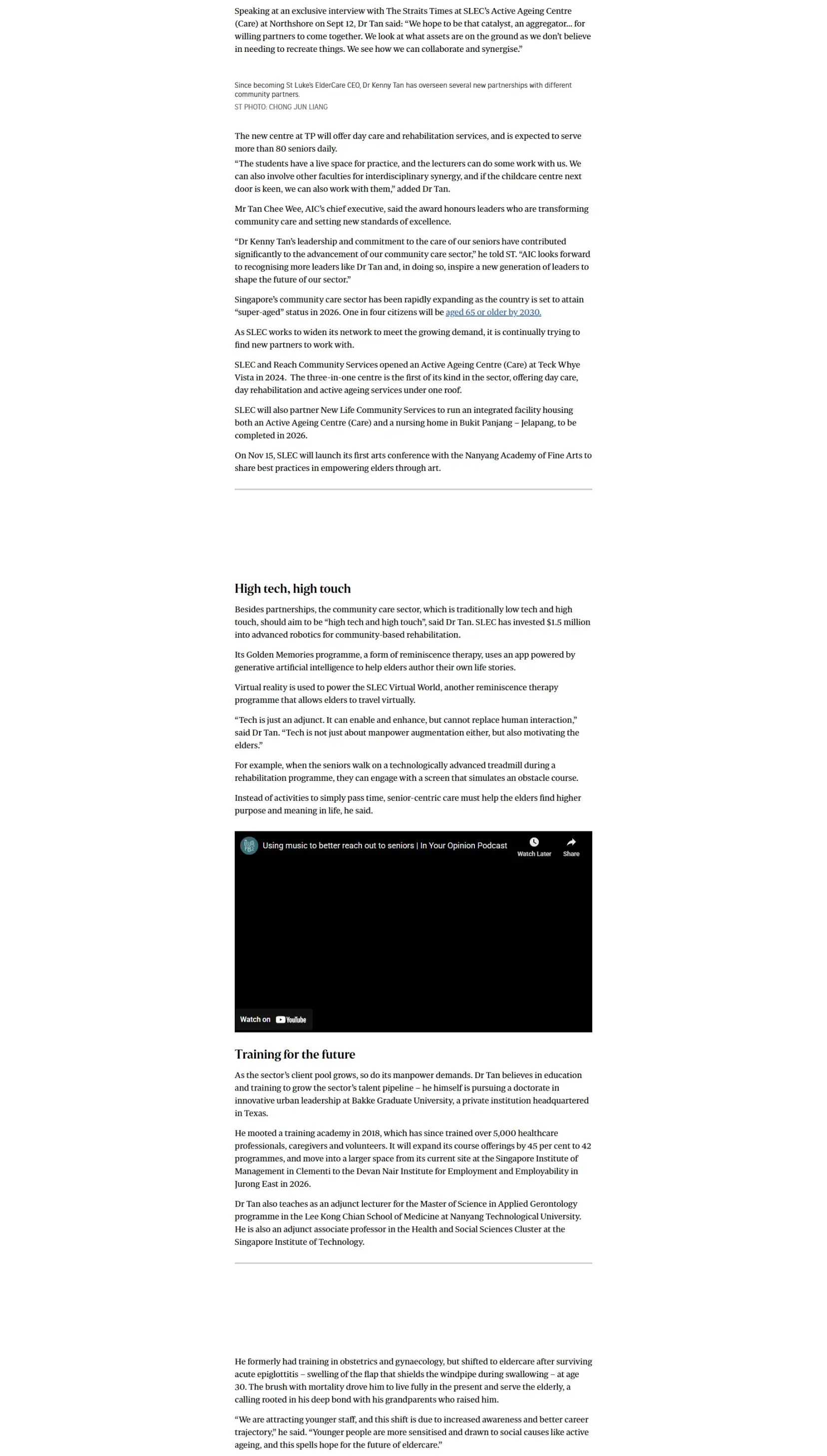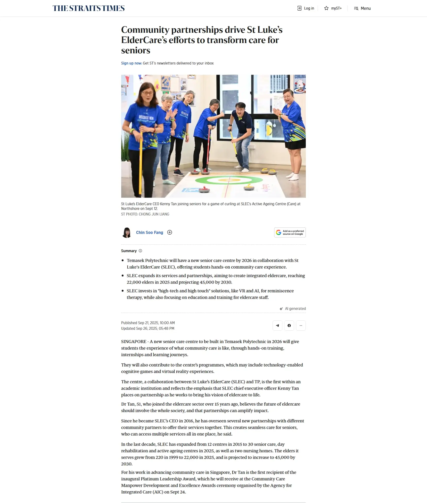 In 2026, Temasek Polytechnic (TP) will be openin a new centre in collaboration with St Luke’s ElderCare (SLEC) which would give students hands-on training, internships and learning journeys in community care while also contributing to programmes such as technology-enabled cognitive games and virtual reality experiences.