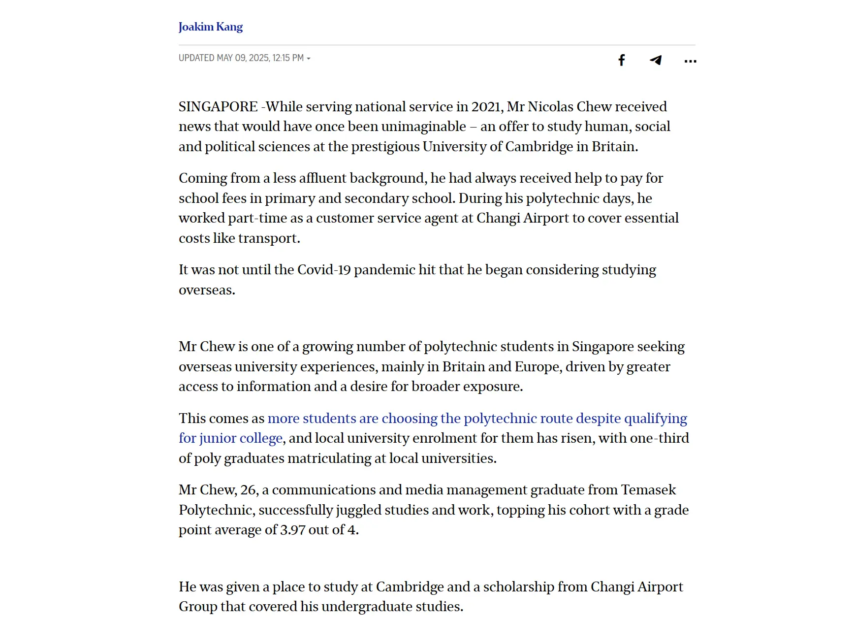Feature on TP graduate, Nicolas Chew who received his acceptance letter to the University of Cambridge in Britain while he was serving NS. As someone who came from a less affluent background, he even recounts how he took on part-time jobs during his time in TP to cover some of his daily expenses.