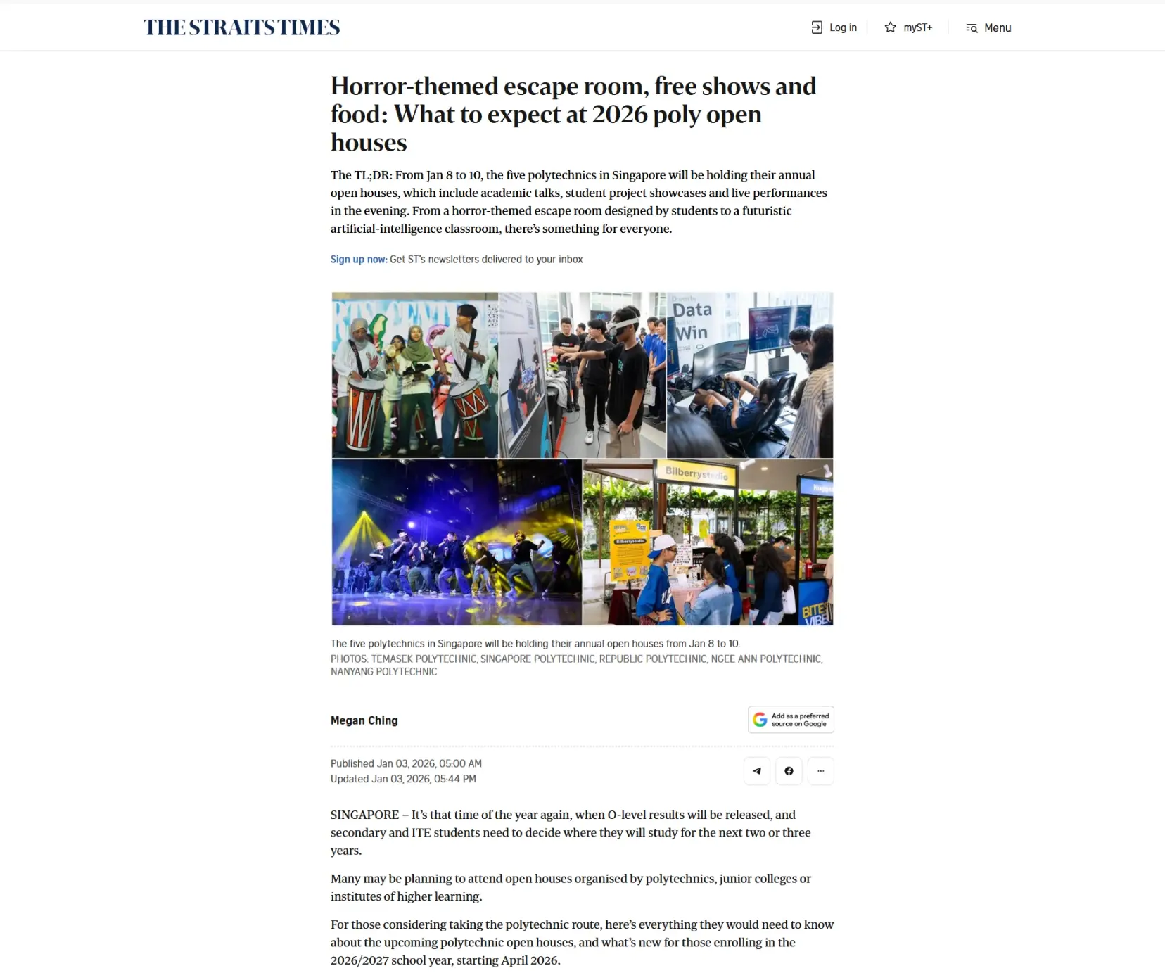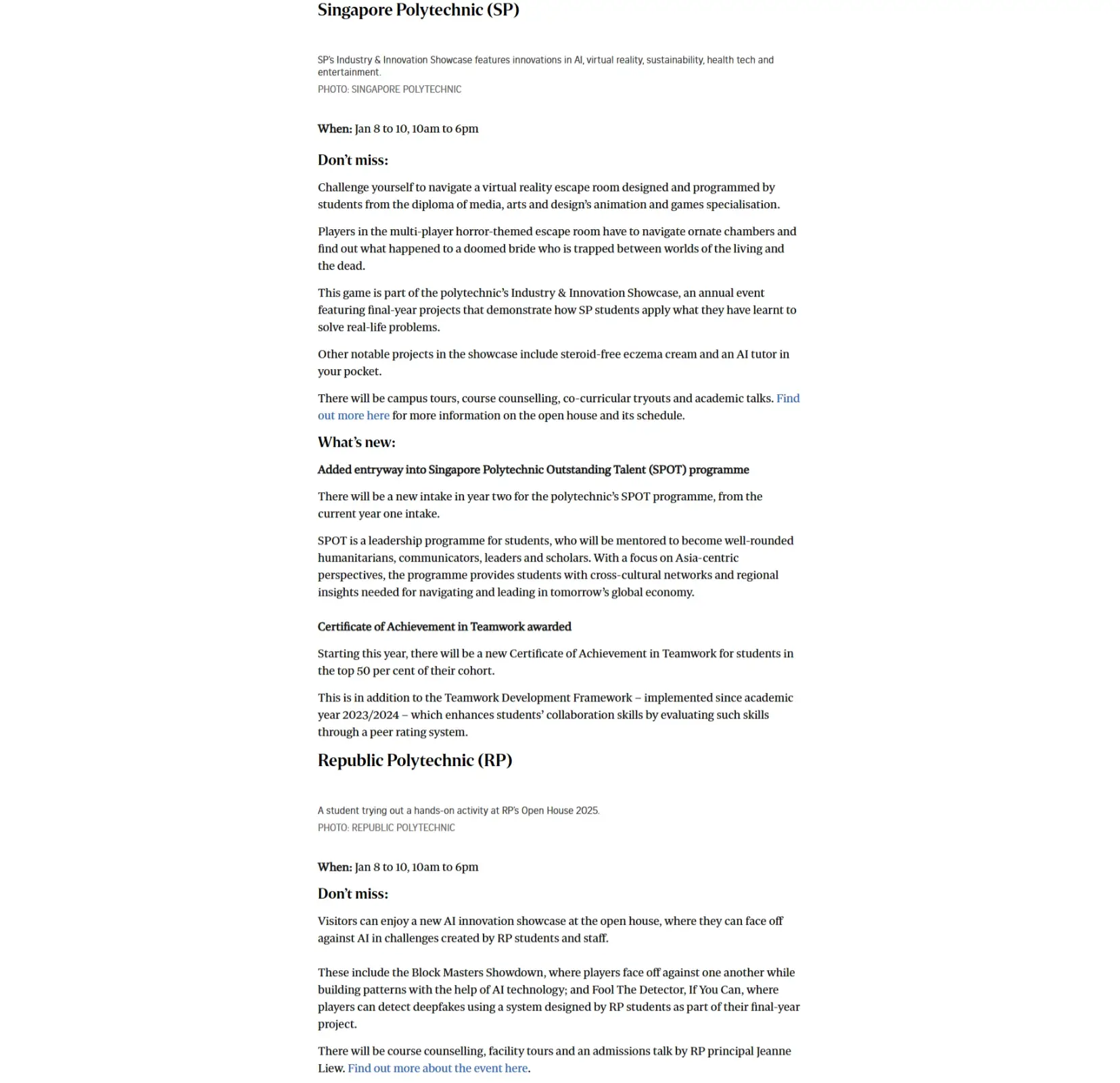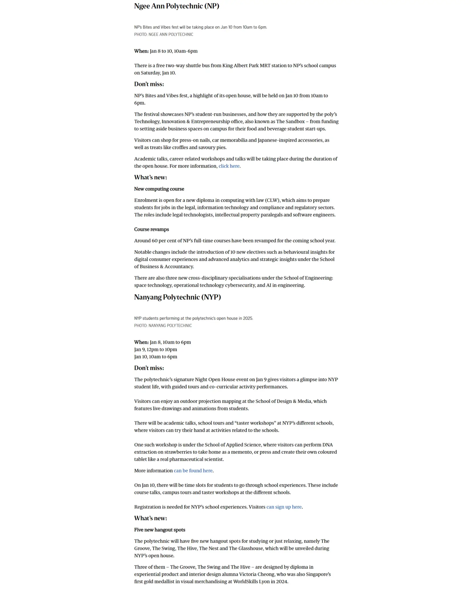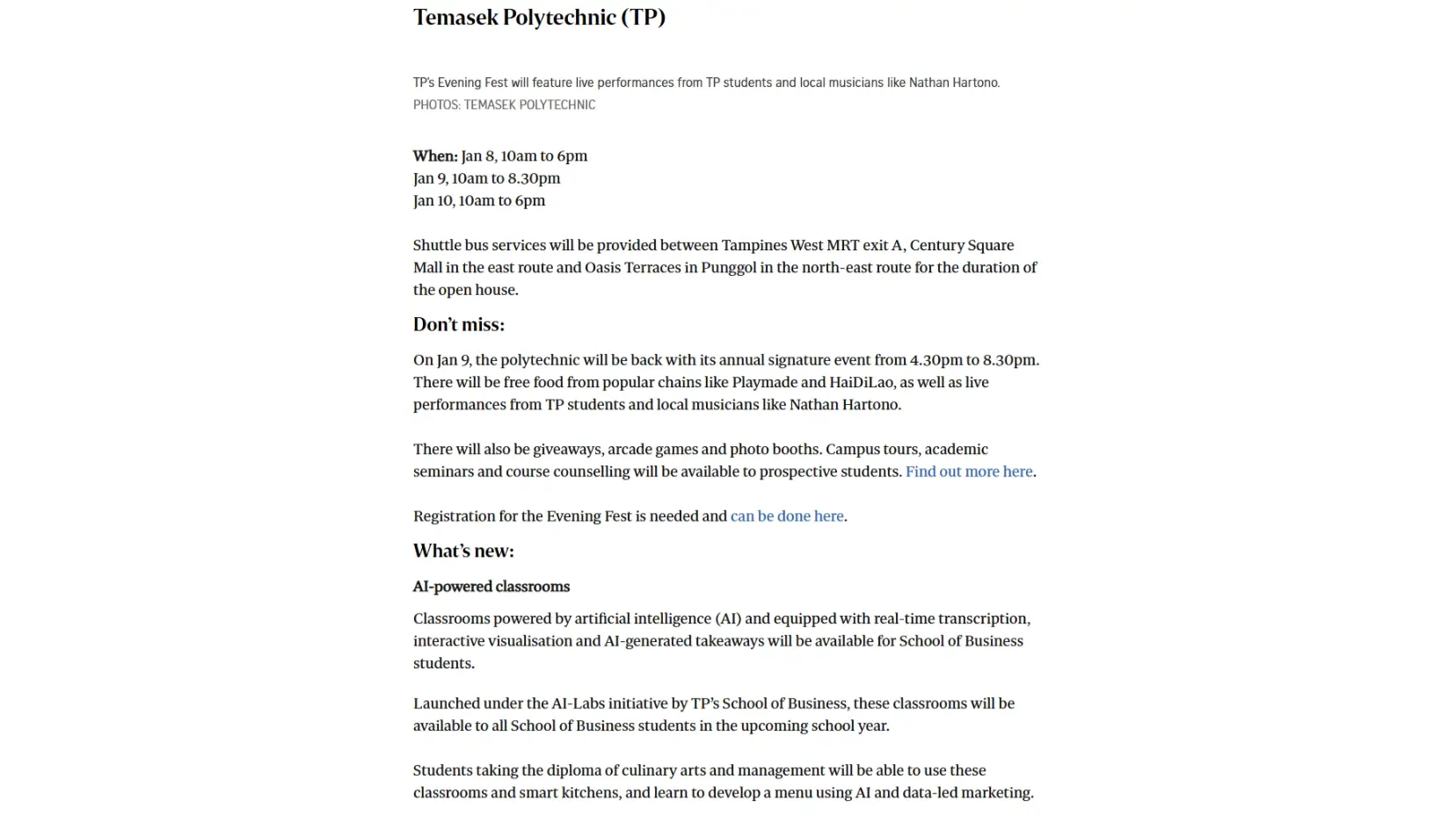 At Temasek Polytechnic’s Open House, free food from popular chains like Playmade and HaiDiLao would be offered to visitors, as well as live performances from TP students and local musicians like Nathan Hartono.