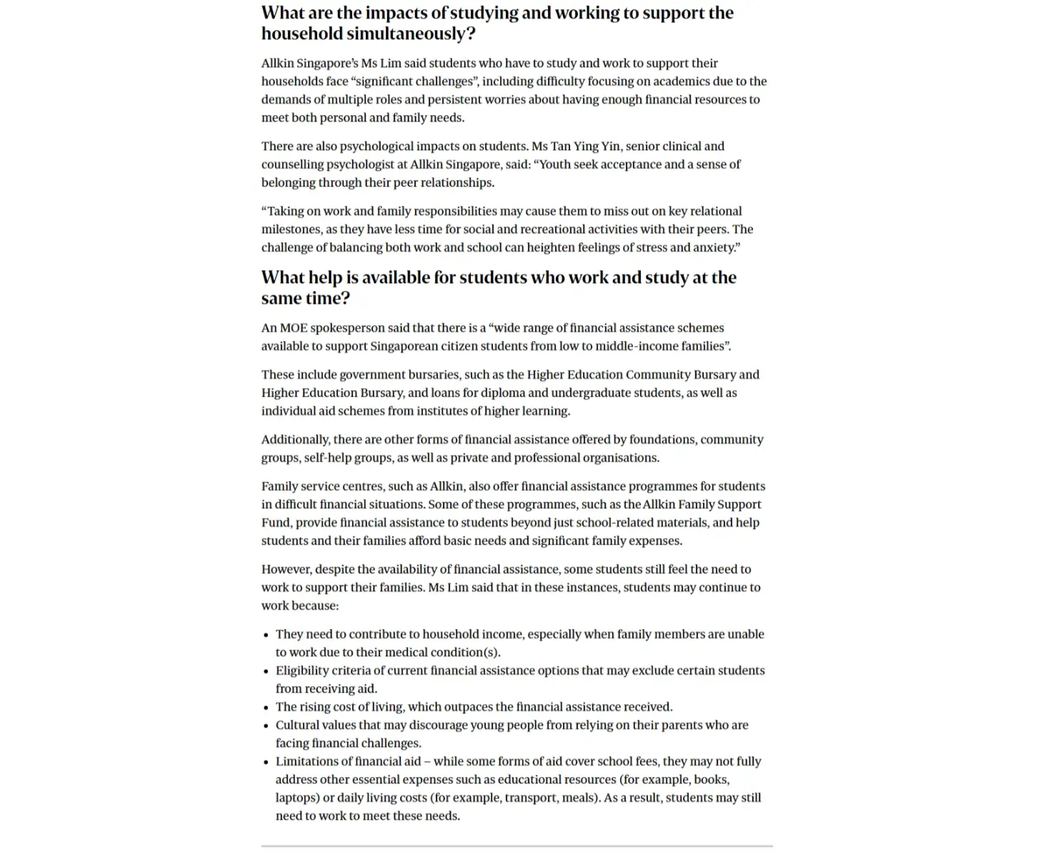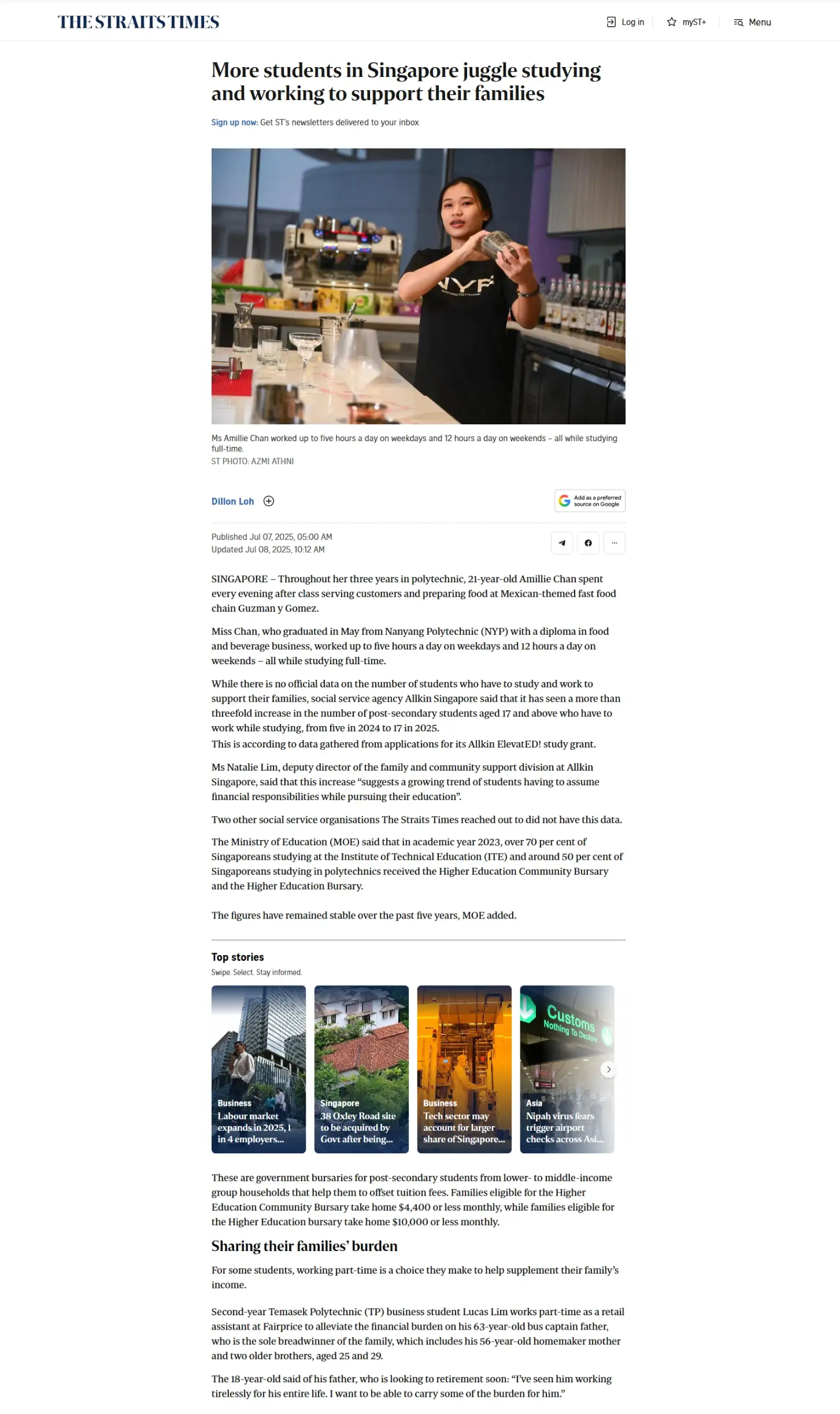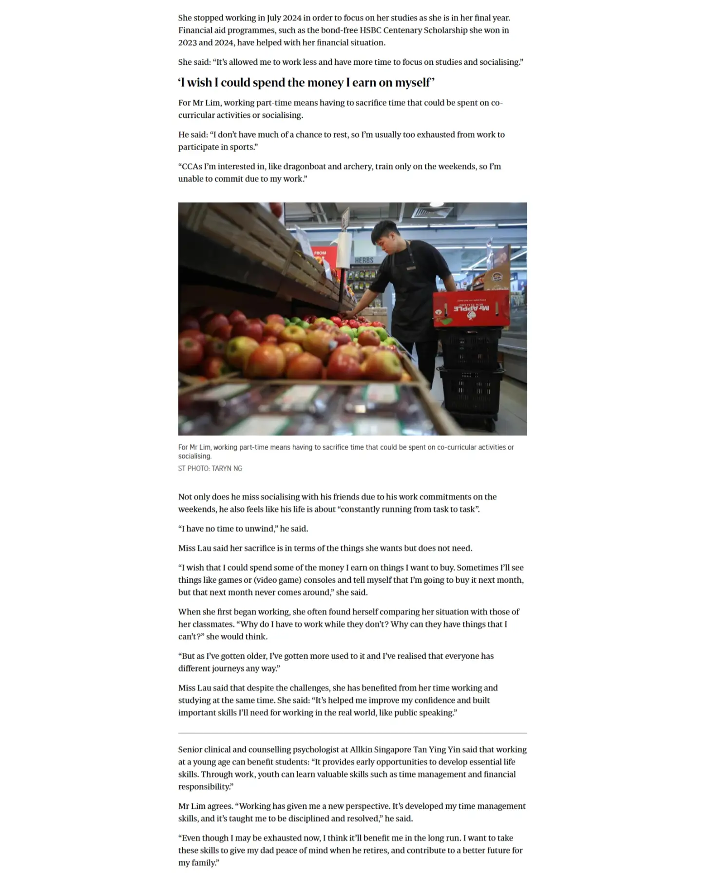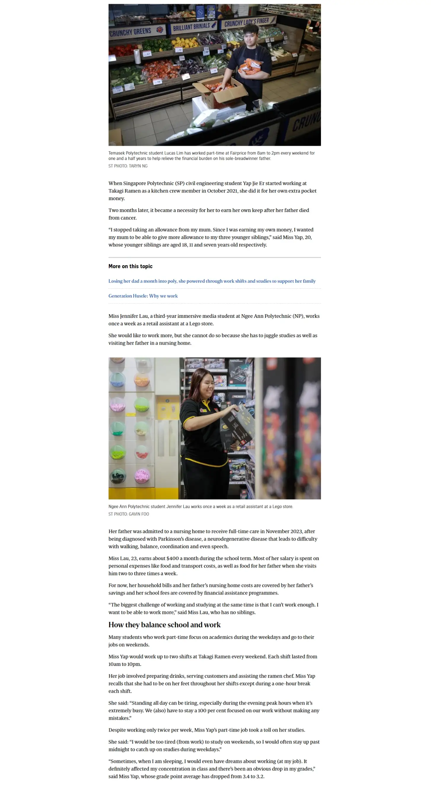 The article features students who are studying and working to support their families. Second-year Temasek Polytechnic Business student Lucas Lim works part-time as a retail assistant.