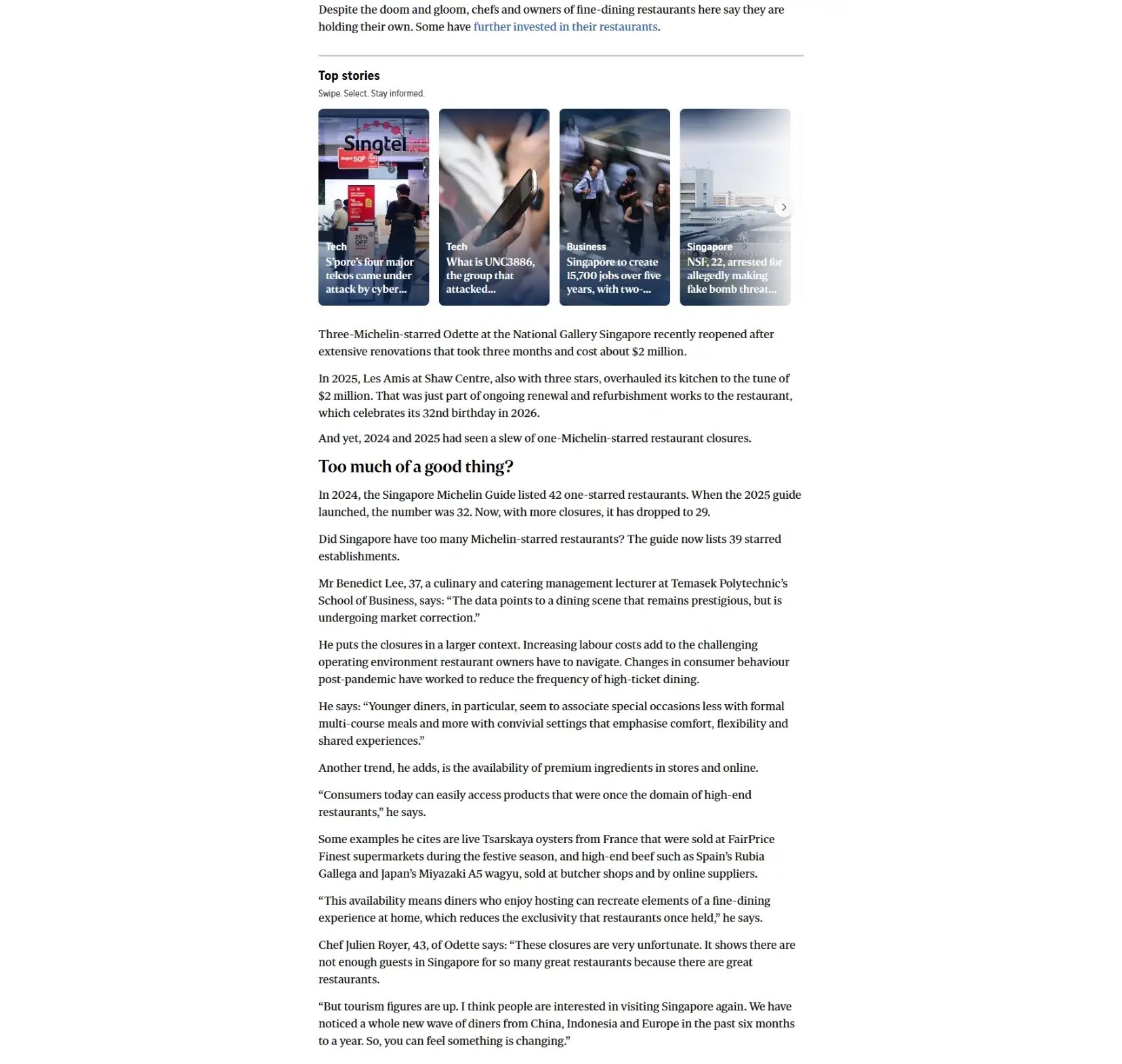 According to Mr Benedict Lee, a culinary and catering management lecturer at Temasek Polytechnic’s School of Business, the dining scene remains internationally regarded but is recalibrating in response to structural challenges.
