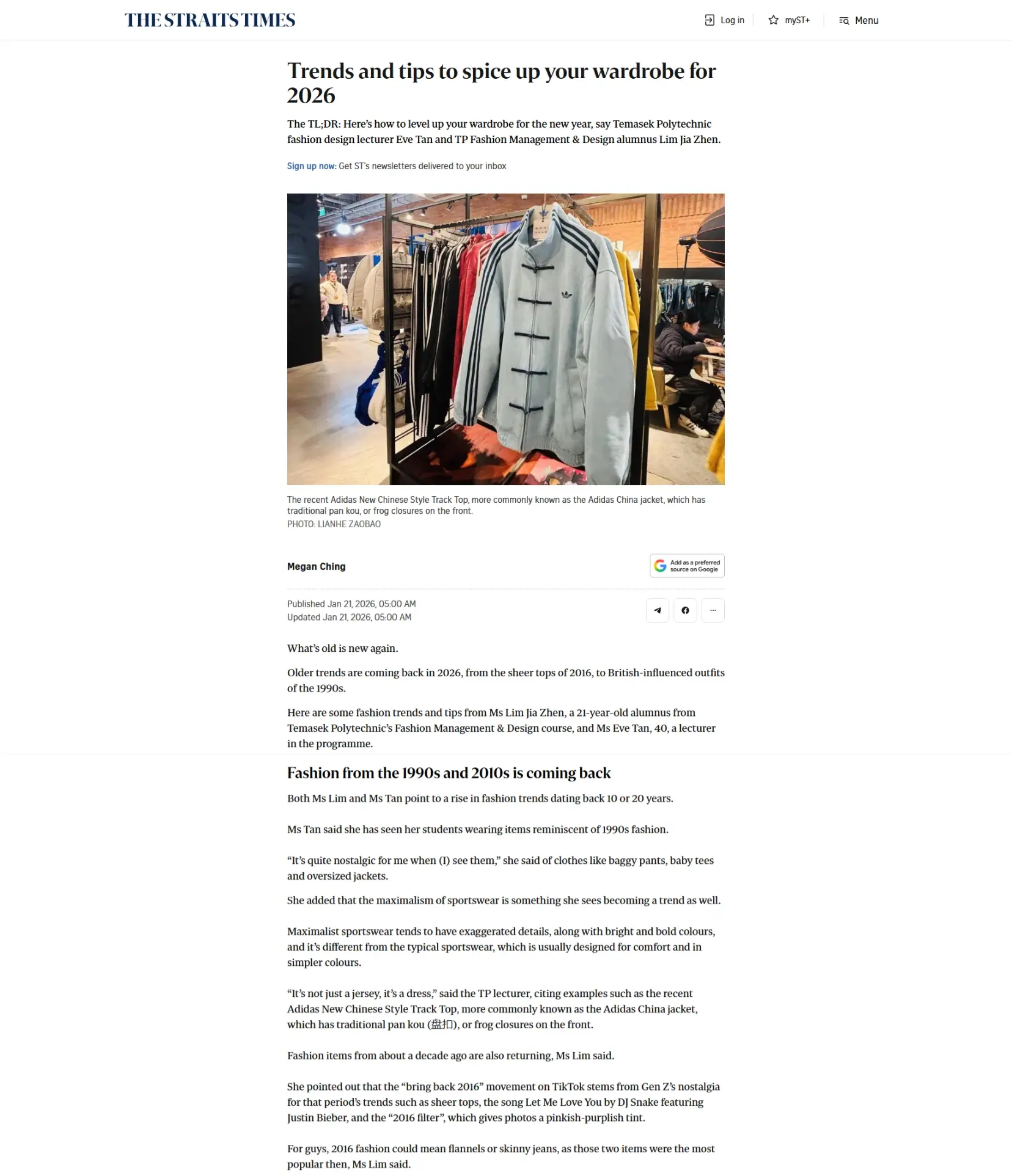 The article featured insights from interviews with FMD lecturer Eve Tan and graduate Lim Jia Zhen, who shared observations on the revival of past trends and offered practical tips on how to reinterpret them in a modern, wearable way, rather than adopting them wholesale.