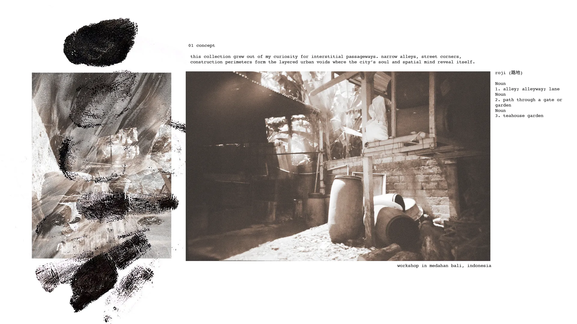 Roji is a collection inspired by my curiosity for interstitial passageways. I closely observed how narrow alleys, street corners, and construction perimeters form layered, transitional urban spaces where a city’s soul and spatial mind reveal itself.