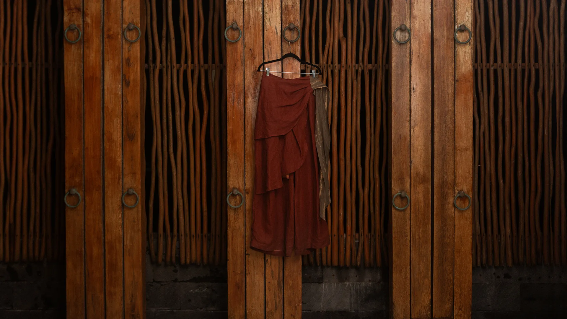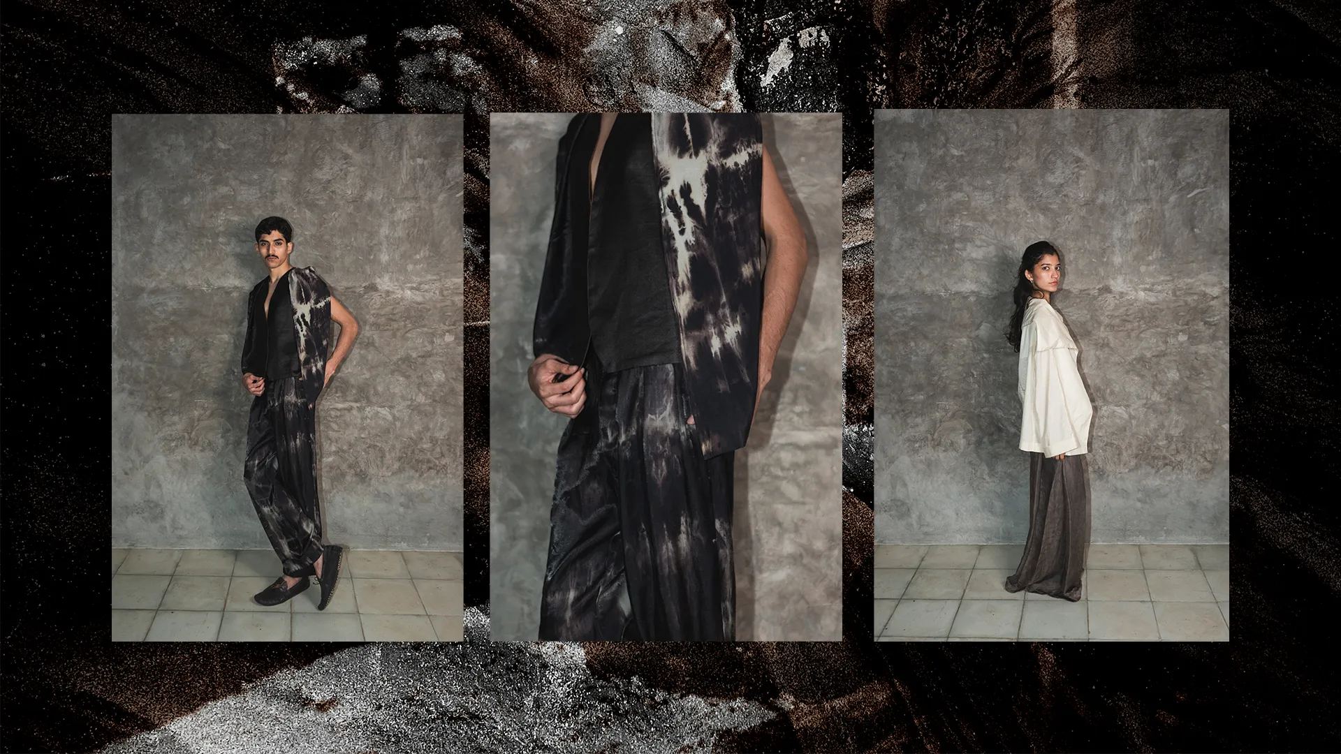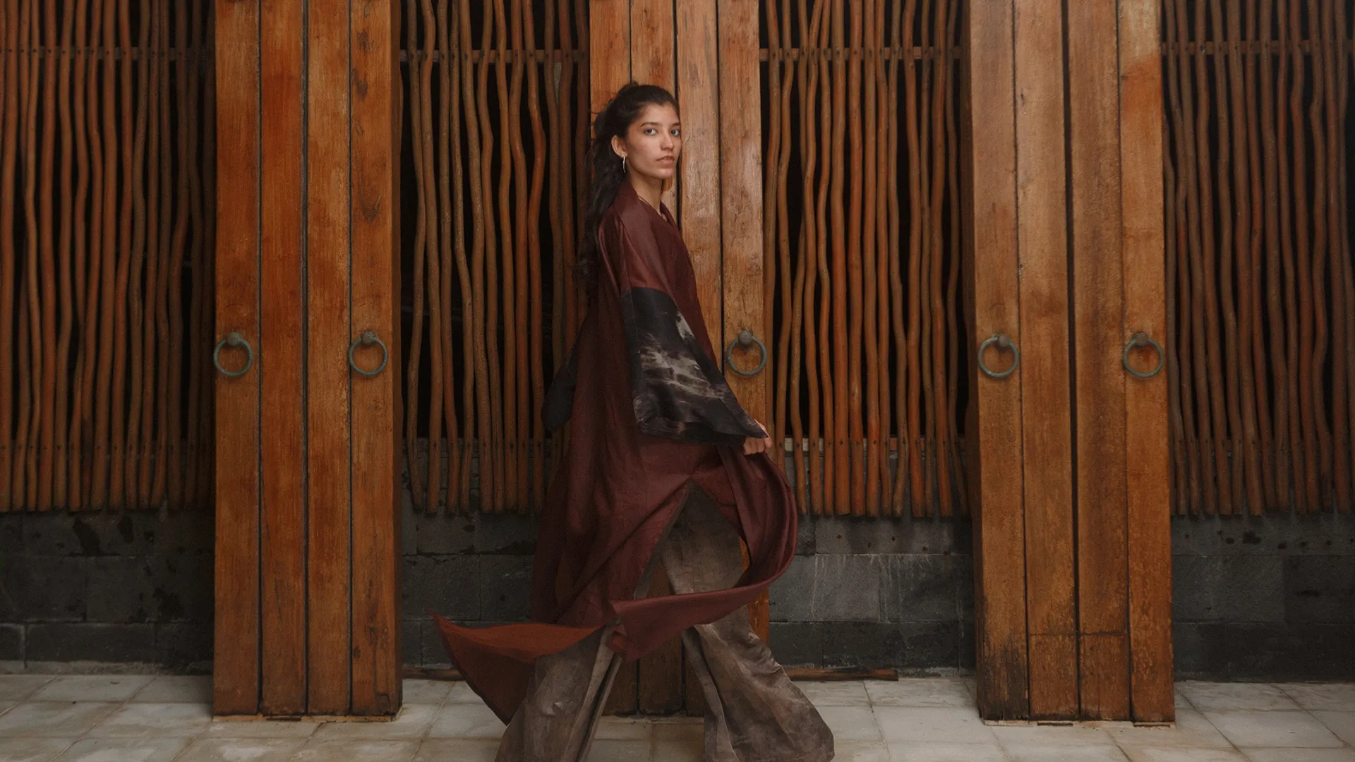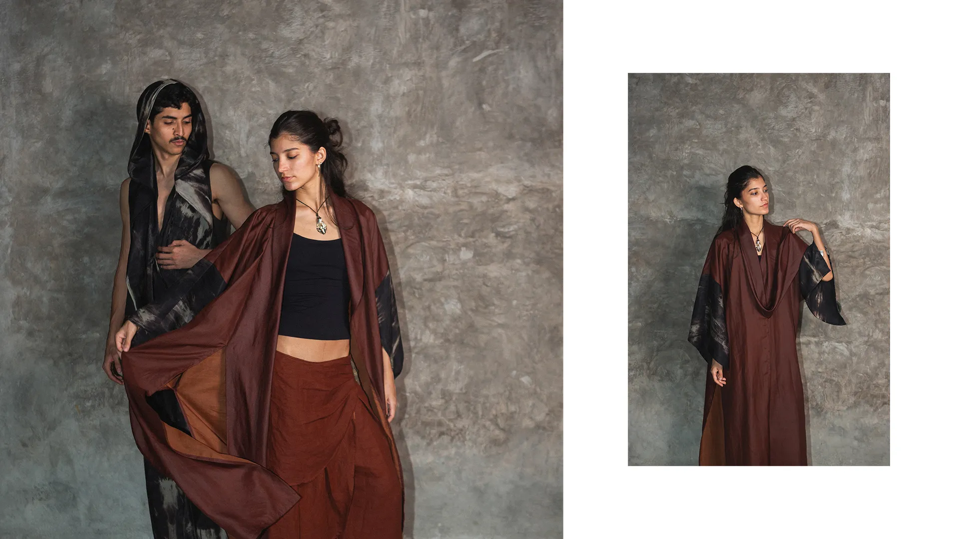 Roji is where time gathers. These vague, undefined spaces hold infinite traces of presence, and carry the weight of intimacy, familiarity and warmth. These spatial qualities are translated into garments with loose, open, and adaptive silhouettes. Textiles are treated with plant dyes and iron-rich mud. Each piece is thoughtfully constructed using waste-conscious pattern cutting. Circularity sits at the core, with every step carefully considered throughout the process.