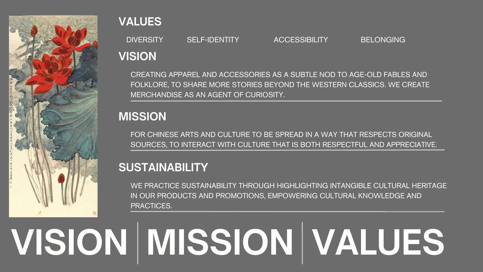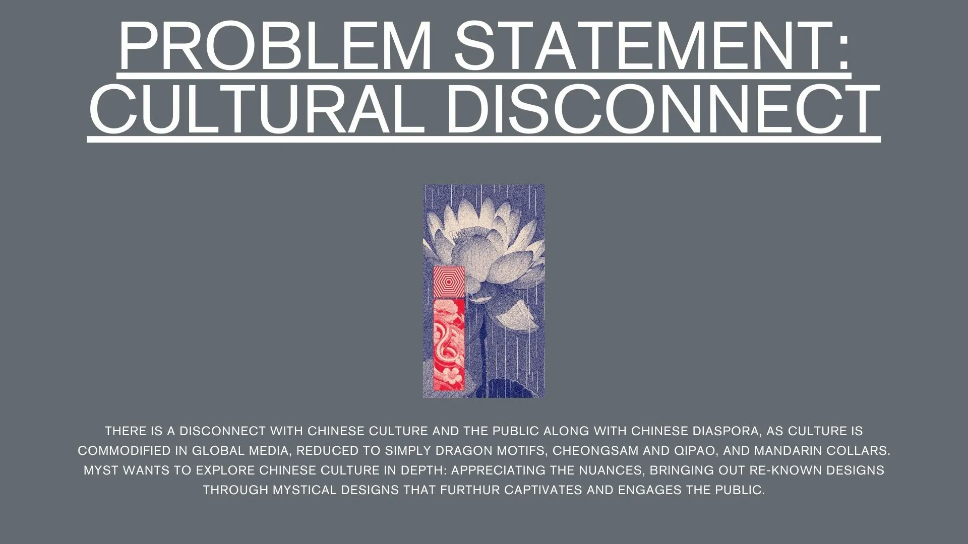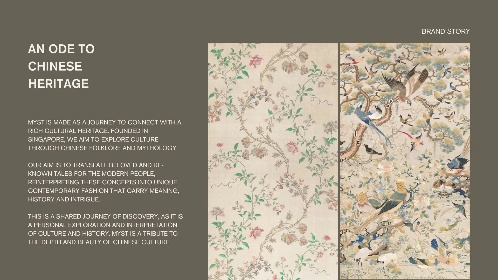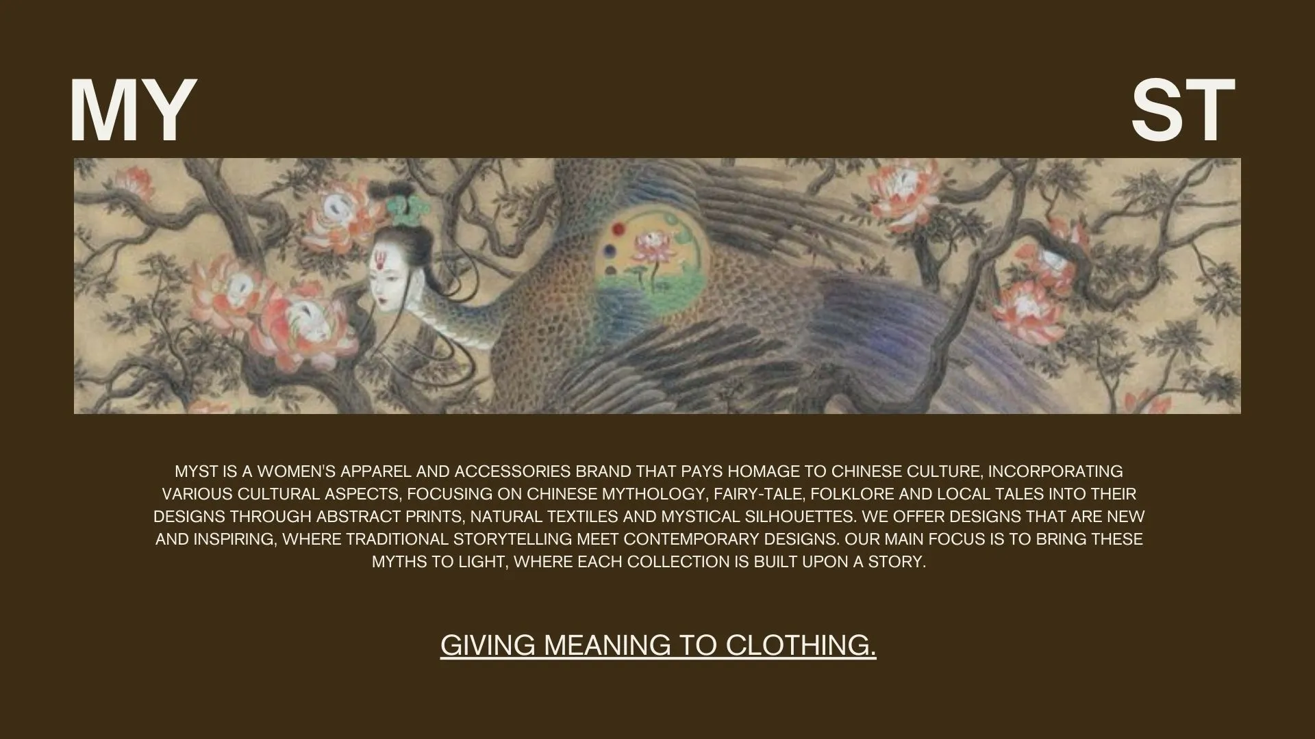 MYST aims to explore Chinese culture in an engaging yet nuanced way, drawing on classic folklore and mythology through brand storytelling and contemporary design. It is a womenswear brand that is abstract and individualist, offering a personal journey for self-discovery and always remaining open to innovation. MYST allows people to connect to their cultural roots as a means of self-expression, empowering them to take pride in their heritage.