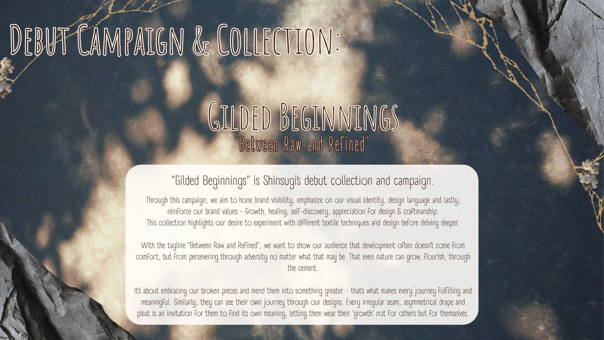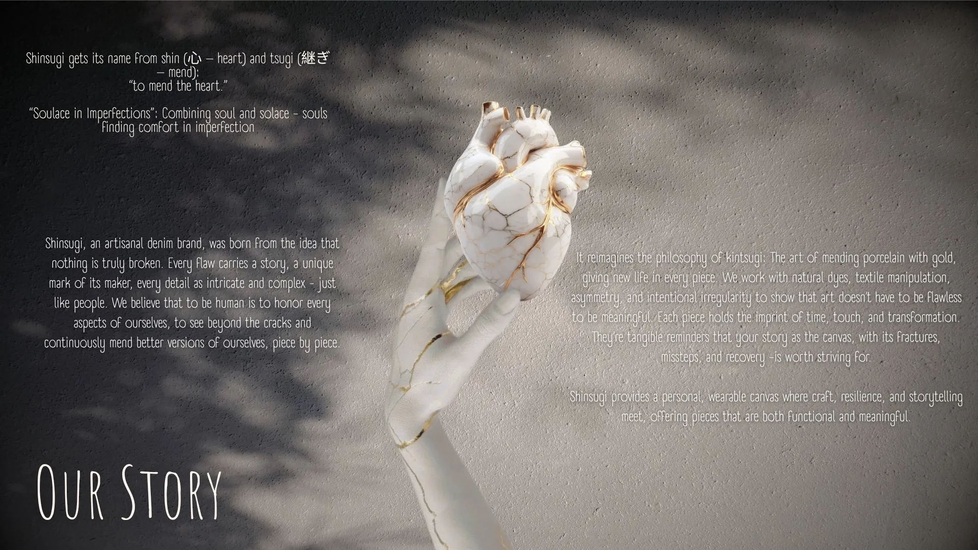 Shinsugi is an artisanal indigo denim brand that fuses streetwear edge with femininity, born from the idea that nothing is truly broken. Every flaw carries a story, a unique mark of its maker, every detail as intricate and complex—just like people. We believe that to be human is to honour every aspect of ourselves, to see beyond the cracks and continuously mend better versions of ourselves, piece by piece. It reimagines the philosophy of “kintsugi”—the art of mending porcelain with gold, giving new life to every piece. We work with natural dyes, textile manipulation, asymmetry, and intentional irregularity to show that art doesn’t have to be flawless to be meaningful. Each piece holds the imprint of time, touch, and transformation. They’re tangible reminders that your stories are the canvas - with its fractures, missteps, and recovery are worth striving for.