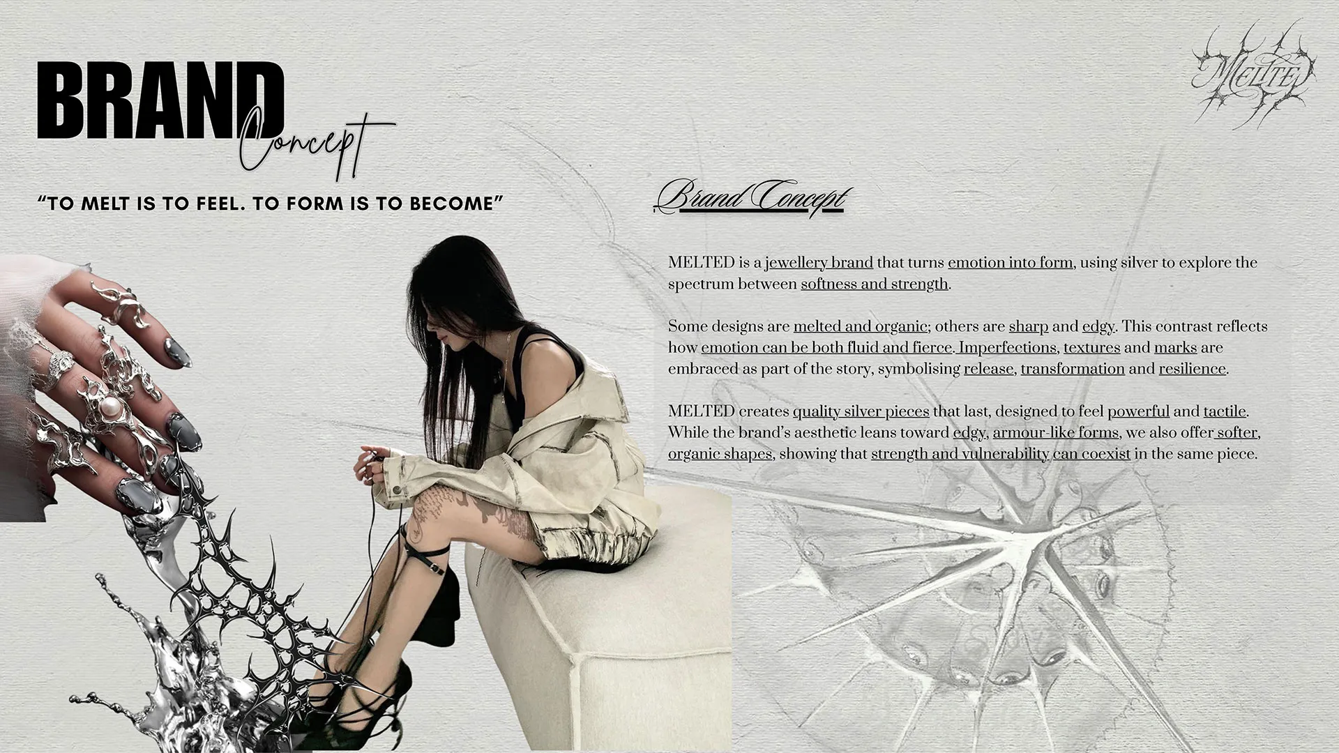 MELTED is a contemporary jewellery brand that transforms emotion into form through sculptural metal design. Rooted in the balance between softness and strength, the brand explores the duality of human experience through organic, melted textures and sharp, armour-inspired structures.