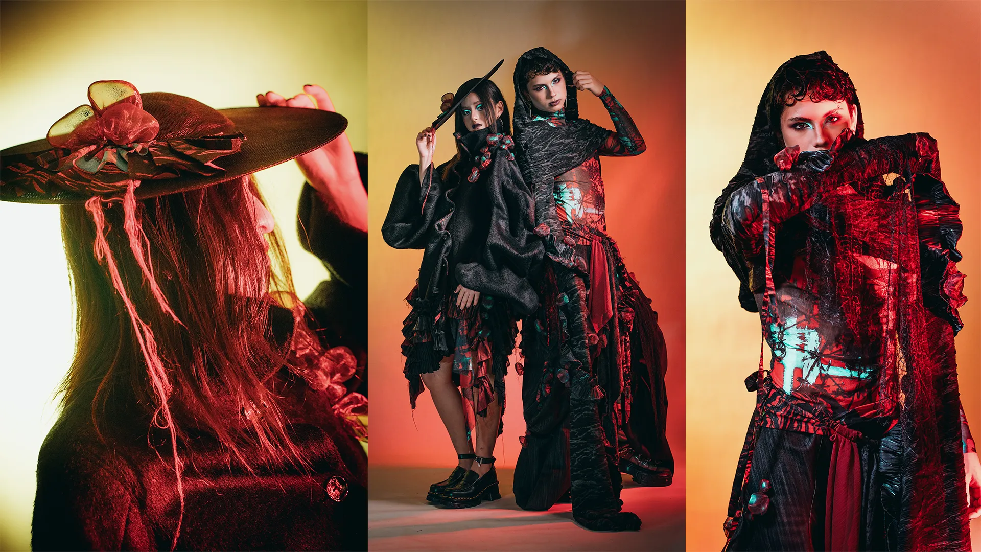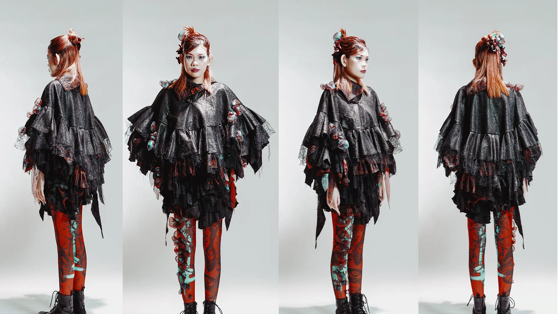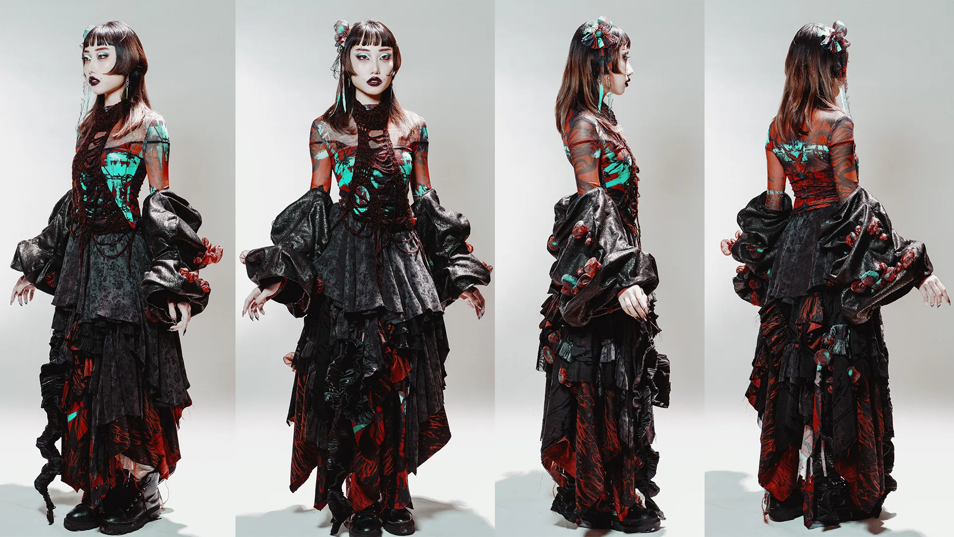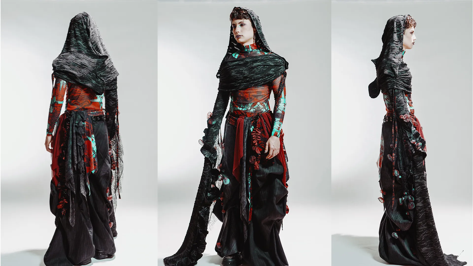 1RRAD1AT3D: is a collection set in a post–nuclear winter landscape, exploring the aftermath of human conflict through fashion as storytelling. Each couture piece reflects the physical and psychological scars of radiation on human, animal, and plant life, transforming garments into performance art.