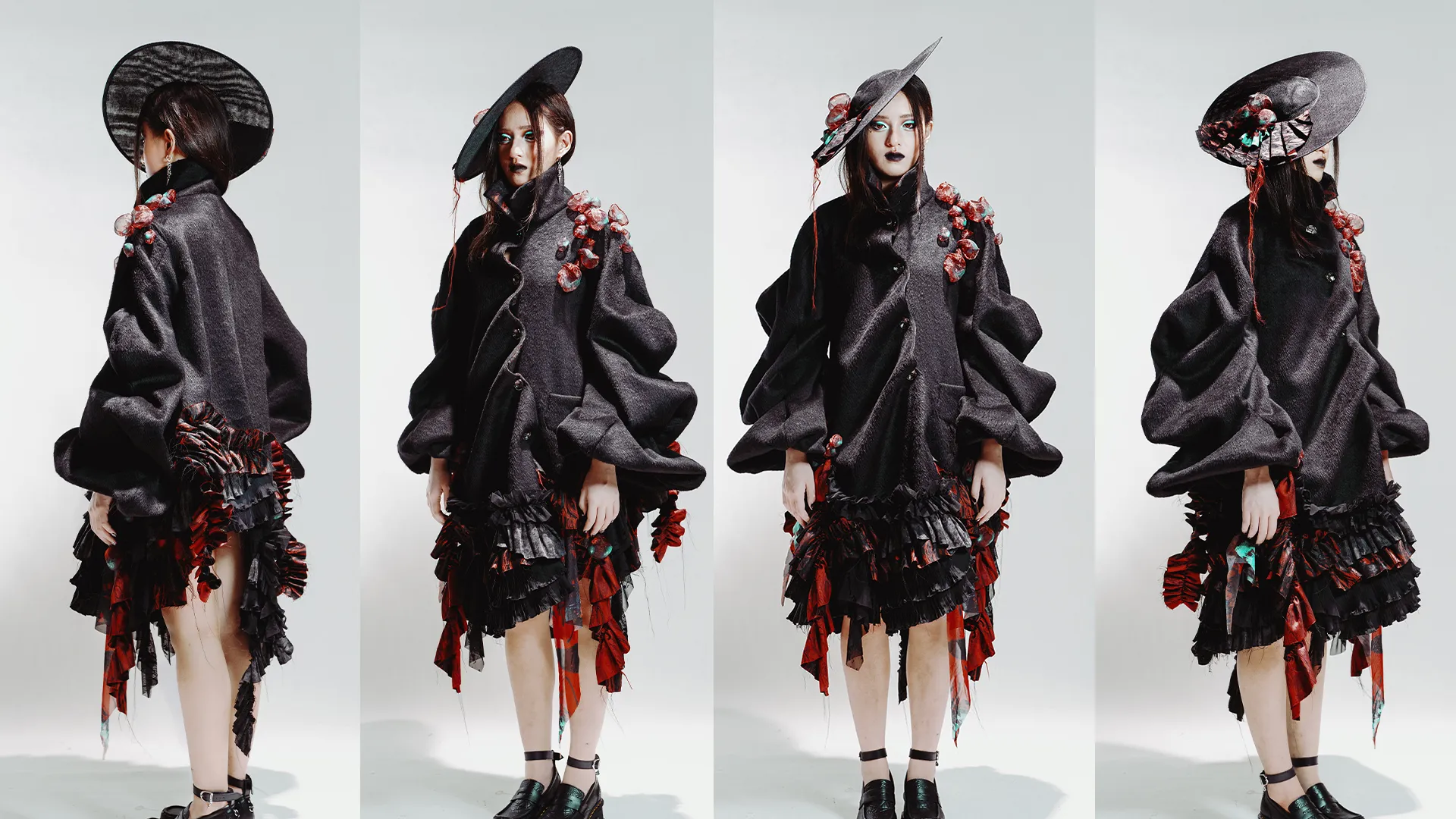 Exaggerated silhouettes, distressed textures, and transformative materials evoke mutation, decay, and survival. Developed through a fusion of traditional craftsmanship and digital pattern cutting in CLO3D, the work incorporates intricate embellishment and hand-sewn couture techniques. The collection serves as both a warning against nuclear and chemical warfare and an ode to human resilience in the face of self-destruction.