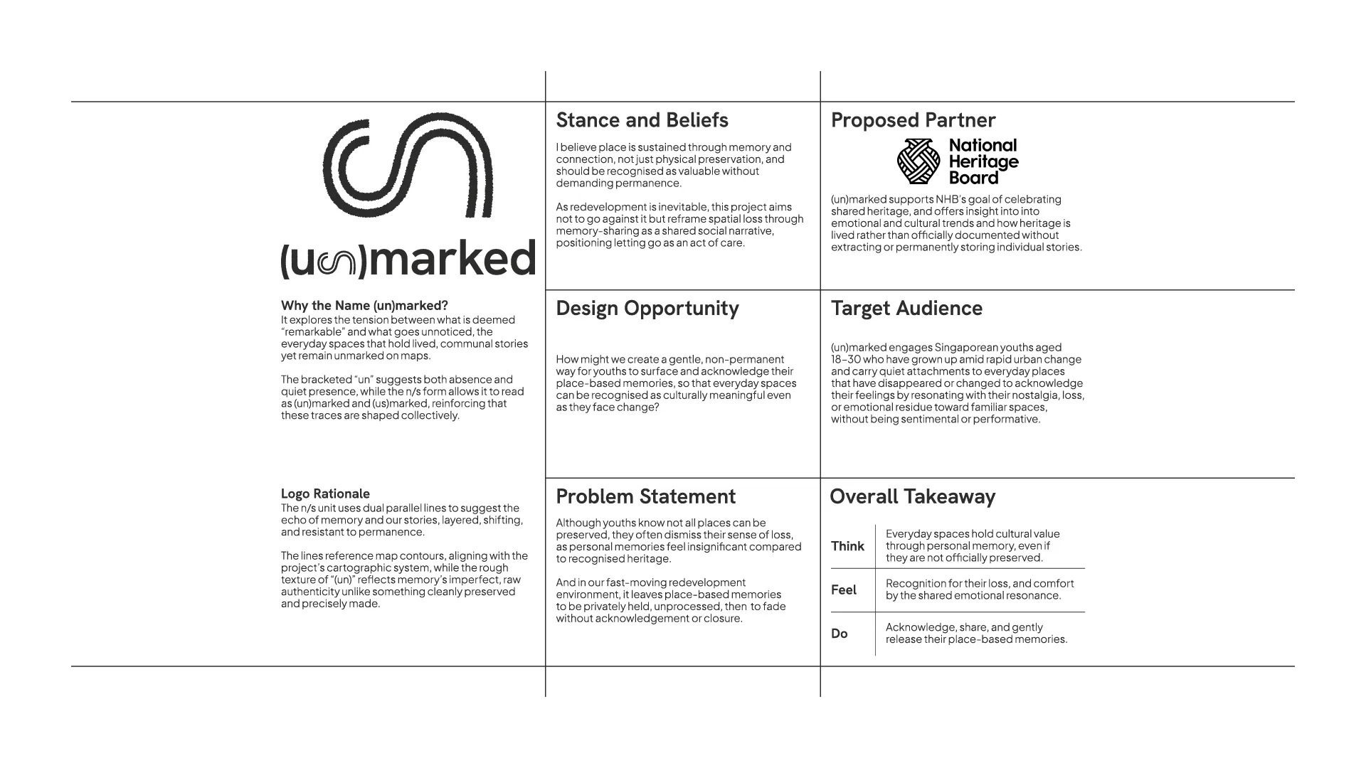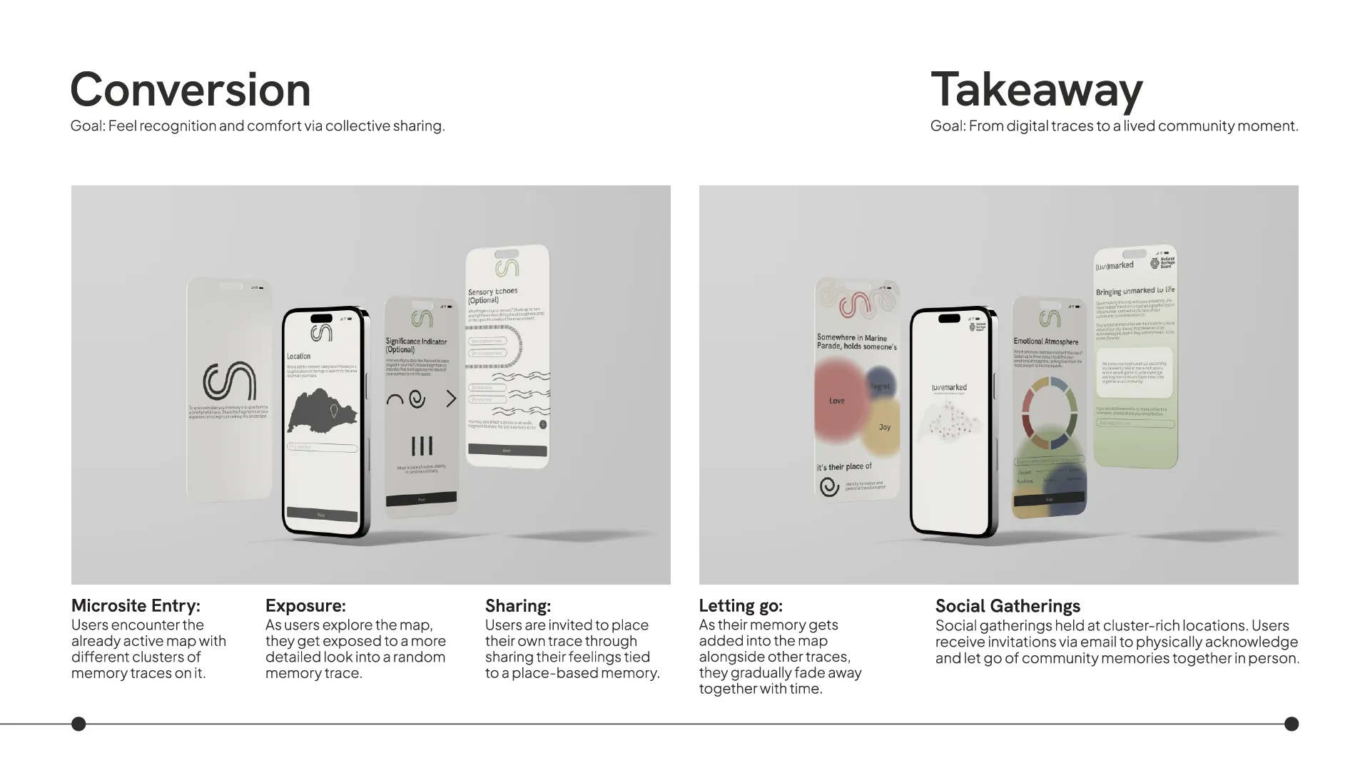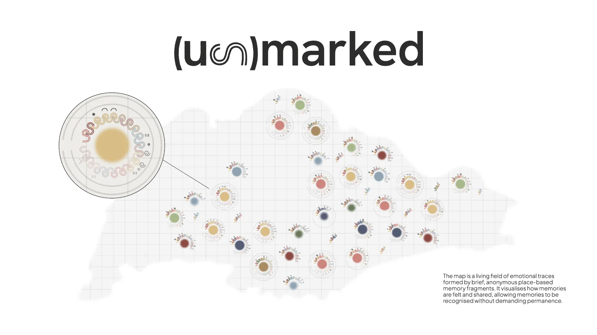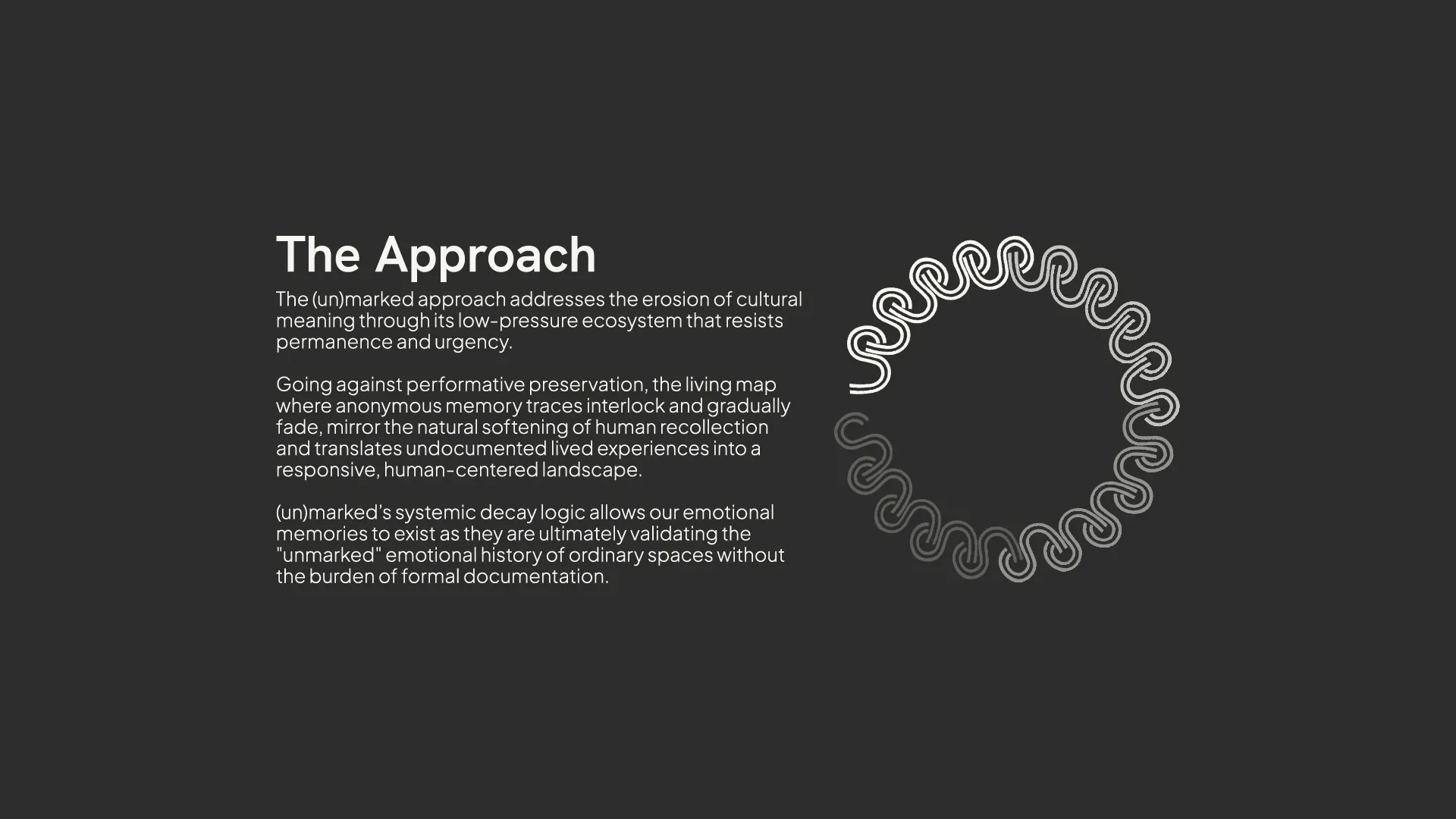 (un)marked is a campaign centred on a reflective digital platform that creates conditions for place-based memories to be briefly held, shared, and gently let go of. Rather than preserving memories permanently, the platform temporarily gathers small memory fragments into an evolving mapping system that acknowledges their significance before they fade. In doing so, it reveals how time and development reshape our patterns of attachment to space. The focus shifts away from documentation towards recognition, acknowledgement, and acceptance.