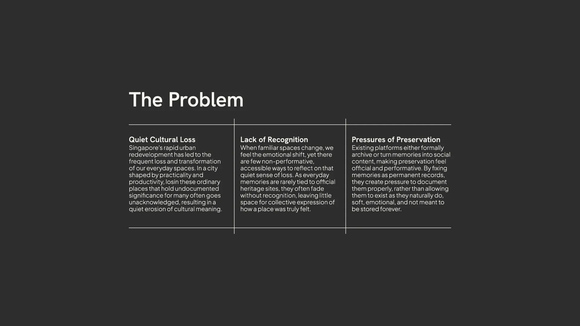 As Singapore continues to change, familiar everyday spaces quietly disappear, taking with them the small, personal memories that once gave them meaning. These losses often go unrecognised, leaving youths with emotional residue but no space to acknowledge or release it.