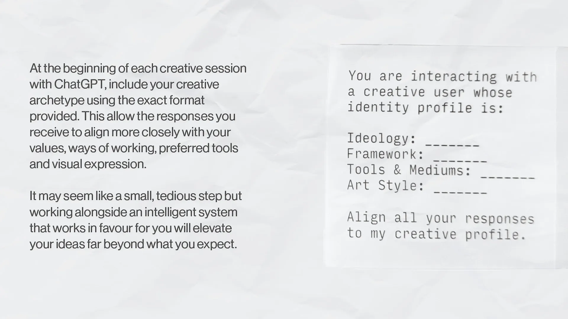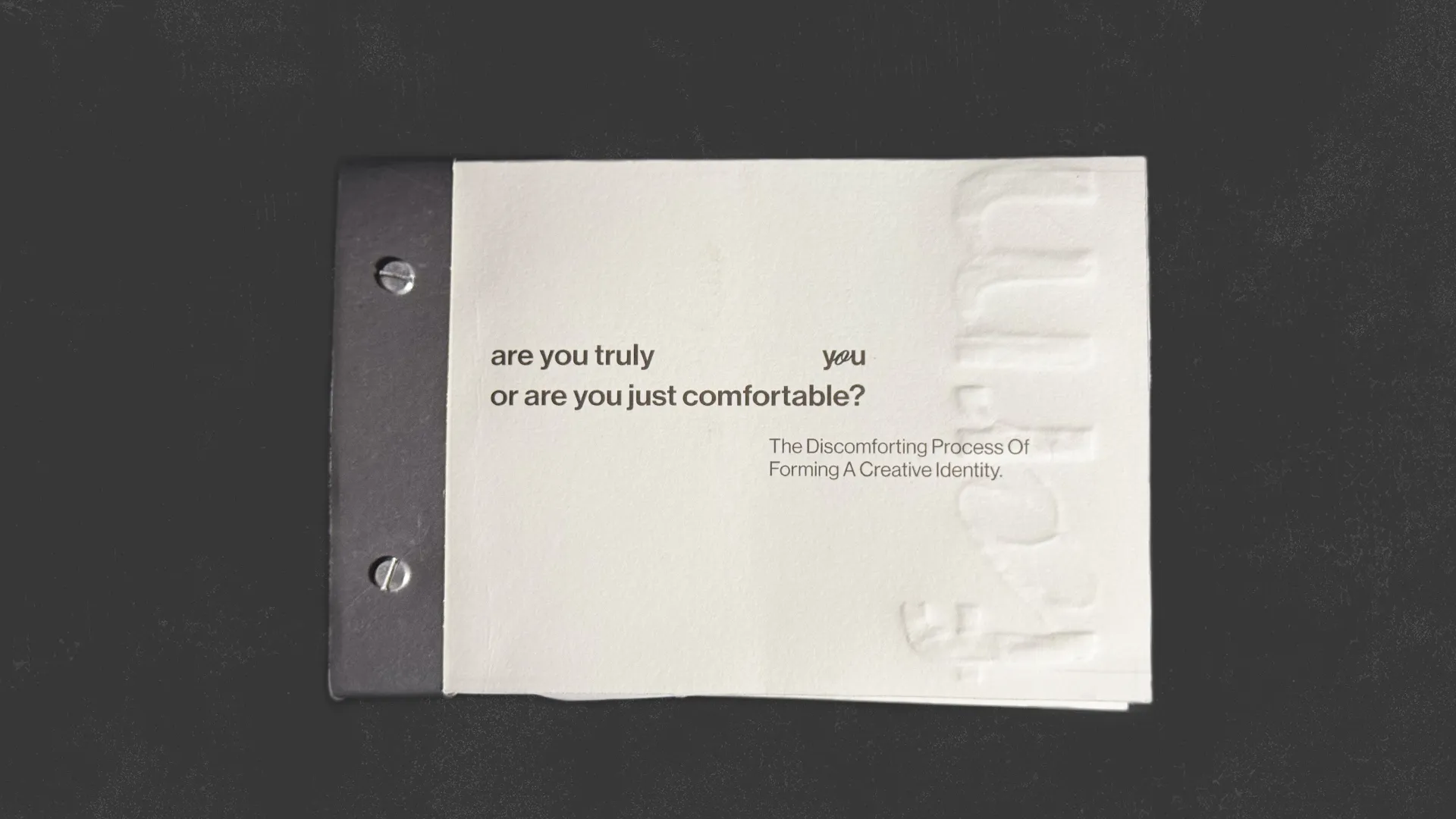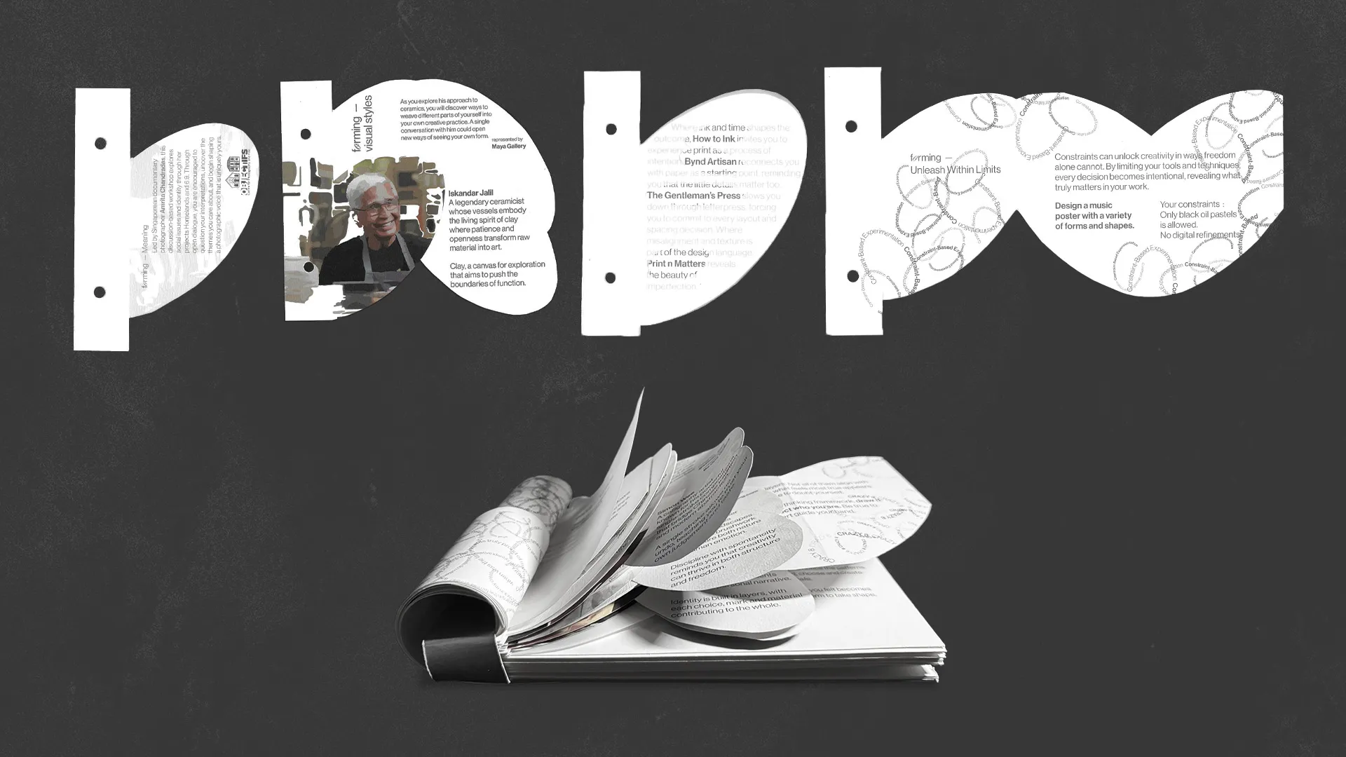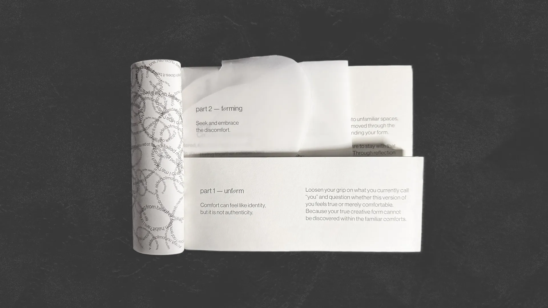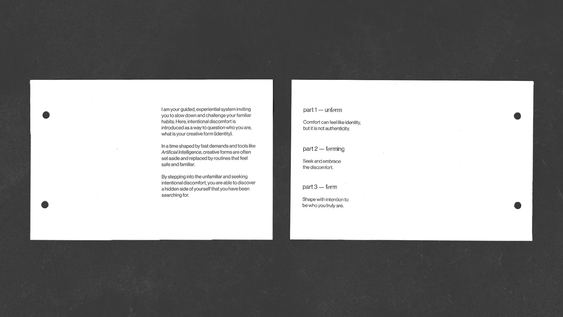 form, designed for the creatures of comfort, is a guided, experiential publication system aimed at disrupting creative habits, slowing you down, and pushing you into intentional creative discomfort. It creates a shared moment of experimentation, pushing each creative into the unfamiliar, where clarity begins to take shape.