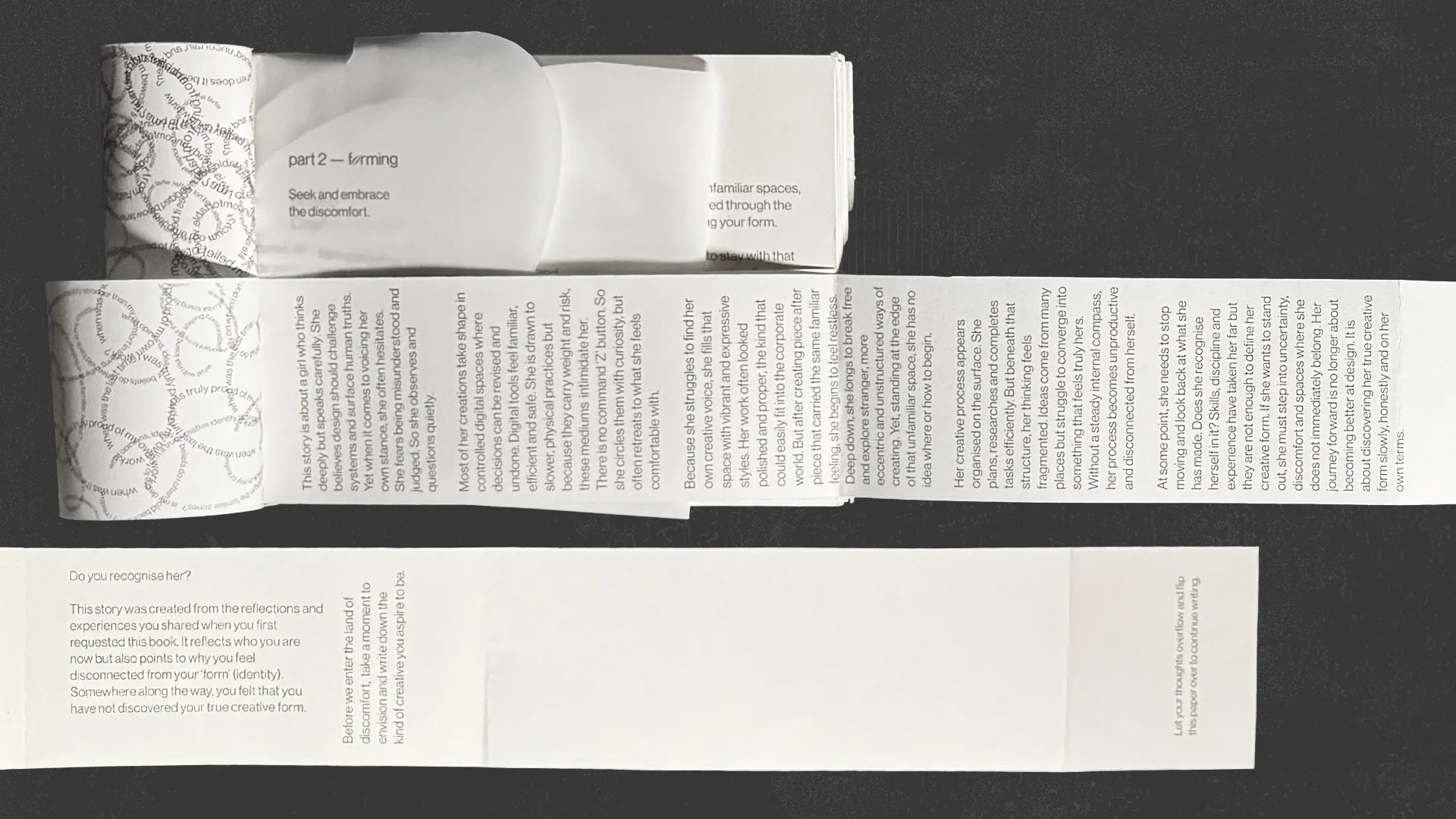 Hands recovering from fine paper cuts. Ears carrying the weight of criticism. A curved posture facing a screen that warns of yet another software crash. Yet she returns to design despite it all. Because it makes her feel human.