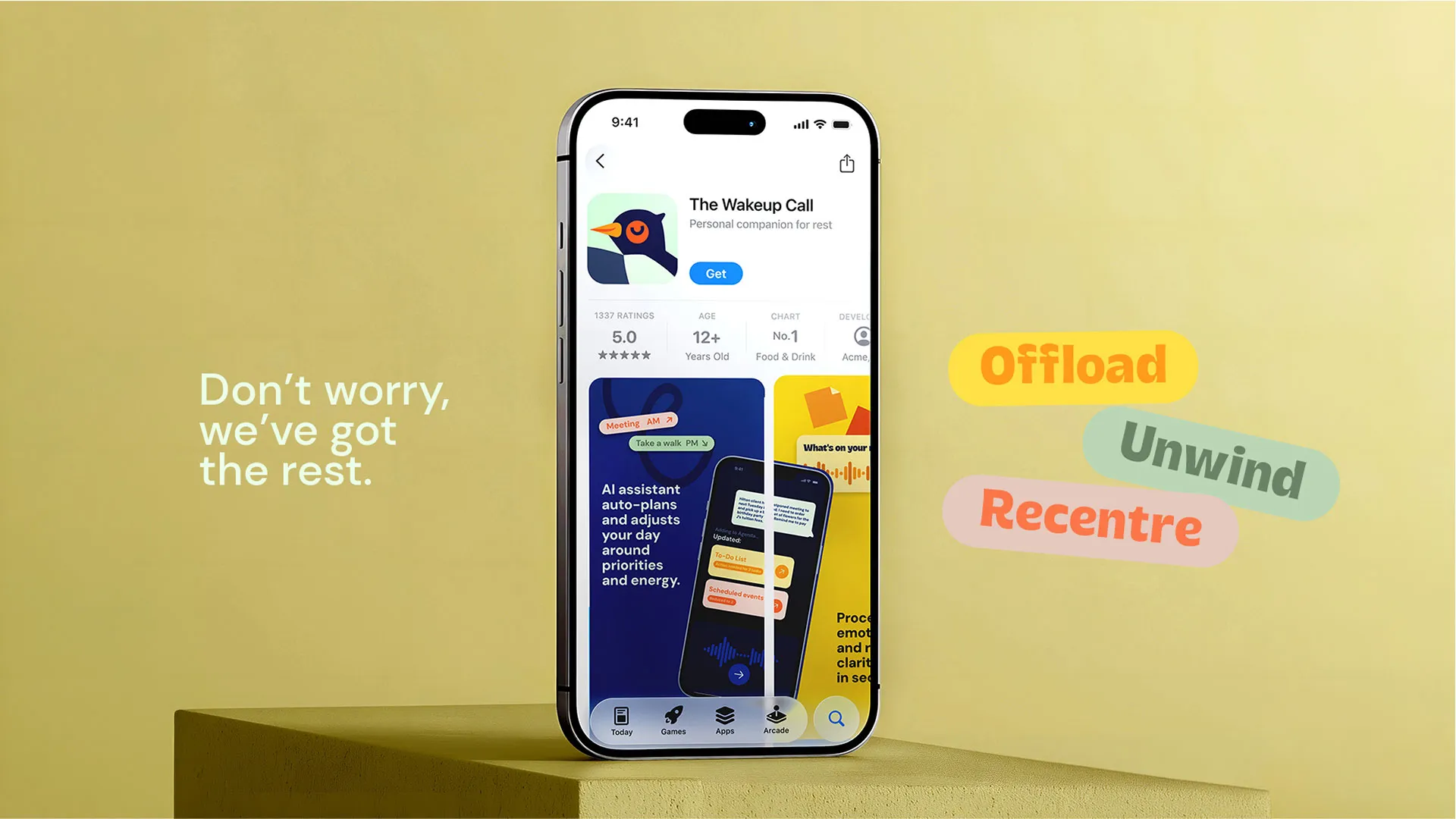 The Wakeup Call breaks the cycle of restless nights and paves the way toward better mornings. Designed to help users offload mental clutter and shed the day’s weight, our app creates restorative moments that recentre the mind for clarity and balance. We cultivate a healthier relationship with rest and provide the peace users need to sleep well, wake refreshed, and own the day.