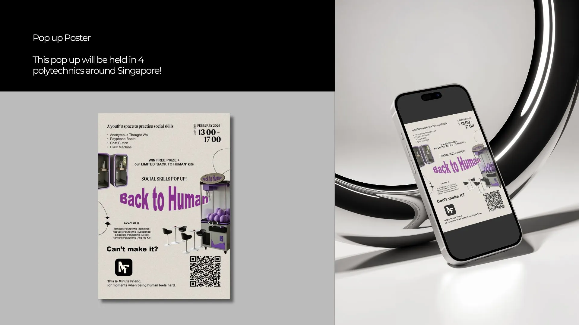Back to Human is the core activation of The Social Skills Reboot, designed to help young adults reconnect with real-life interaction in an AI-saturated world. Through interactive pop-ups across Singapore polytechnics, the campaign guides participants through three experiential zones: anonymous self-expression, low-pressure phone conversations, and fast-paced face-to-face dialogue challenges. Each stage gradually rebuilds confidence, emotional awareness, and conversational resilience. By replacing passive digital dependence with active human practice, Back to Human transforms social anxiety into shared experience. The campaign ultimately encourages youth to reclaim communication as a human skill, not something outsourced to AI, but strengthened through real connection.