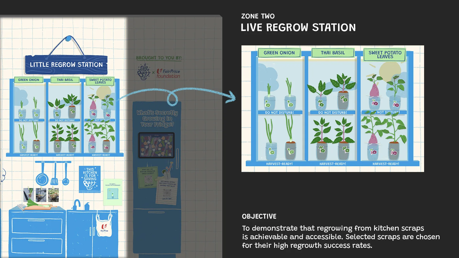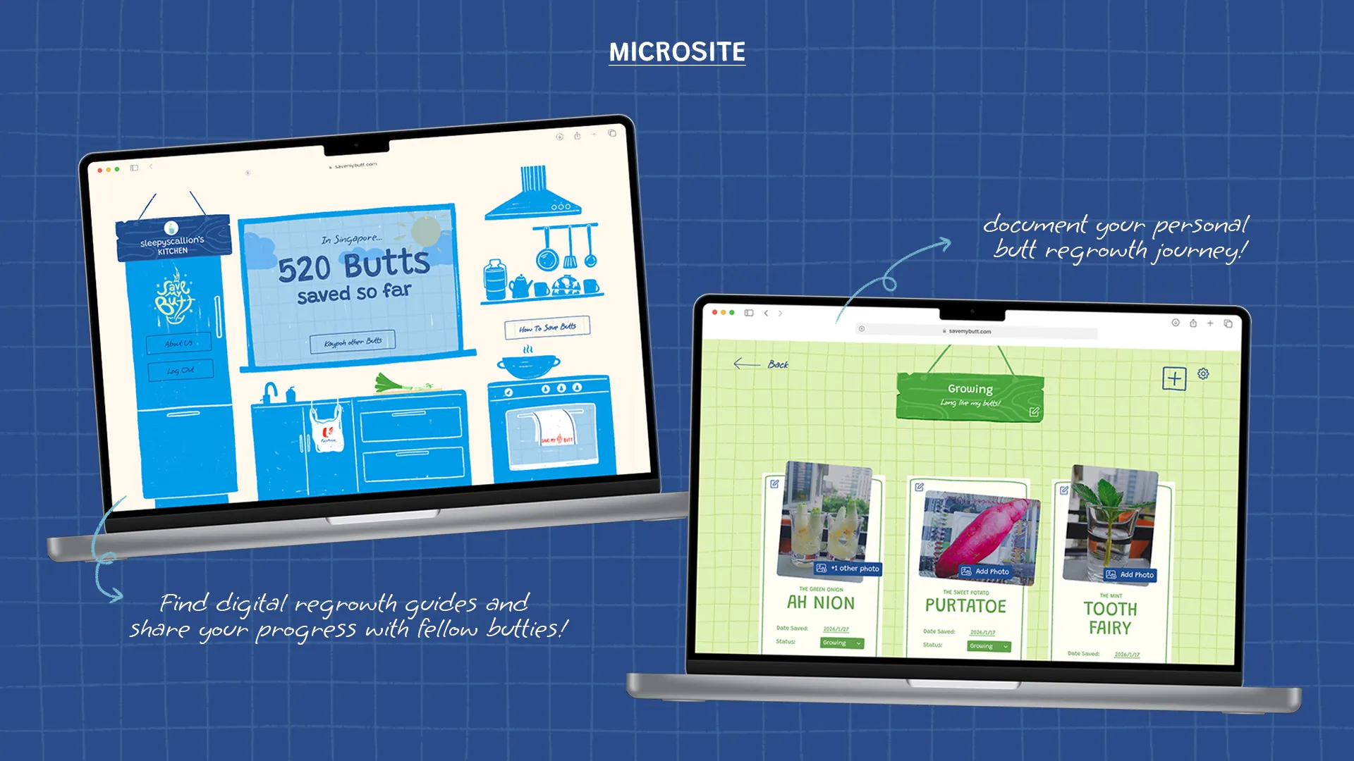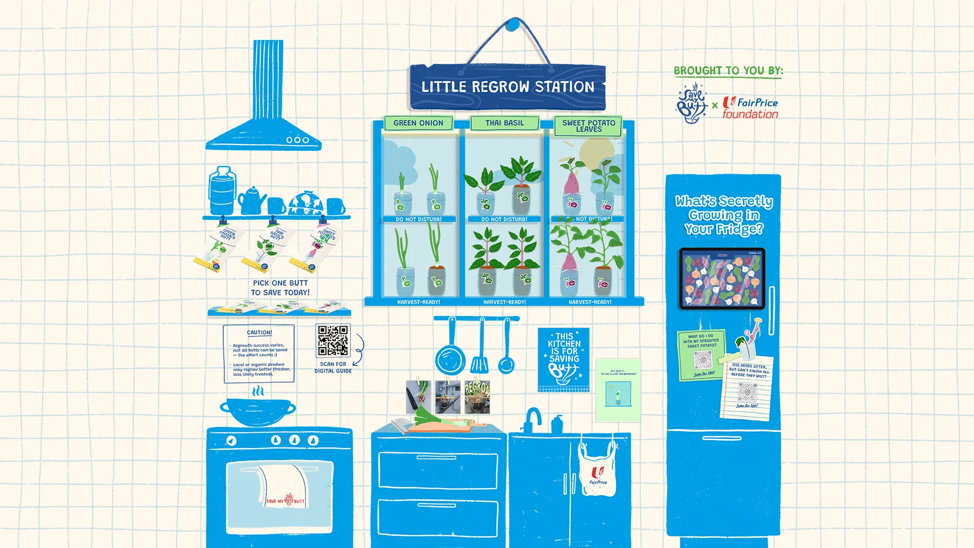 Save My Butt! invites Singaporeans—starting with home cooks—to rethink food through kitchen scrap gardening. By transforming everyday “waste” into an easy, playful growing process, this project offers an accessible entry point into a more sustainable local food system.