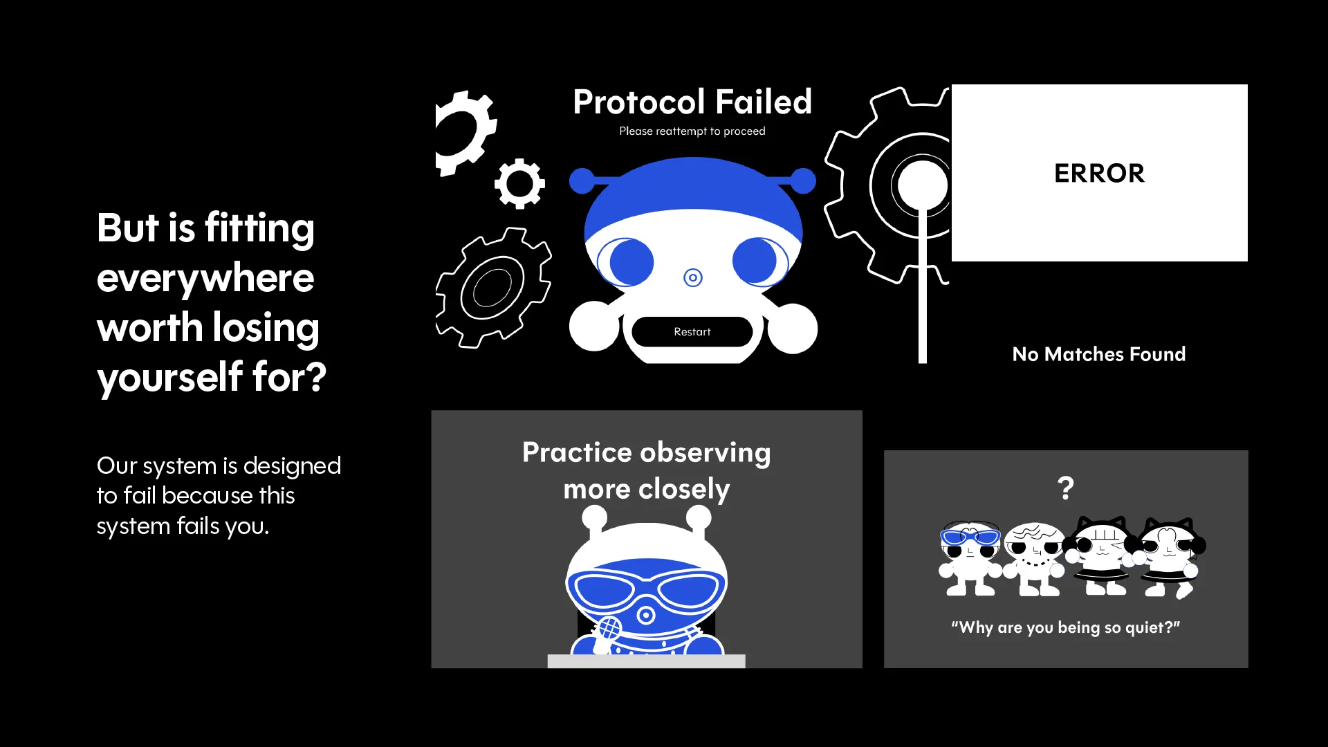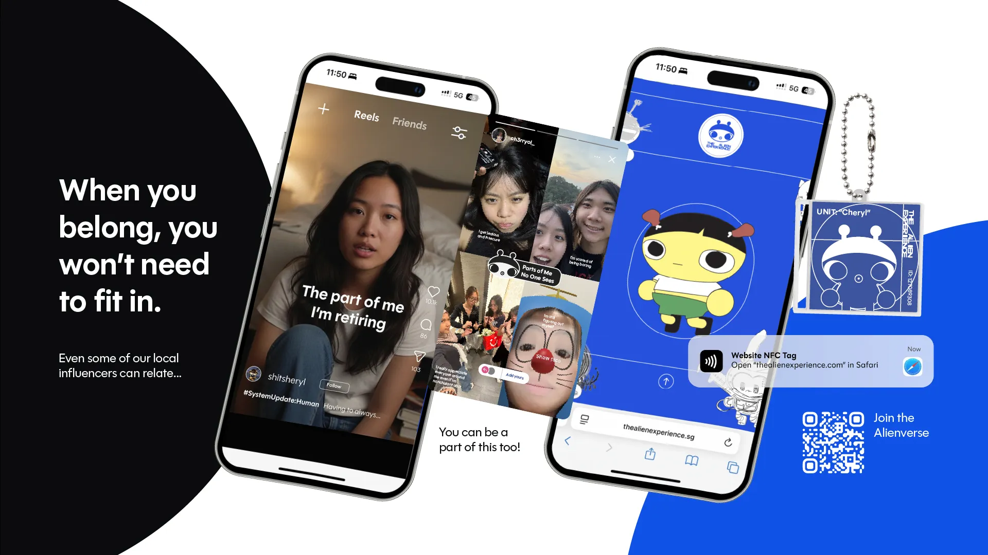 THE ALIEN EXPERIENCE is a satire campaign of the flawed systems around us that promise belonging at the cost of changing ourselves to be accepted. It embodies an institutional, solution-oriented tone in its pop-up experience and social media presence, enabling participants to feel the emotional dissonance between conformity and authentic connection. Ultimately, allowing them to come to the realisation on their own that belonging can never be achieved just by being liked, but rather by being known.