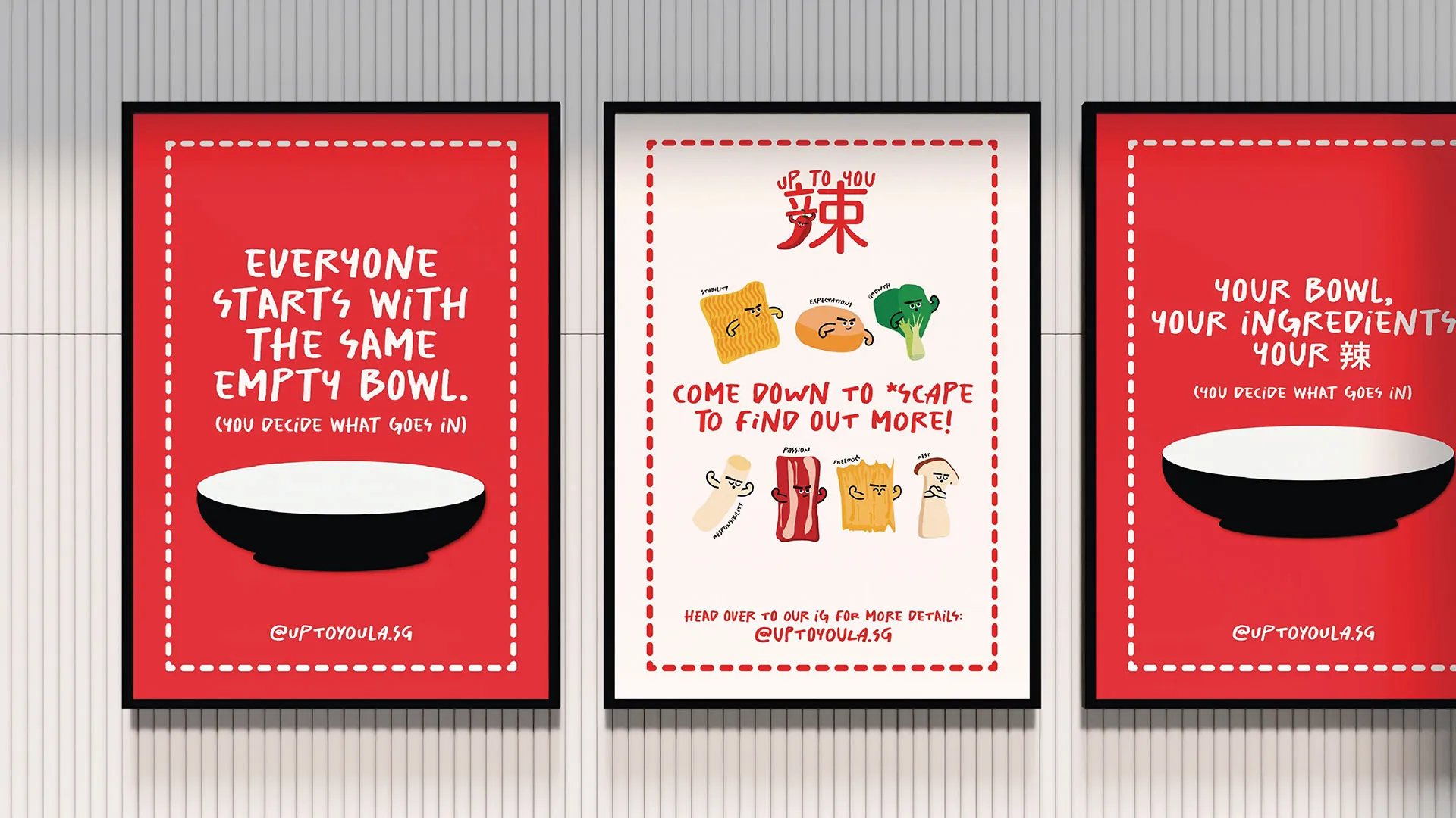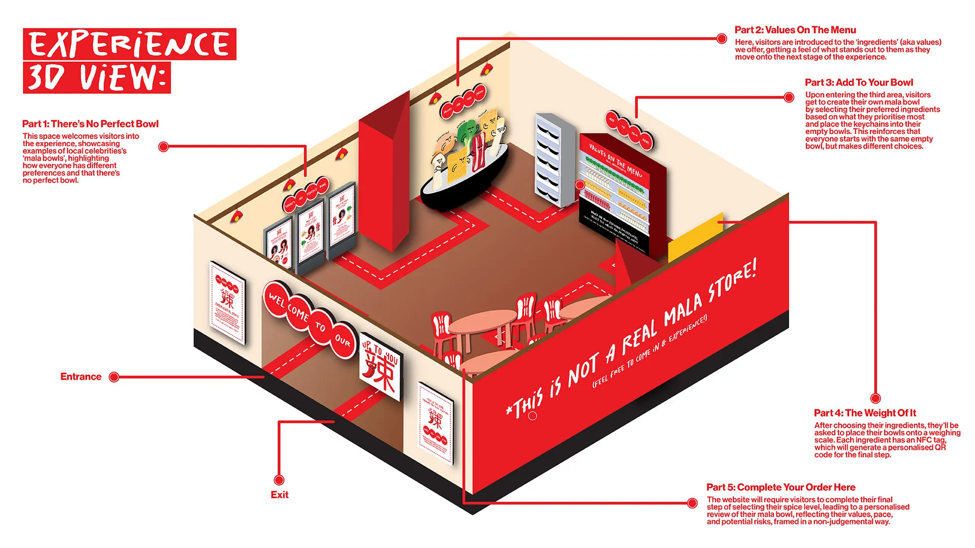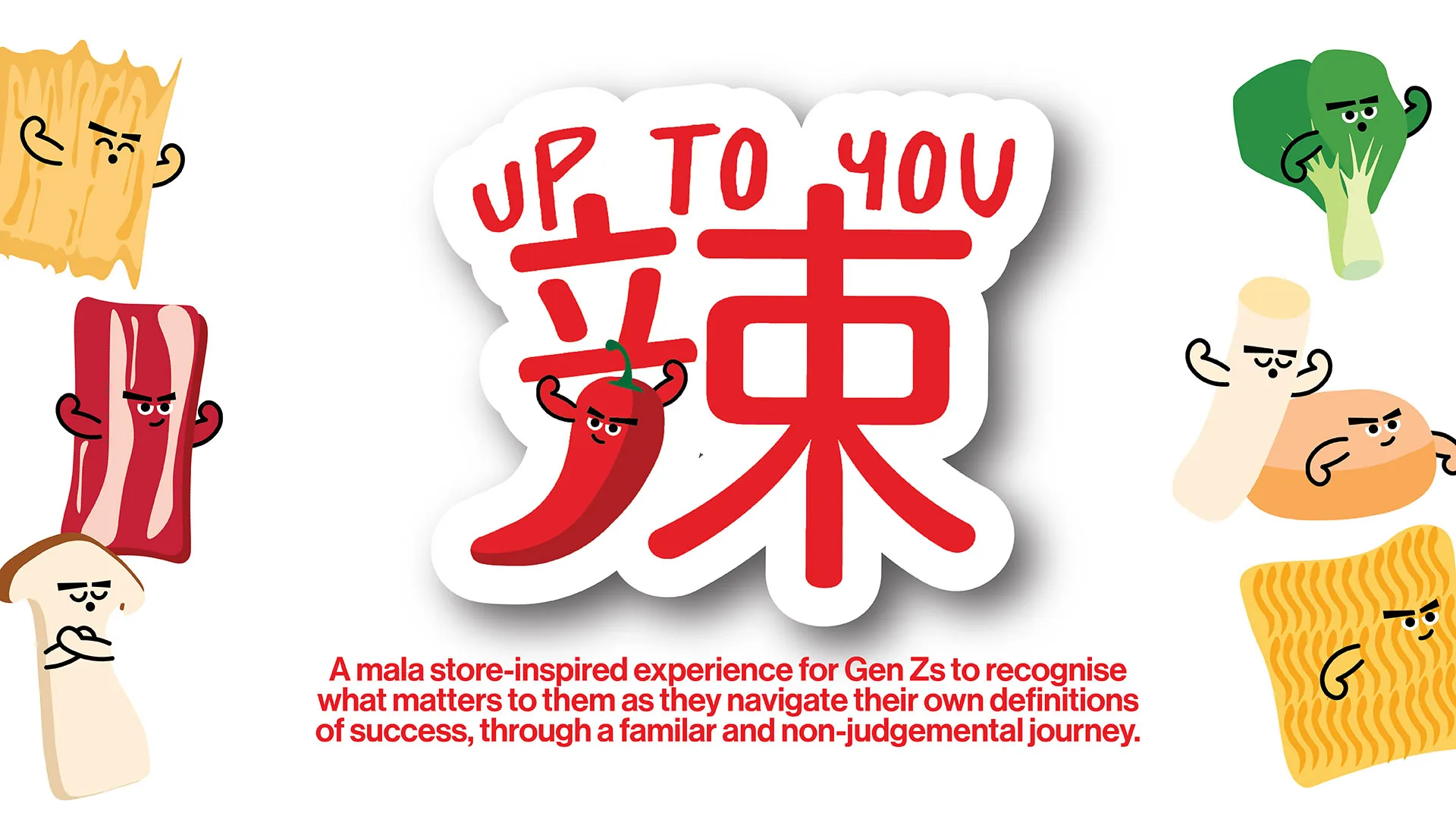 UP TO YOU 辣 is a mala-store-inspired immersive experience that challenges the idea that success follows a single, fixed formula. In a society where Gen Zs are constantly pressured to compare and keep up, my project encourages Gen Zs to reflect on what truly matters to them, their values, preferred pace, and personal capacity. Through familiar elements such as choosing ingredients, adjusting spice levels, and carrying the weight of one’s bowl, UP TO YOU 辣's experience translates abstract ideas of success into something tangible and relatable. By allowing participants to build their own “mala bowl", the project reassures Gen Zs that there is no perfect path to success, only one that suits them.