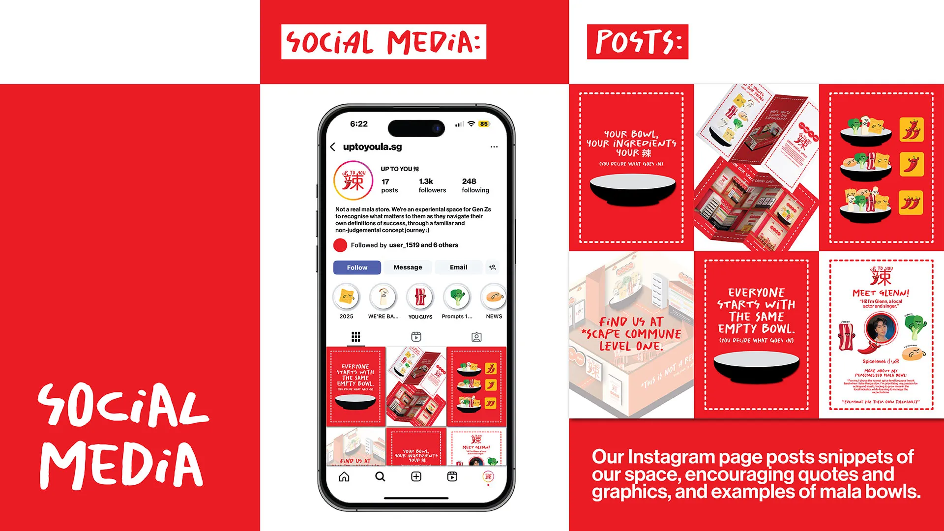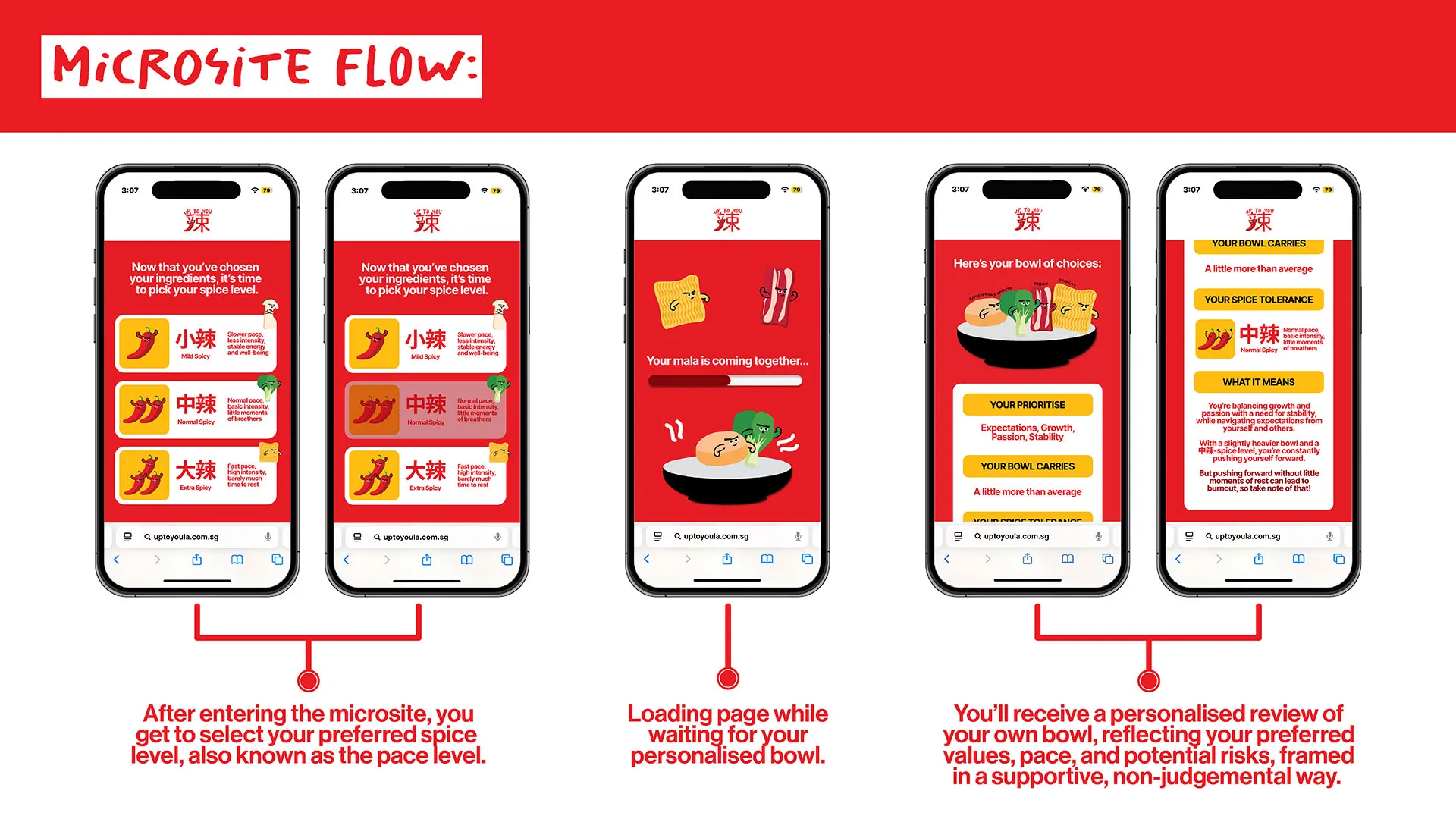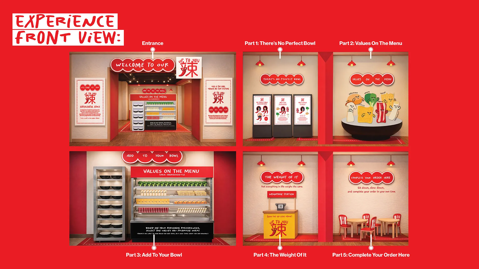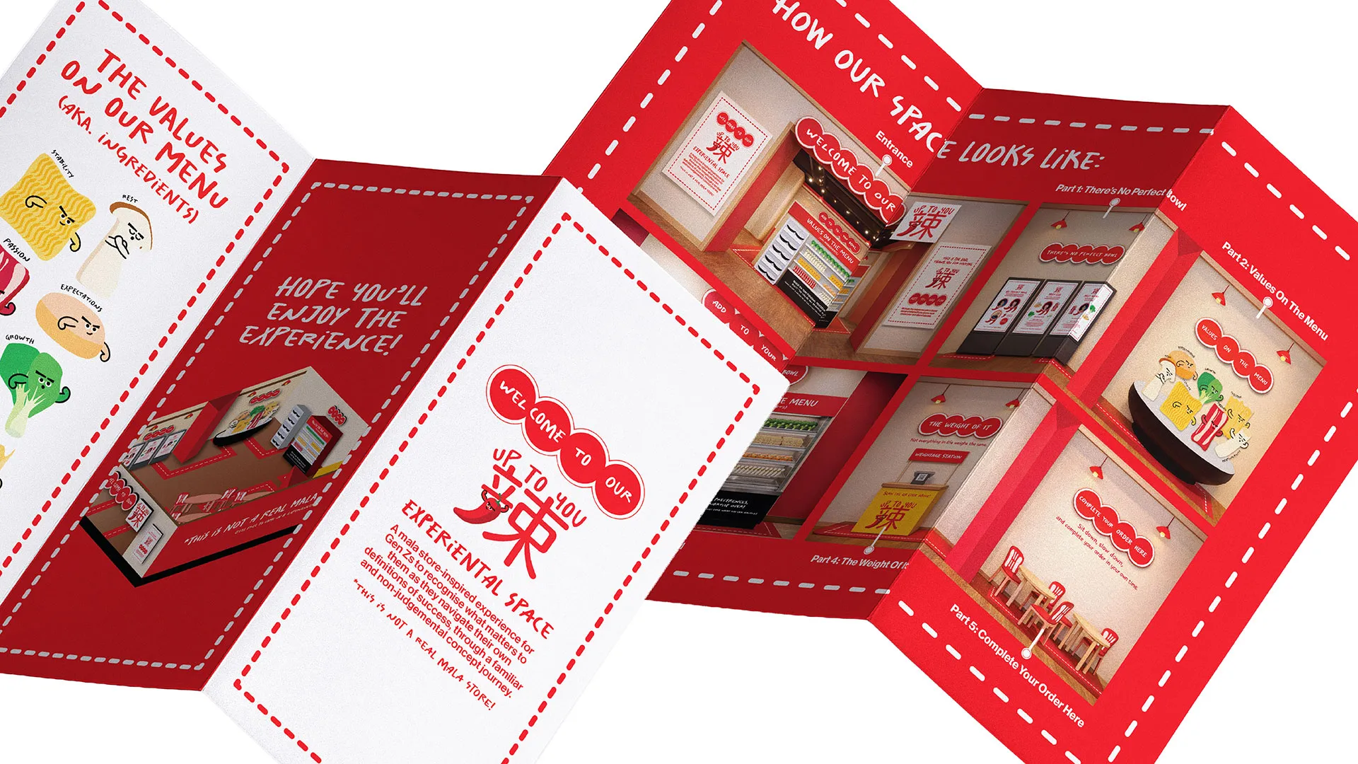 UP TO YOU 辣 is a mala-store-inspired immersive experience that challenges the idea that success follows a single, fixed formula. In a society where Gen Zs are constantly pressured to compare and keep up, my project encourages Gen Zs to reflect on what truly matters to them, their values, preferred pace, and personal capacity. Through familiar elements such as choosing ingredients, adjusting spice levels, and carrying the weight of one’s bowl, UP TO YOU 辣's experience translates abstract ideas of success into something tangible and relatable. By allowing participants to build their own “mala bowl", the project reassures Gen Zs that there is no perfect path to success, only one that suits them.