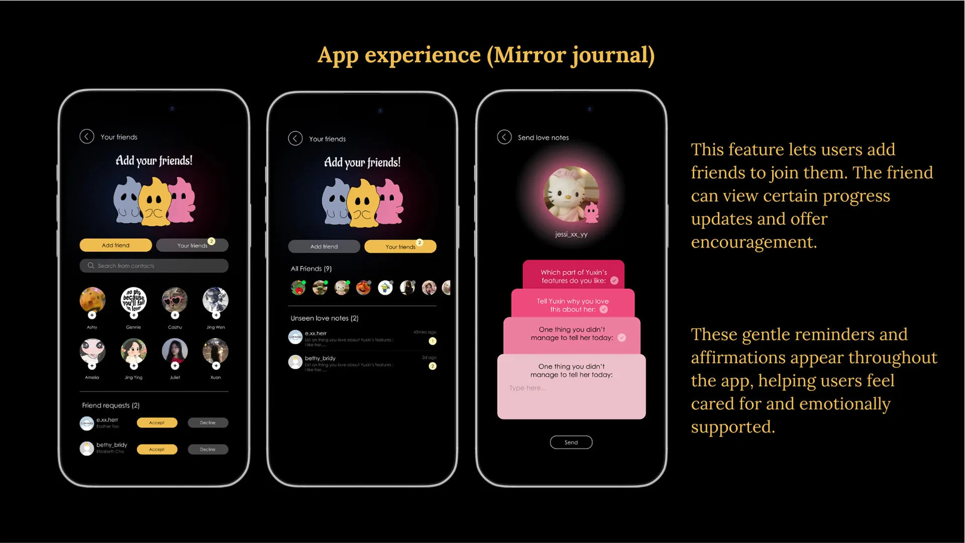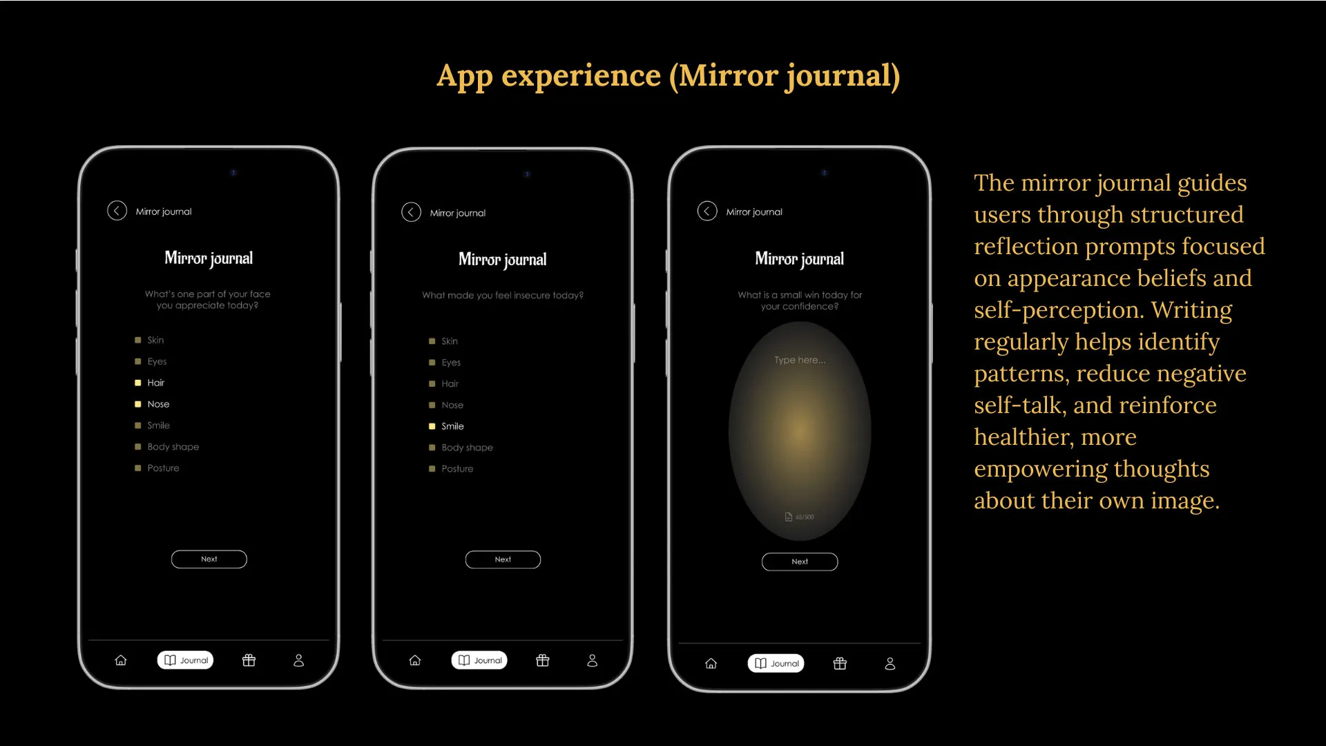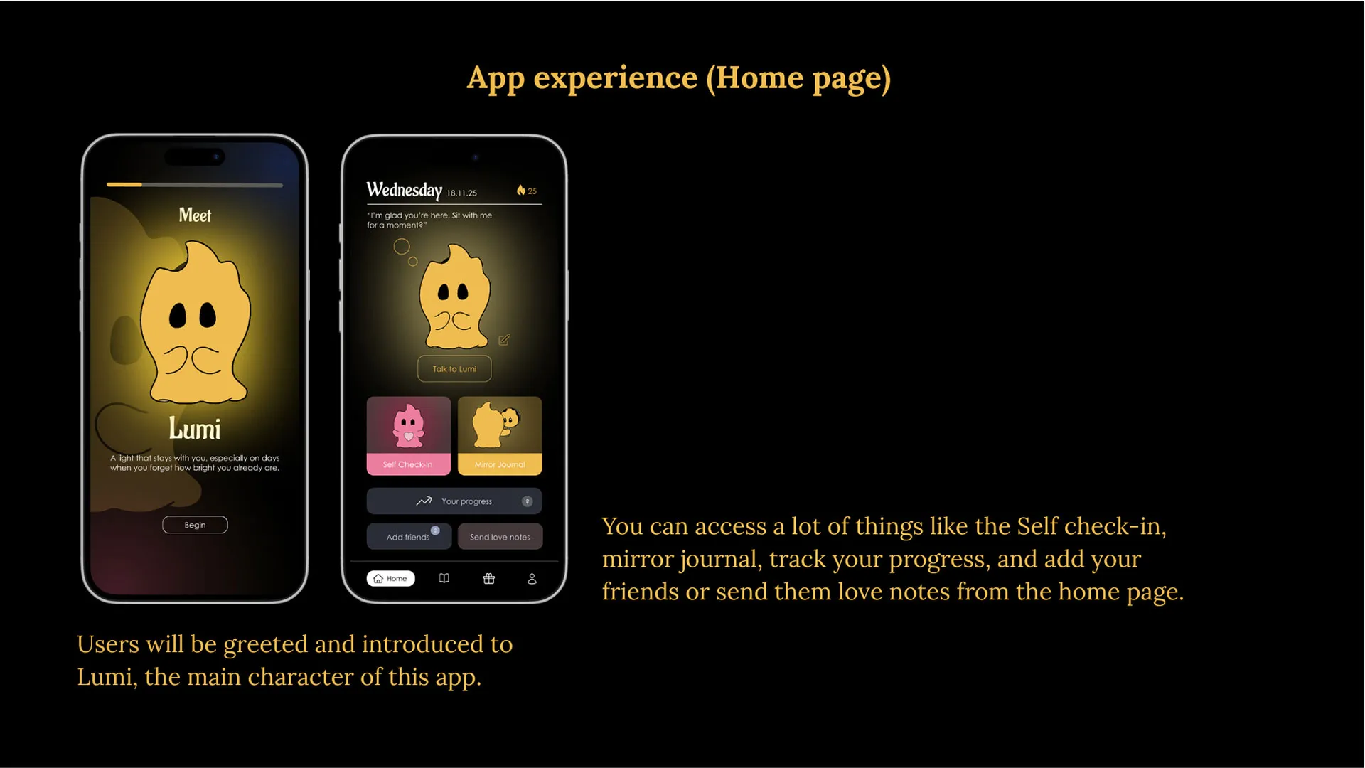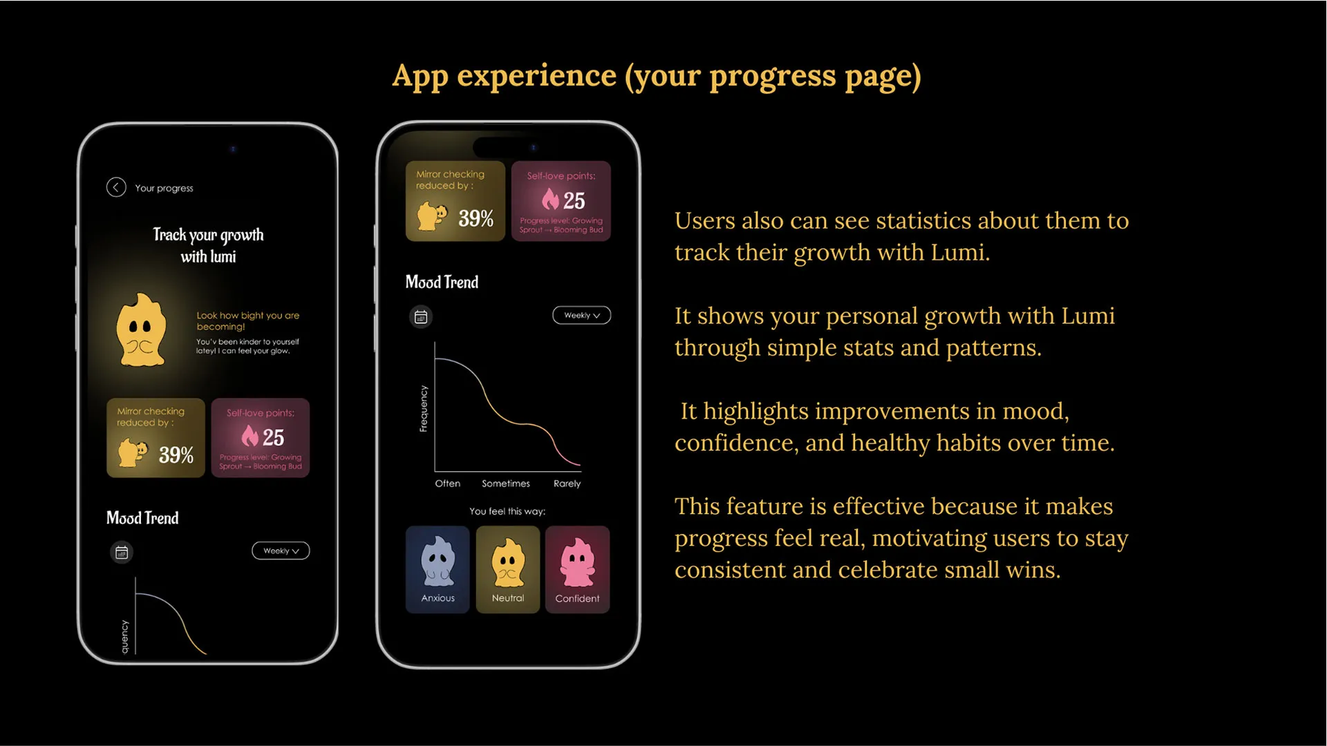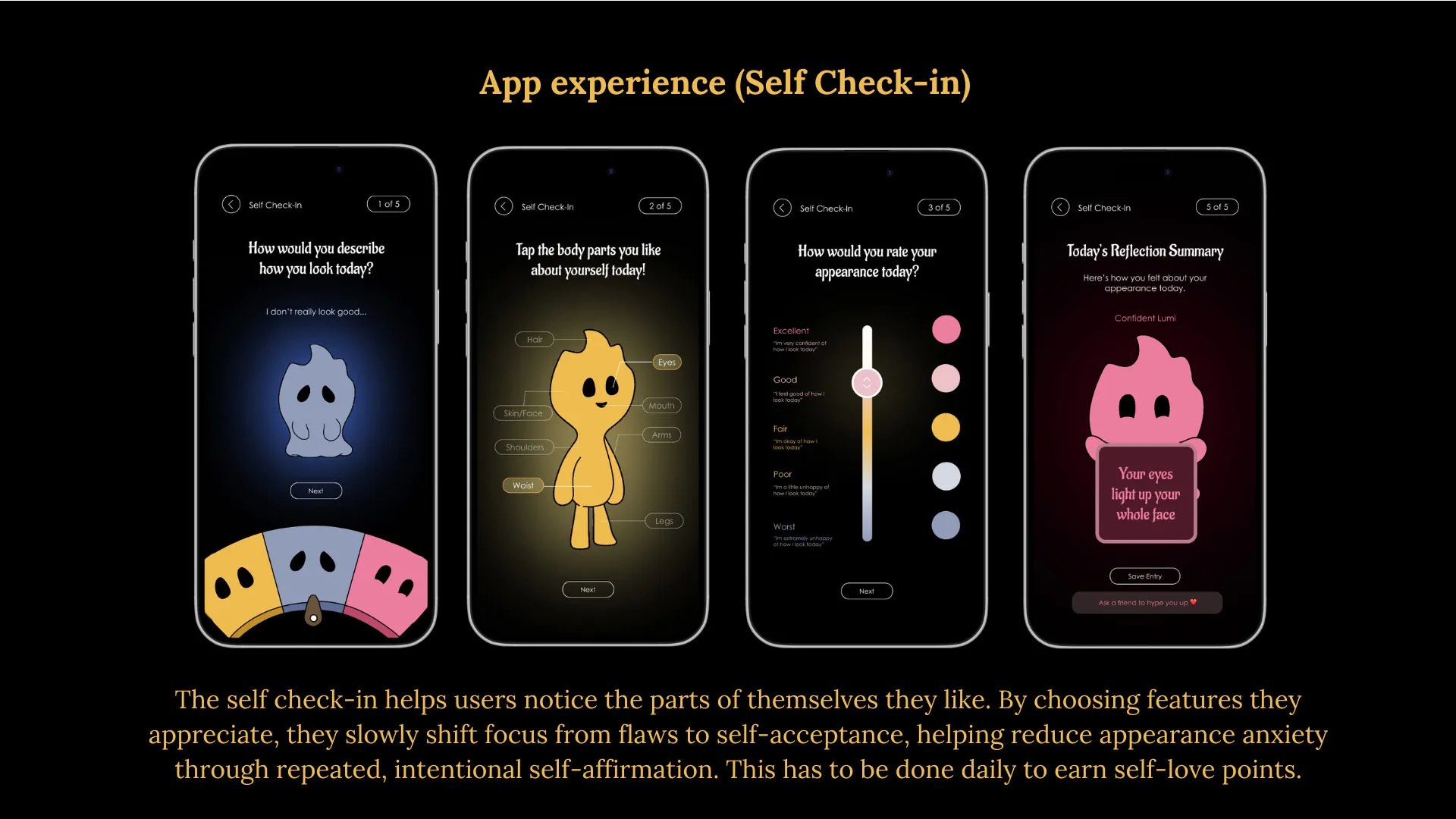 Through simple daily check-ins, affirmations, and reflection activities, Lumi encourages users to notice the parts of themselves they like, even on difficult days. The app grows with the user, reminding them that their worth is not decided by mirrors, likes, or other people.