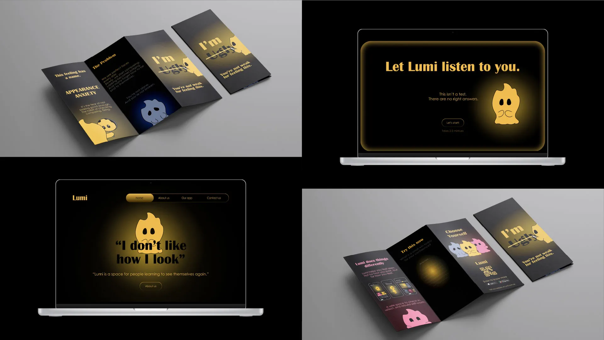 Hi, I am Yuxin, a design student who believes design should feel human before it feels impressive. I’m interested in emotions, identity, and how visual storytelling can create safe spaces for conversations people are usually afraid to have. Through this project on appearance anxiety, inspired by my own experiences and the people around me, I focused on empathy, simplicity, and honesty. Instead of trying to “fix” insecurities, I designed Lumi to gently shift perspectives and encourage kinder self-talk. For me, good design is not about perfection. It’s about reflection, understanding, and connection.