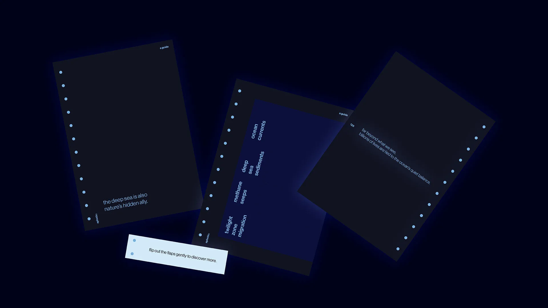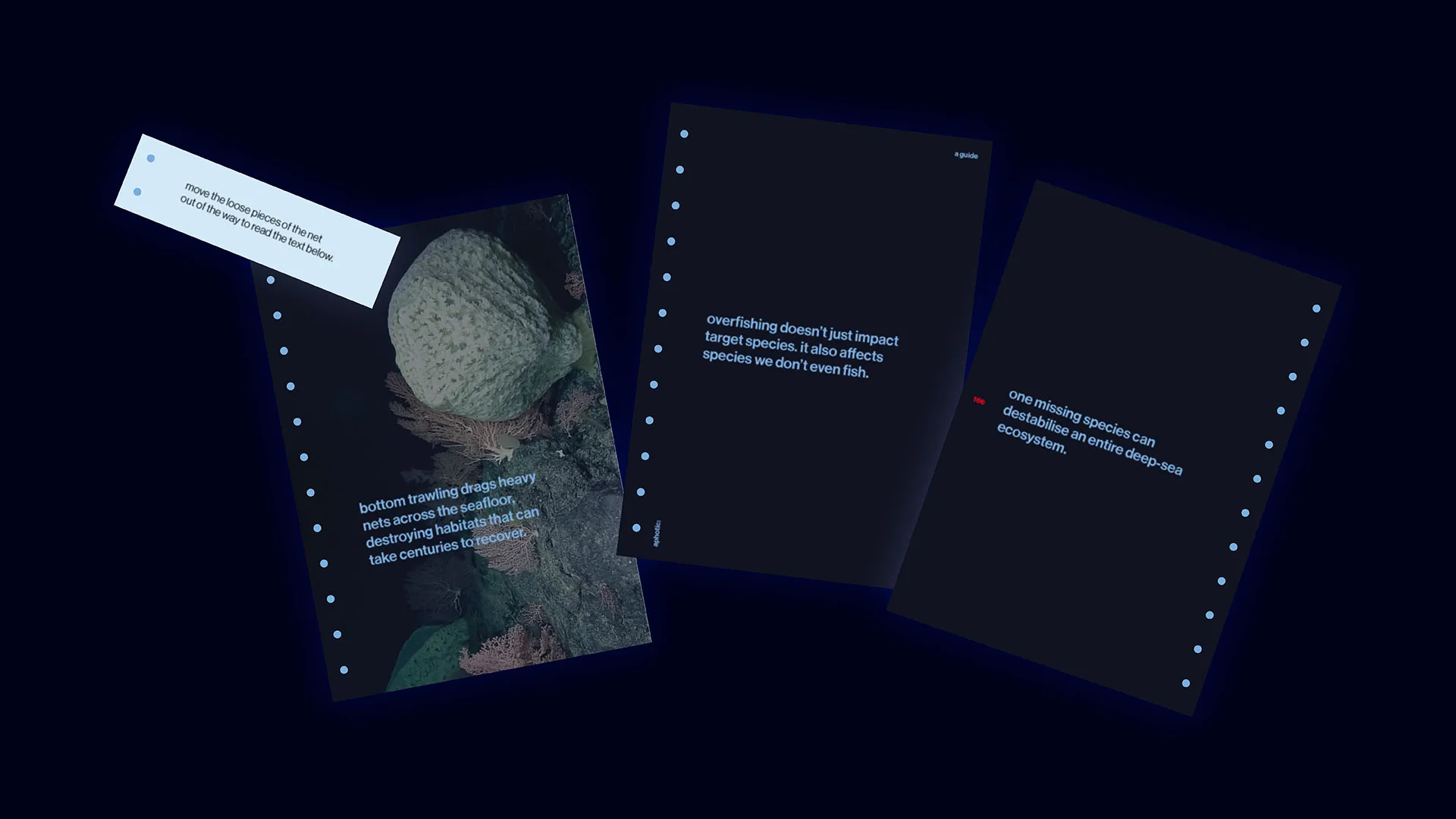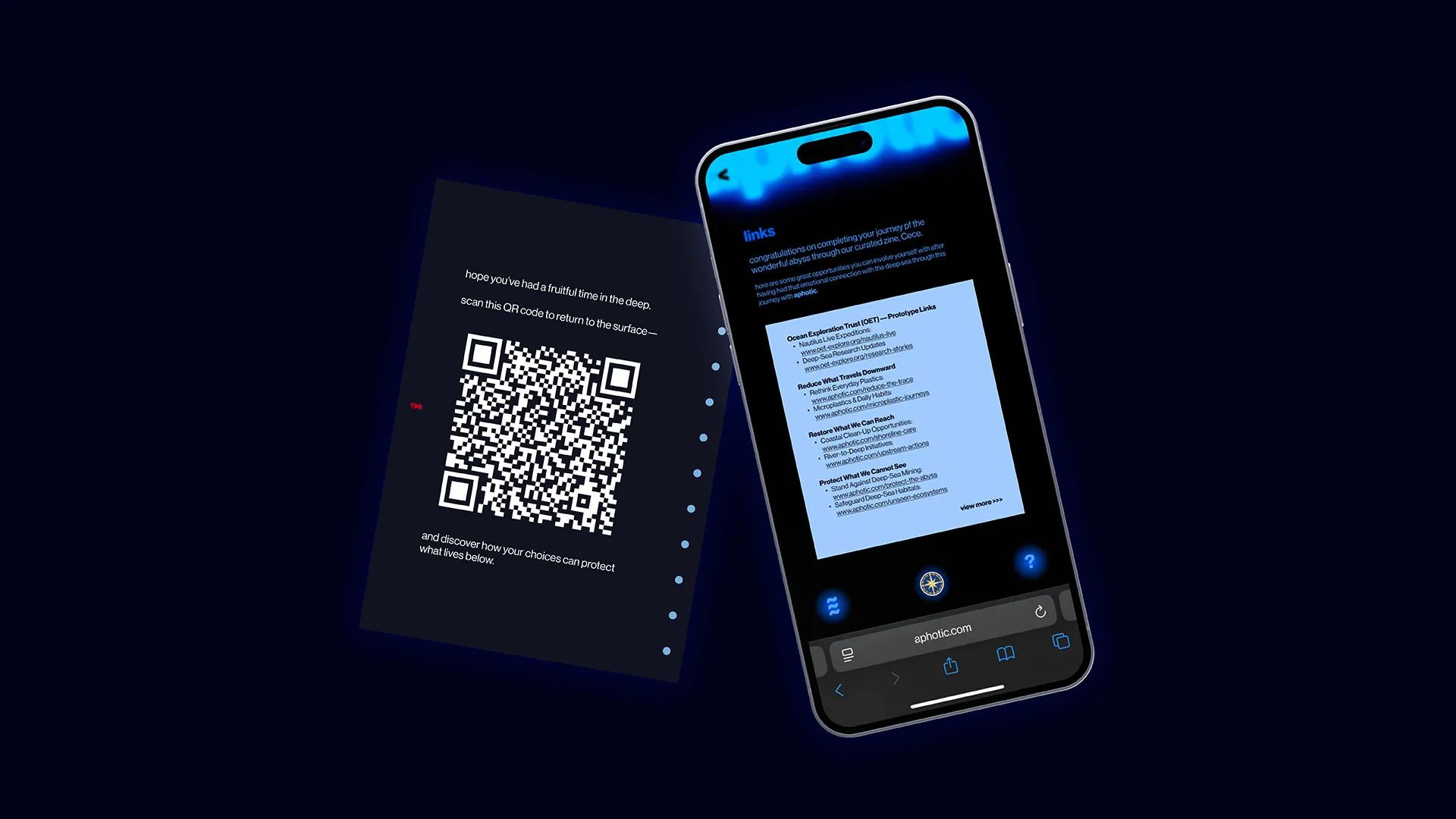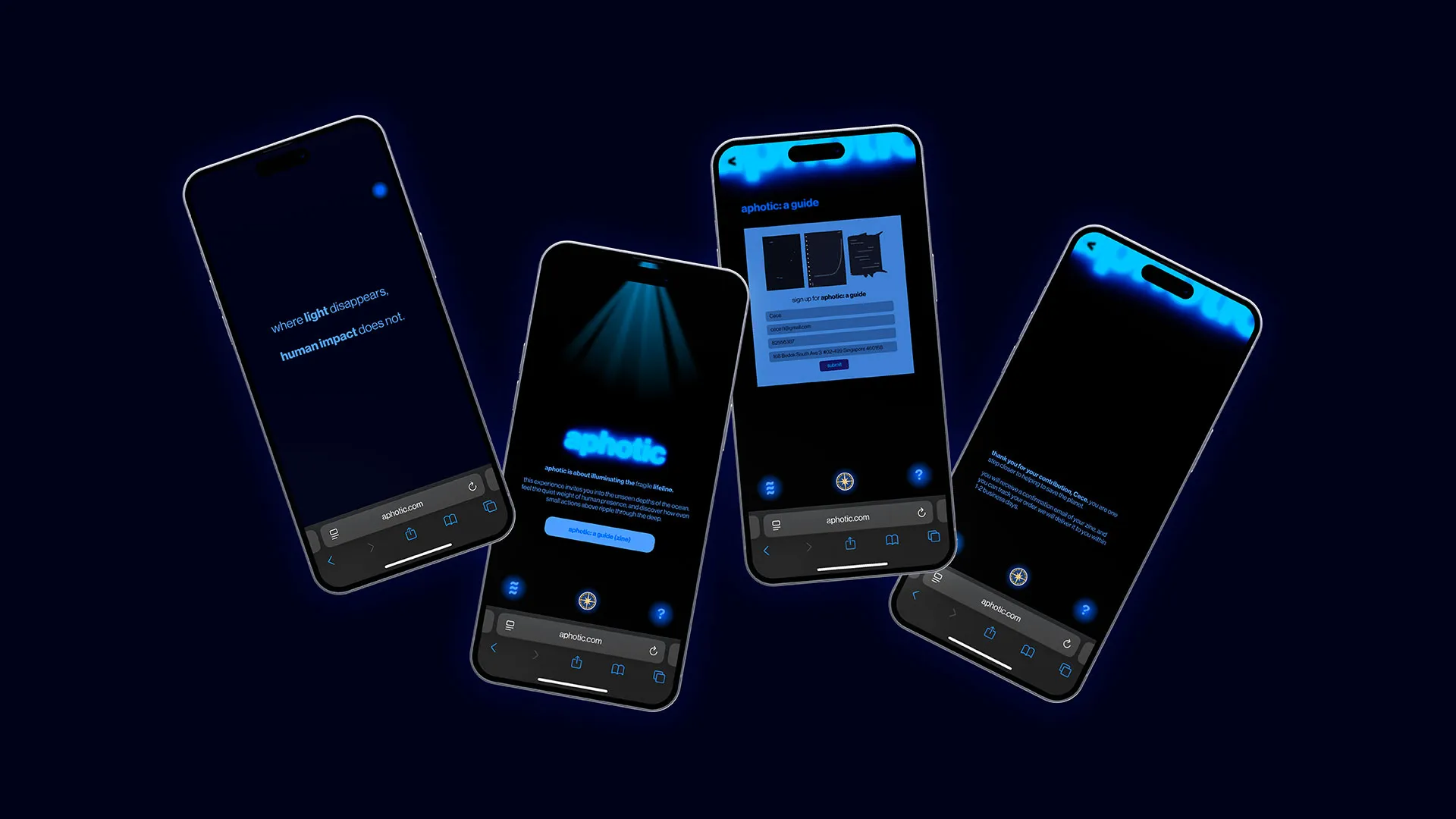 Through gentle illumination, aphotic explores the fragile lifeline, revealing the beauty of deep-sea life while acknowledging a harder truth: human actions at the surface travel far below. By making the invisible visible, this project invites reflection, care, and a deeper awareness of how closely our lives are connected to a world we rarely see.