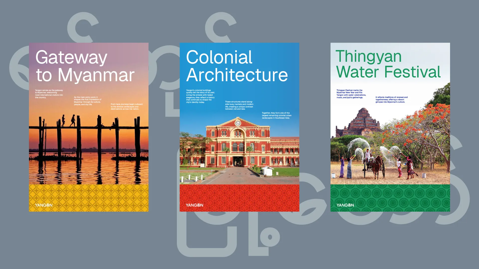 The City of Yangon is an attempt to rediscover Yangon by looking beyond its monuments and political narratives, and instead focusing on the everyday life that continues to shape the city. Through a new visual identity, the project imagines Yangon as a living place carried by its people, youth, and daily rhythms, and repositions the city as relevant, present, and still moving forward, with the hope that one day it will be seen again as a peaceful city shaped by continuity rather than conflict.