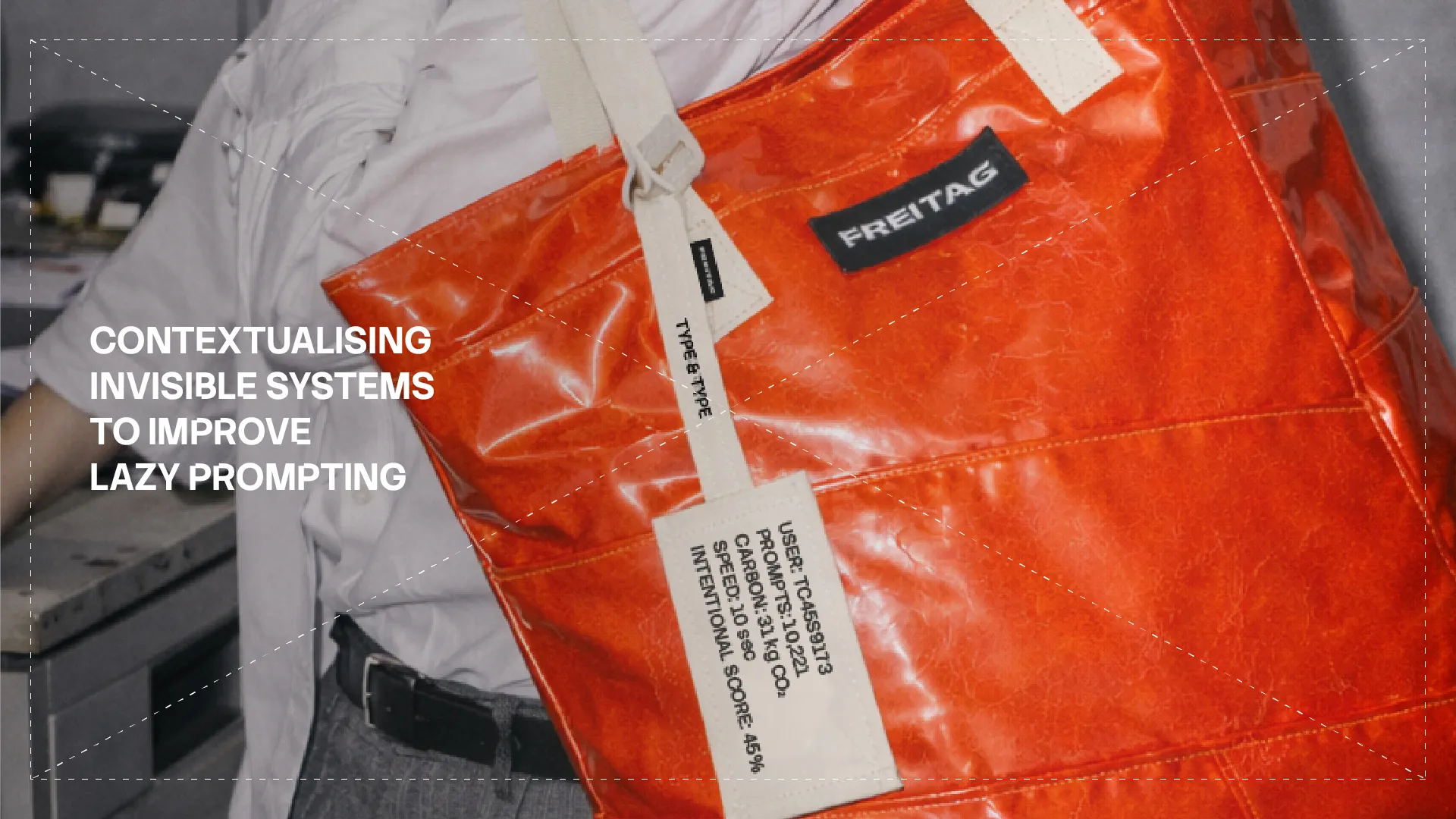 The project centres on a digital translator that understands users’ Gen-AI behaviours, including prompt volume, speed and iteration, and converts them into the form, stitching, and colour of their personalised FREITAG bag. Each design decision follows a fixed scoring system that turns digital habits into material consequences. A data clochette accompanies the bag, acting as a portable record of use that cannot be dismissed or closed.
