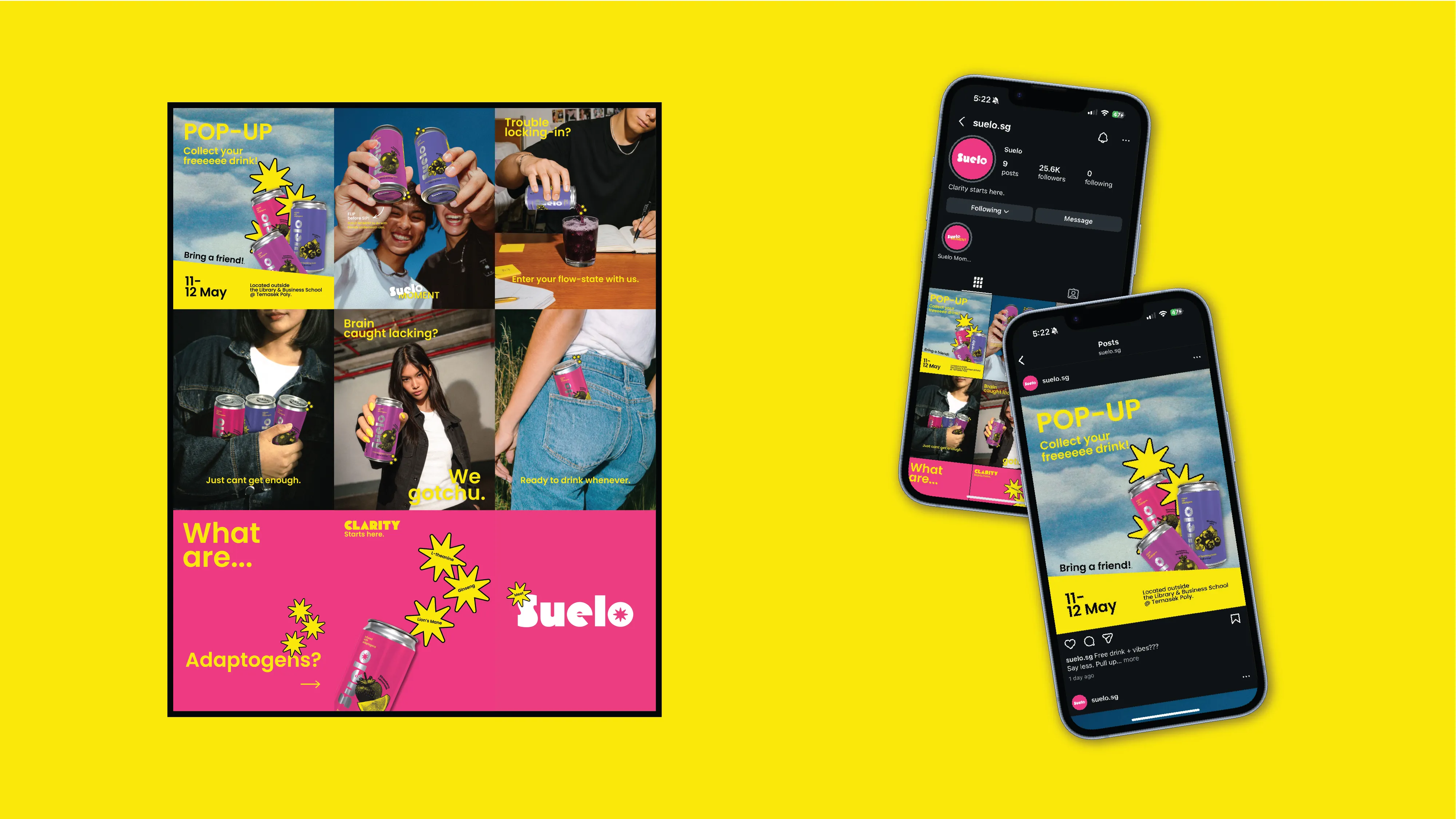 Suelo is a functional beverage and packaging experience designed to address mental fog among Gen Z, a condition increasingly caused by digital dependence, constant stimulation, and endless scrolling. While Gen Z are more connected than ever, this overstimulation often disrupts focus, memory, and meaningful social interaction. Rather than offering another caffeine-heavy energy drink or digital solution, Suelo explores how a physical, shared drinking experience can support mental clarity. Infused with brain-supporting fruit extracts and adaptogens ingredients such as L-theanine, Lion’s Mane, and ginseng, Suelo provides a clean, sustained lift without crashes.