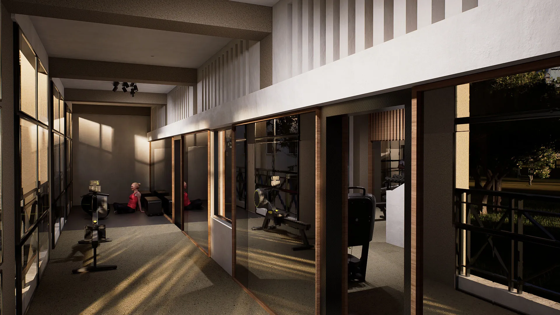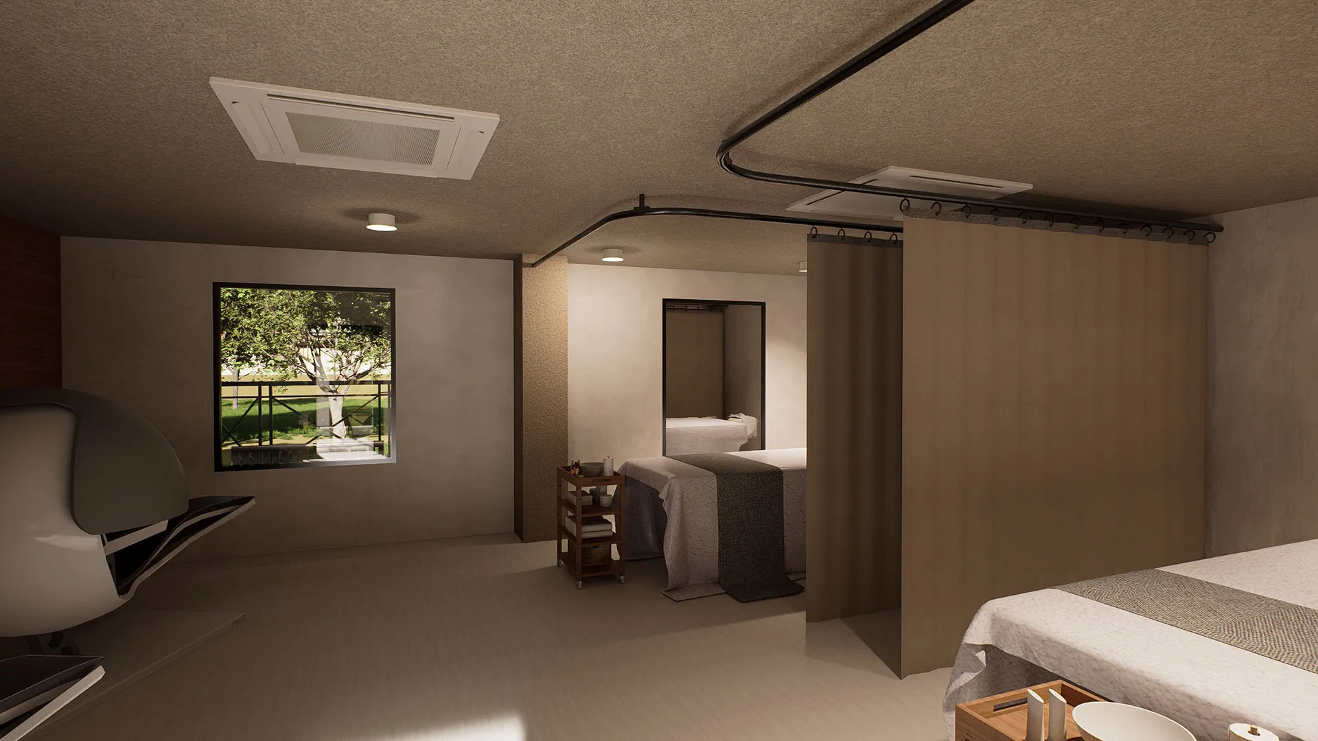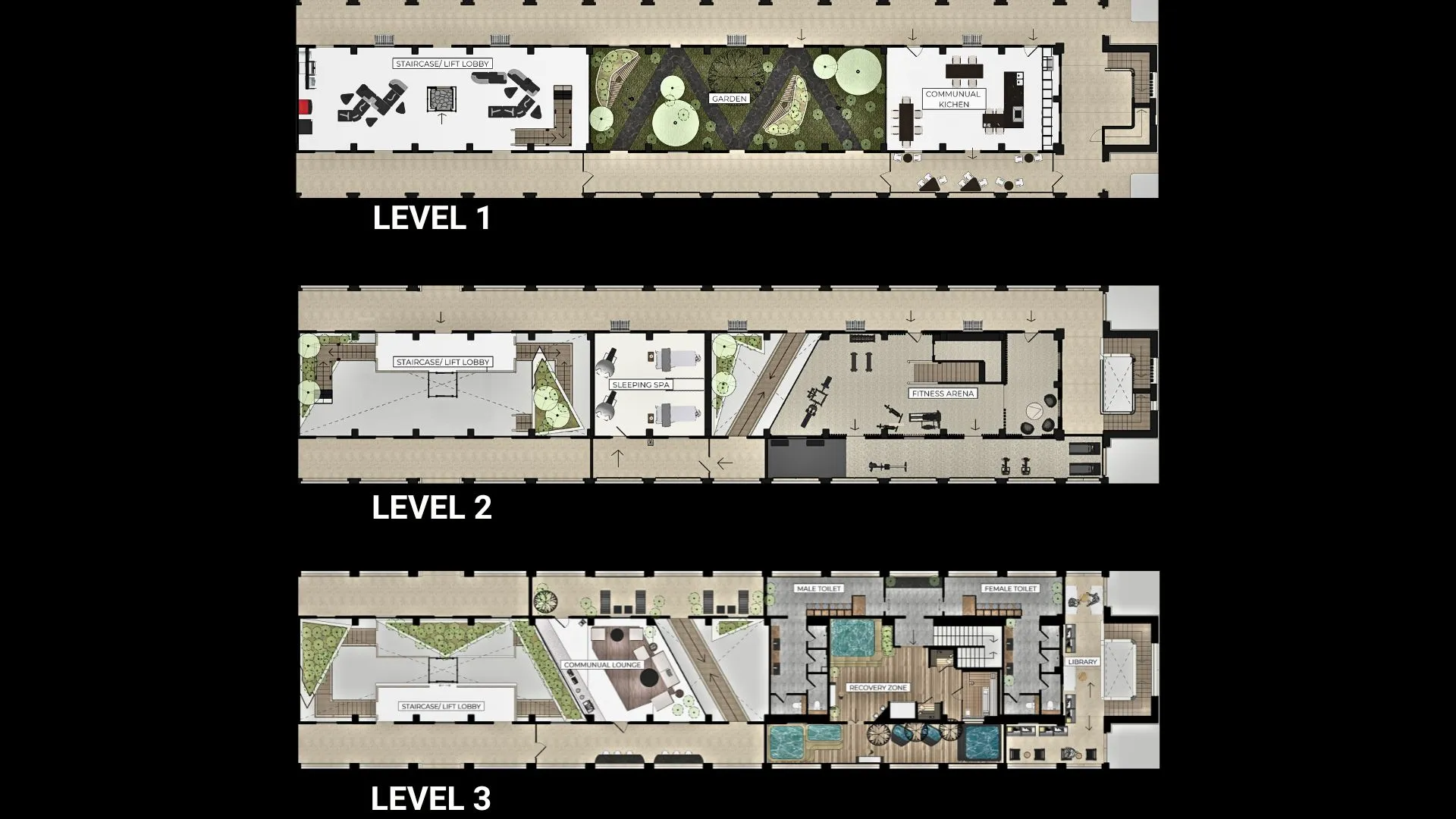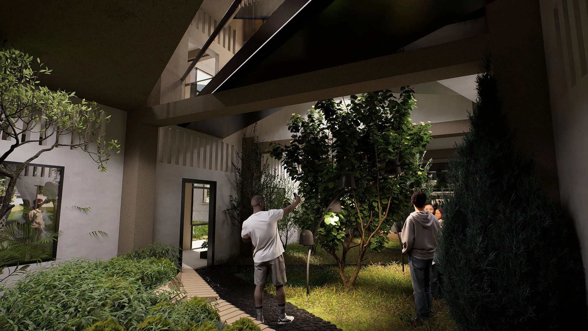 The Barracks Respite is a modular sanctuary designed for the "Sandwiched Generation"—caregivers, balancing elderly parents and young children. Located on a historic aircraft maintenance site, the project subverts the rigid military barracks through Aeronautical Staggering. By offsetting floor plates like bi-plane wings, the design creates Technical Voids that pull natural light and fresh air into a structural chassis. These voids act as acoustic buffers, protecting the interior recovery pods. The result is a high-performance "machine for healing" that uses rhythmic geometry and greenery to reduce sensory overload and provide deep restoration.