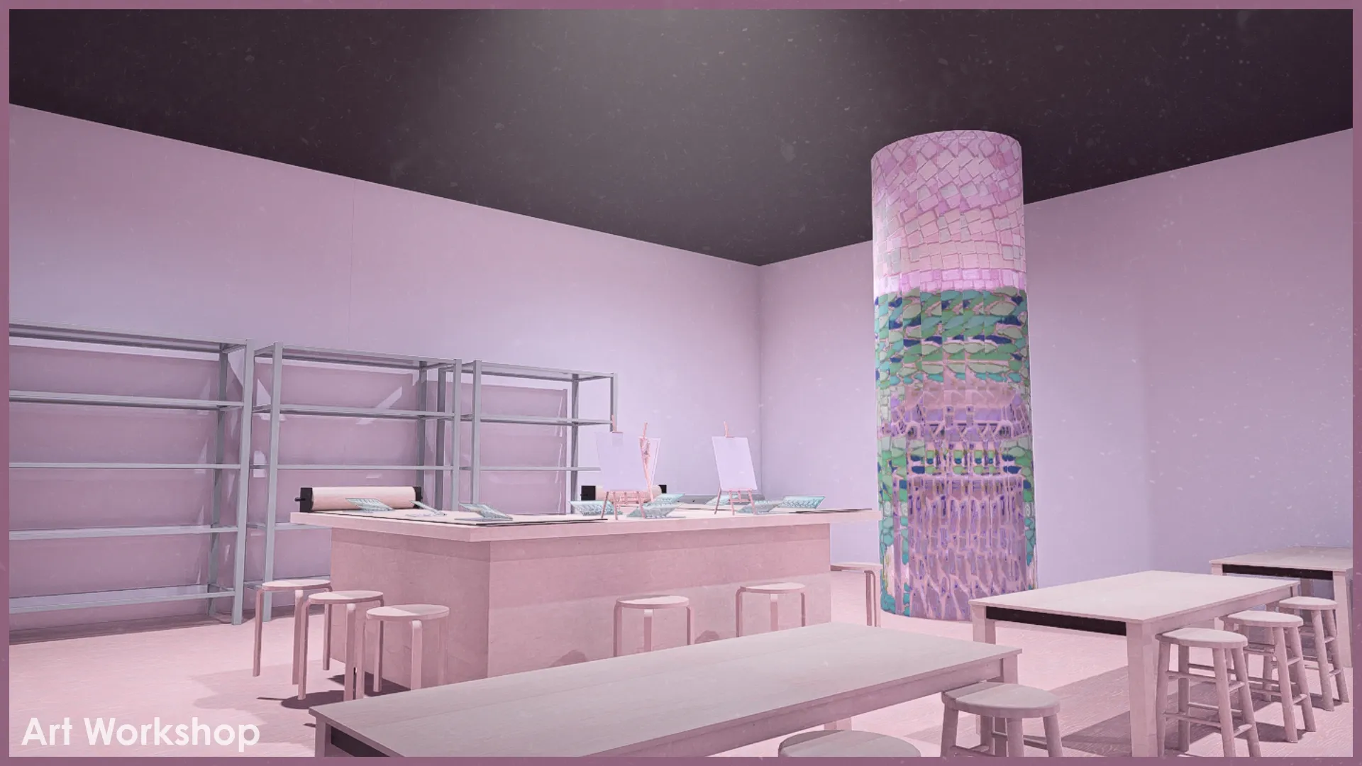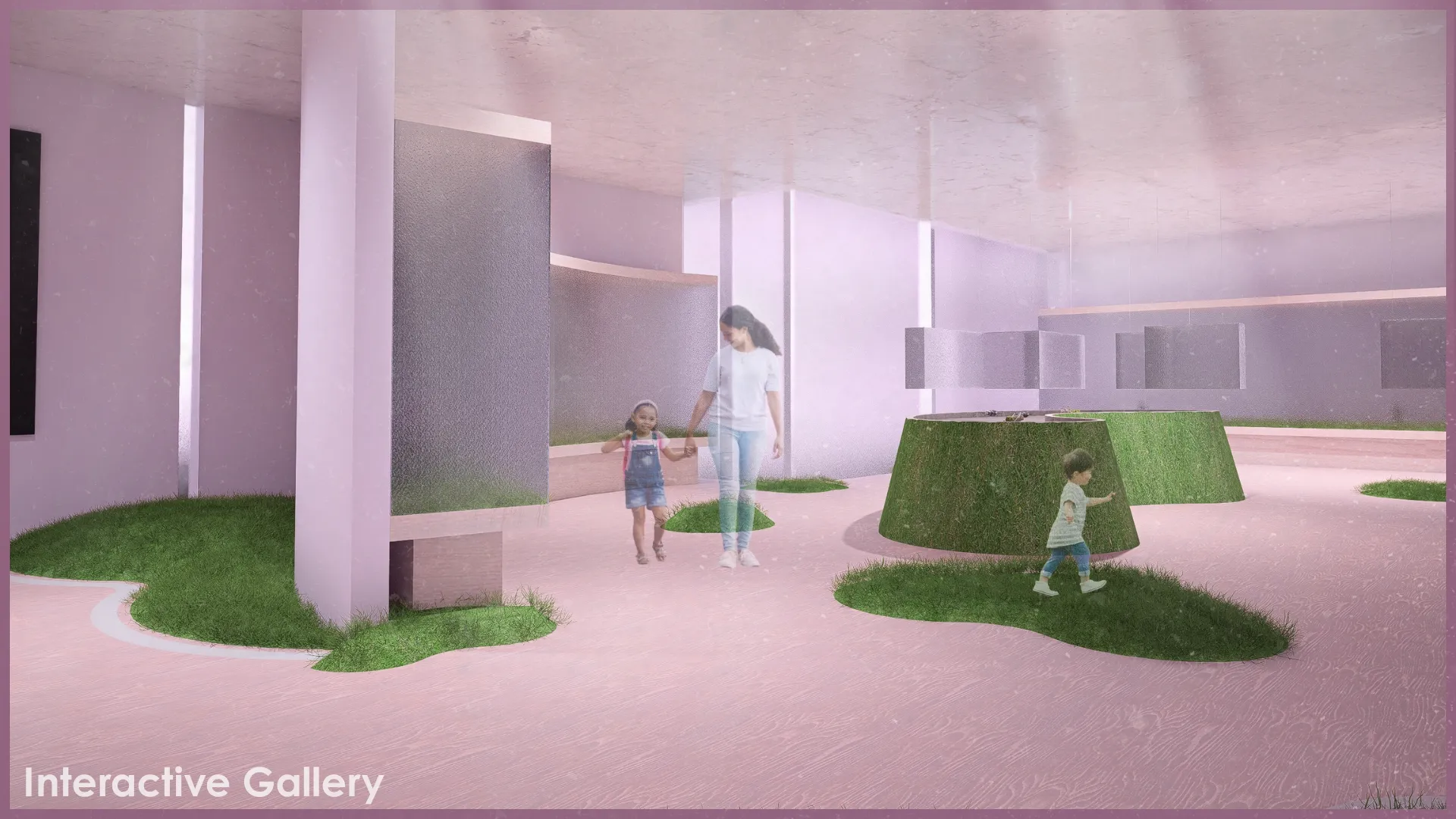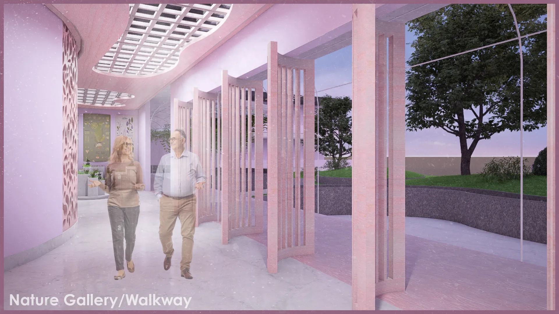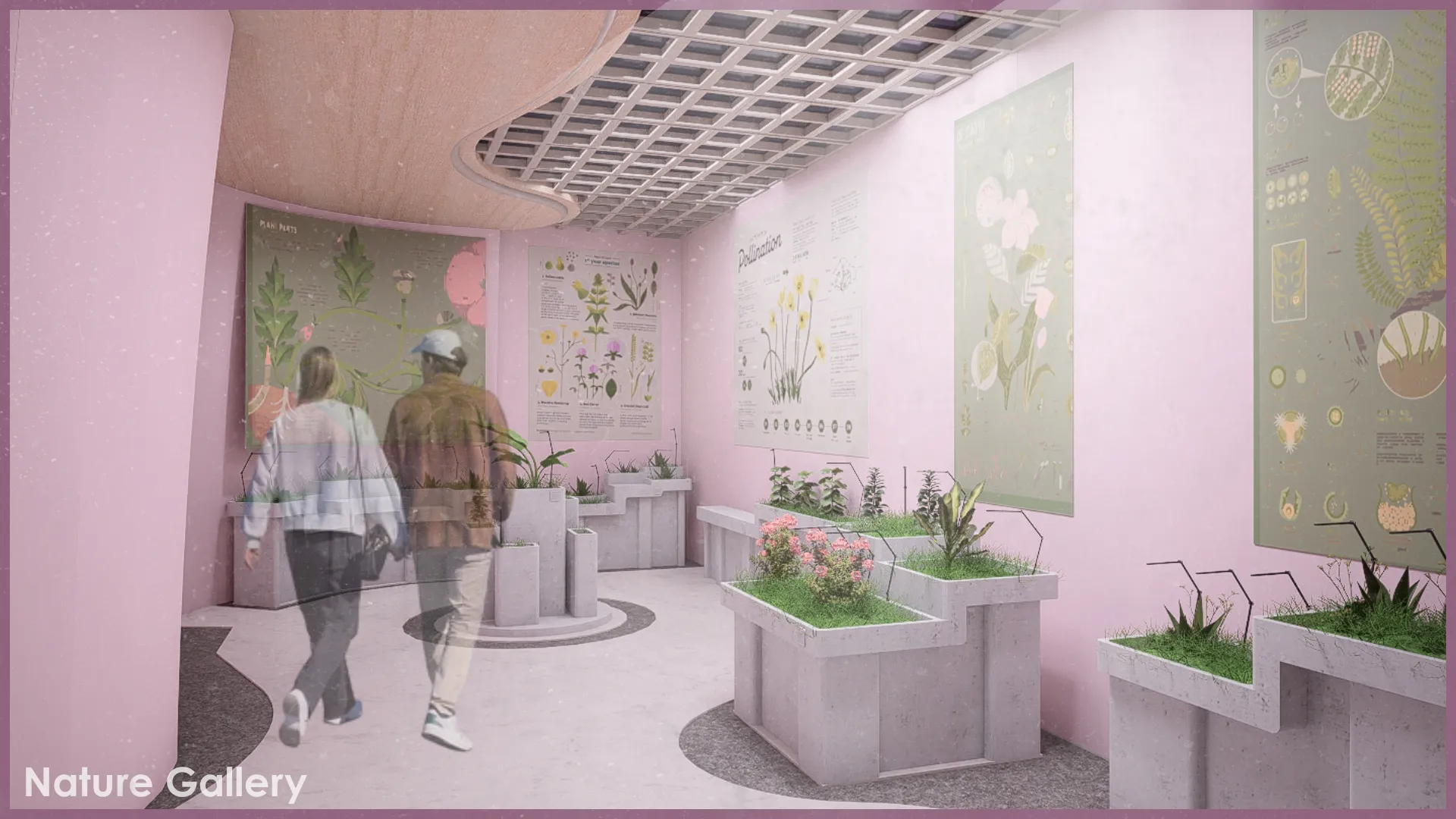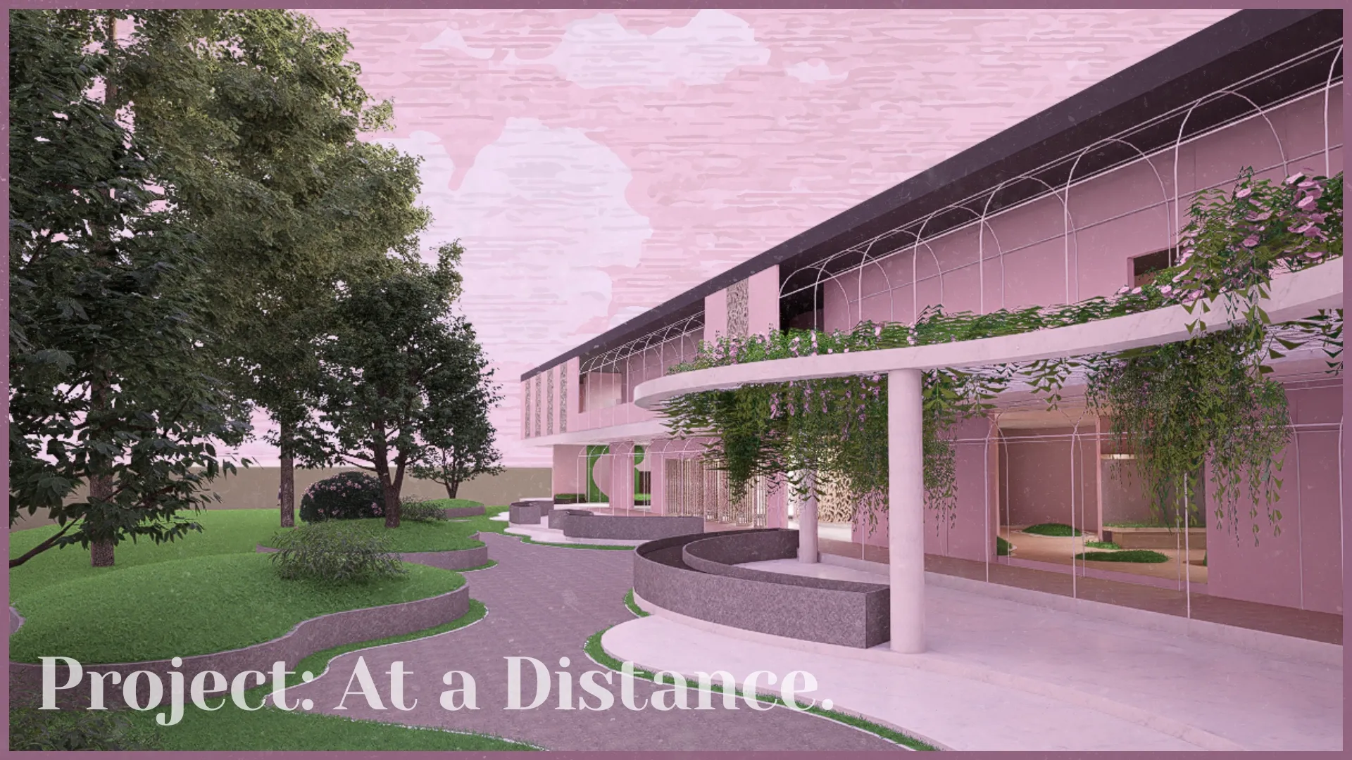 At a Distance is a project rooted in nostalgia; it is not just my site as a school, but also a piece of myself. The design utilises bright pink hues and light beige oak to create a calm, inviting atmosphere where people can relax and learn more about Singapore's plants. It was created to celebrate childhood by blending spaces into a leisure hub where both the elderly and youth can connect.