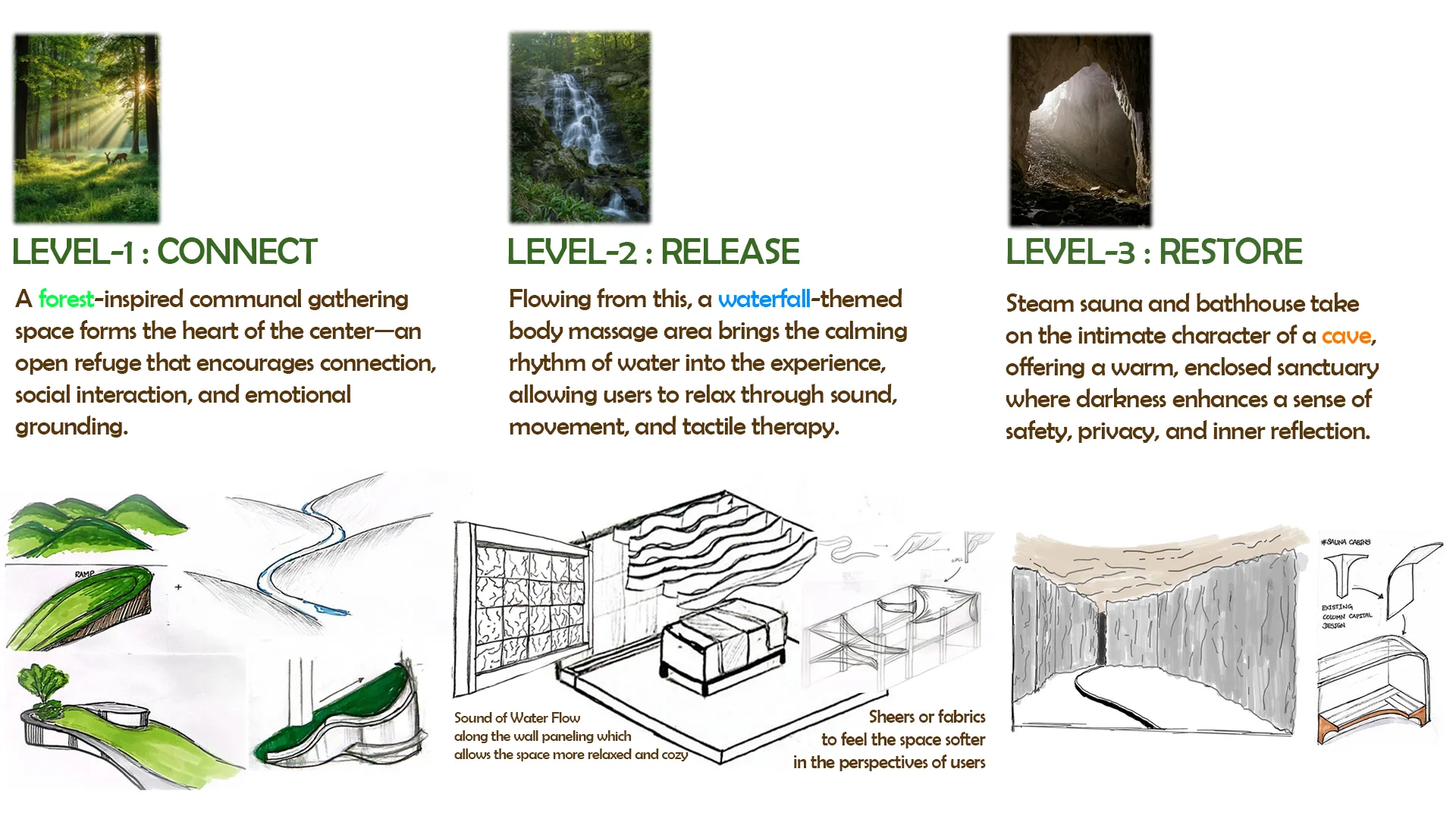 Inspired by the nature of forests, waterfalls and caves, I explore the contrast between light and shadow, openness and enclosure, and texture and materiality to represent the different ambiences of three spaces. I believe architecture should do more than function. It should comfort, heal, and reconnect people with nature, creating environments that foster emotional balance and a sense of home.