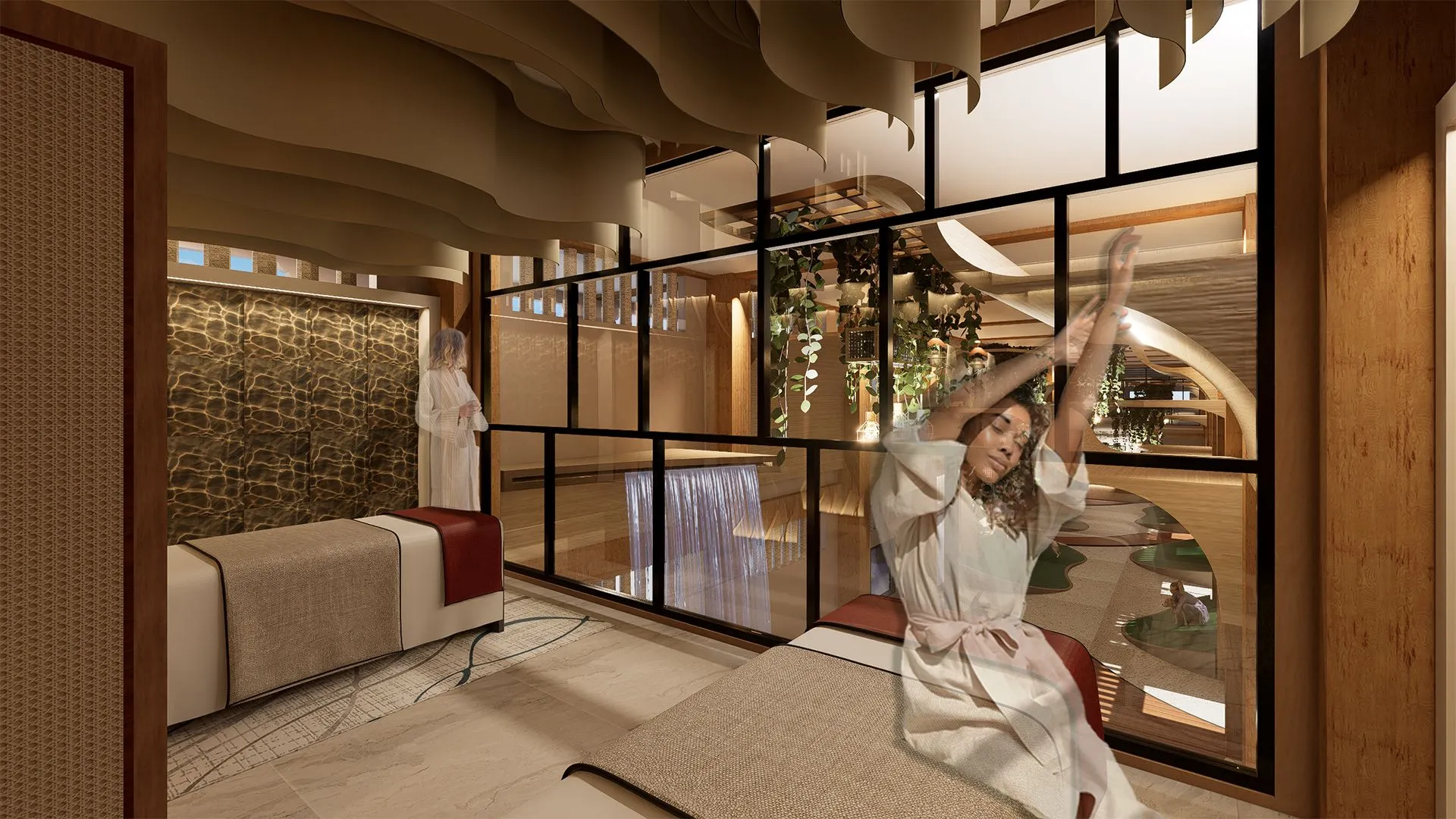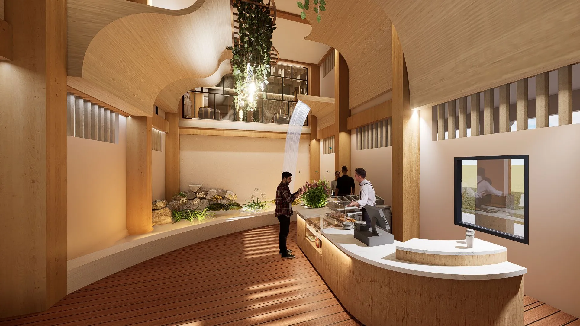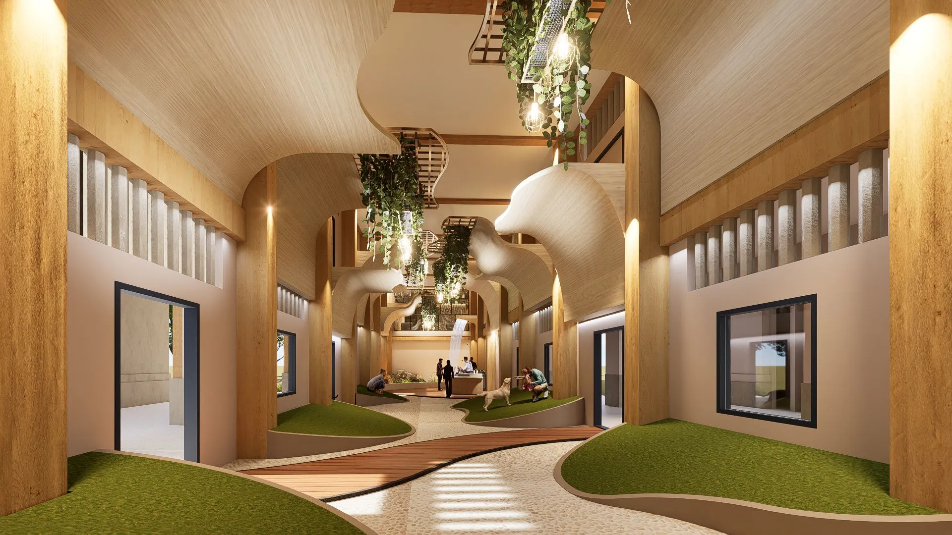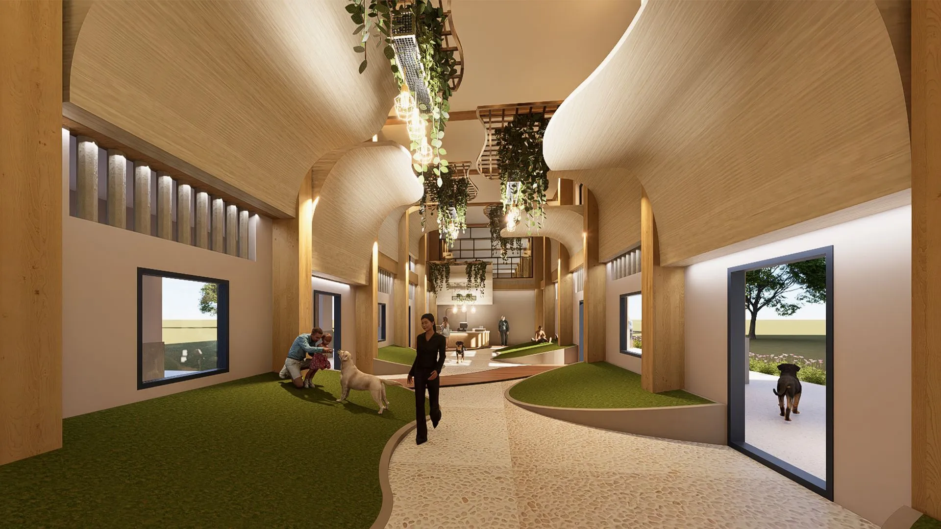 Harmony Grove envisions a nurturing mind-body wellness centre where people and their pets can unwind together in a place that feels genuinely like home. Rooted in biophilic design, the concept expresses the essence of a harmonious natural landscape through three elements—Forest, Waterfall, and Cave—creating a calming and restorative environment that supports relaxation, emotional balance, and a deeper connection to nature.