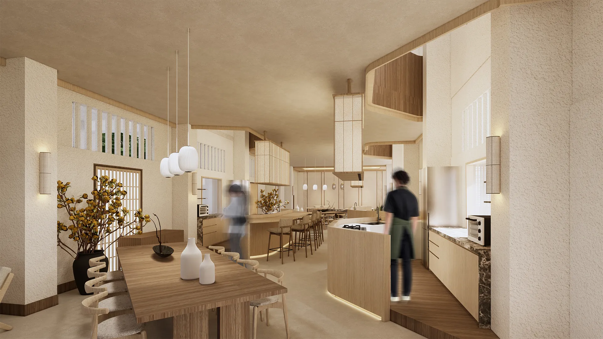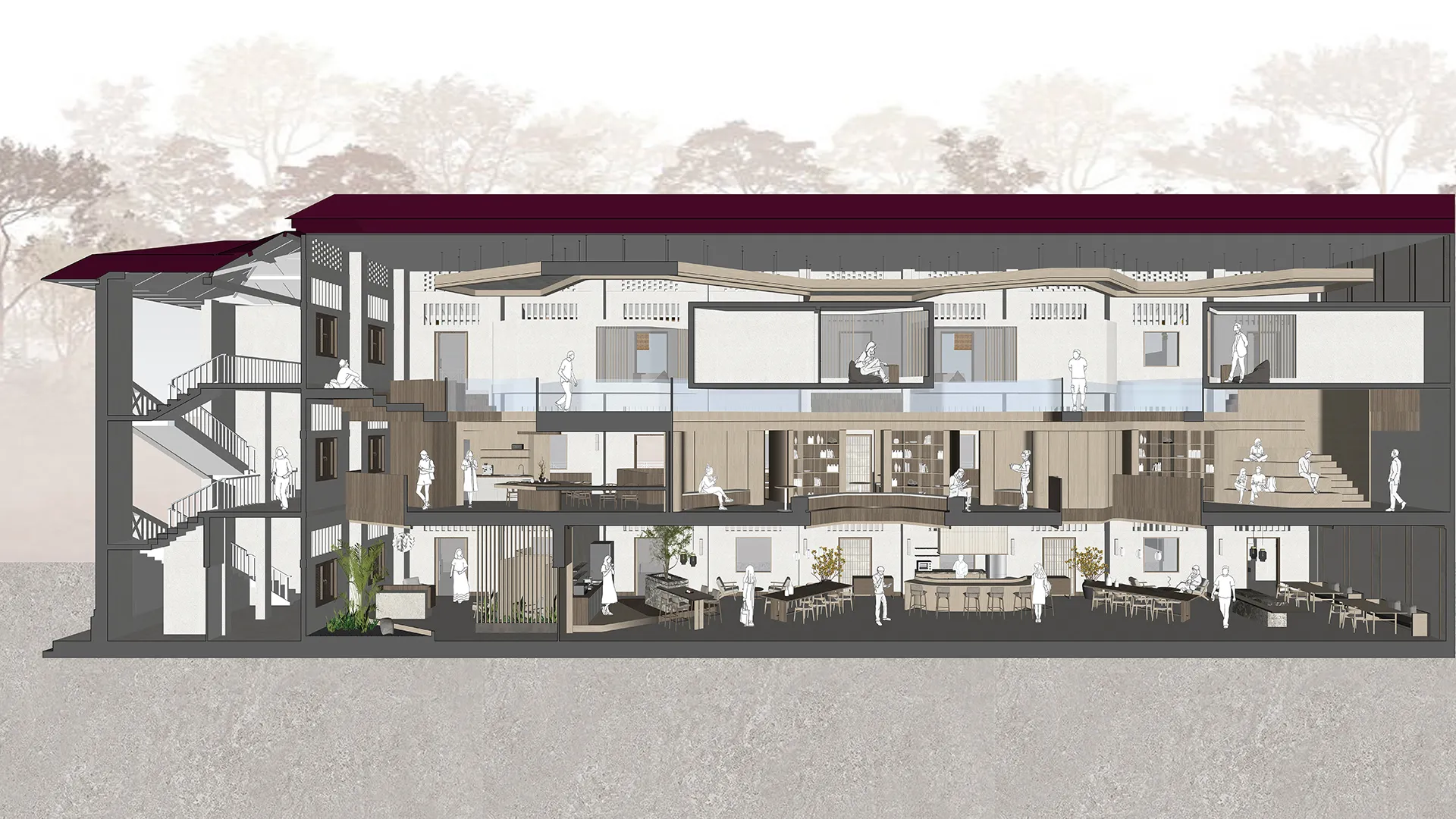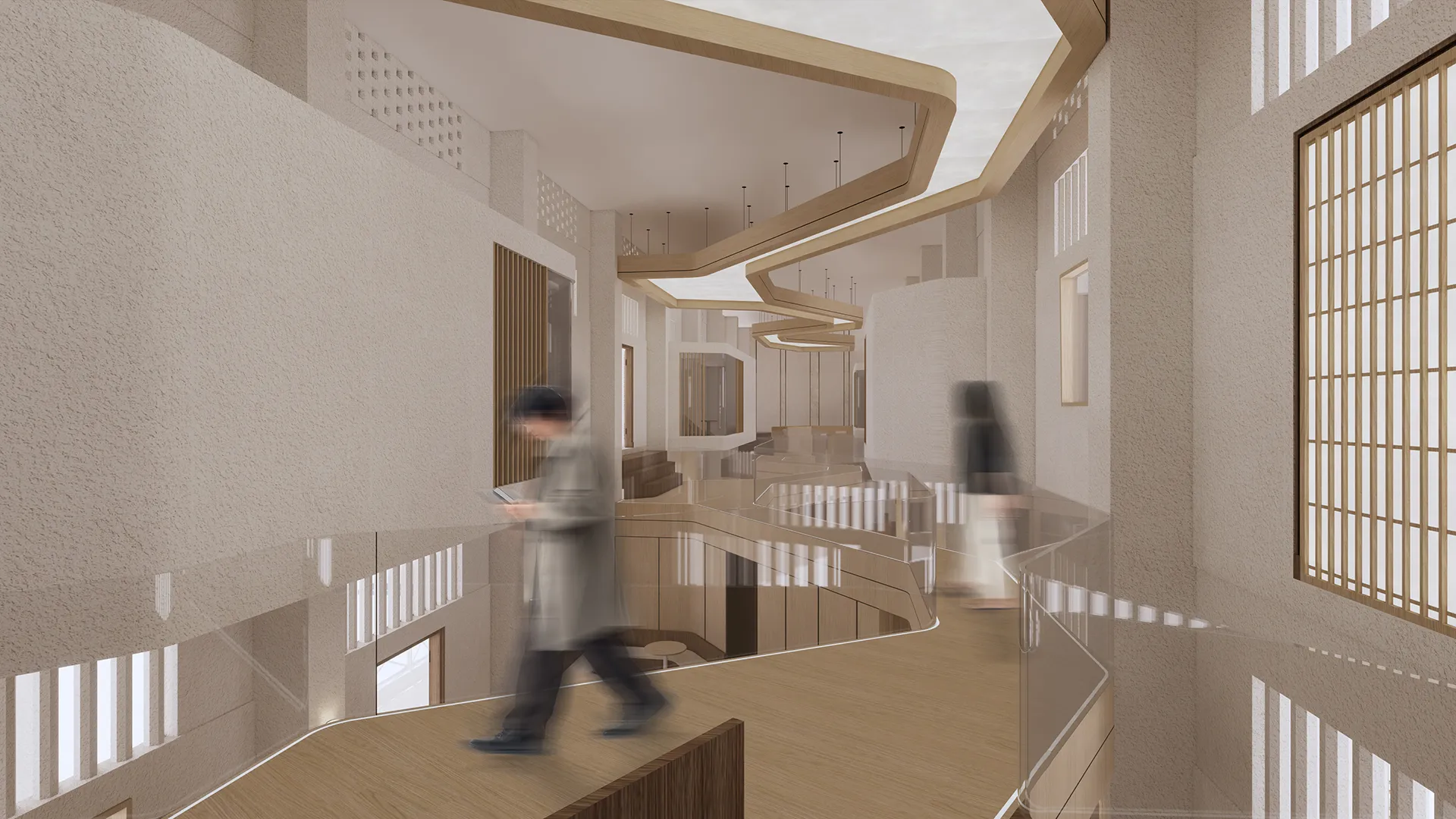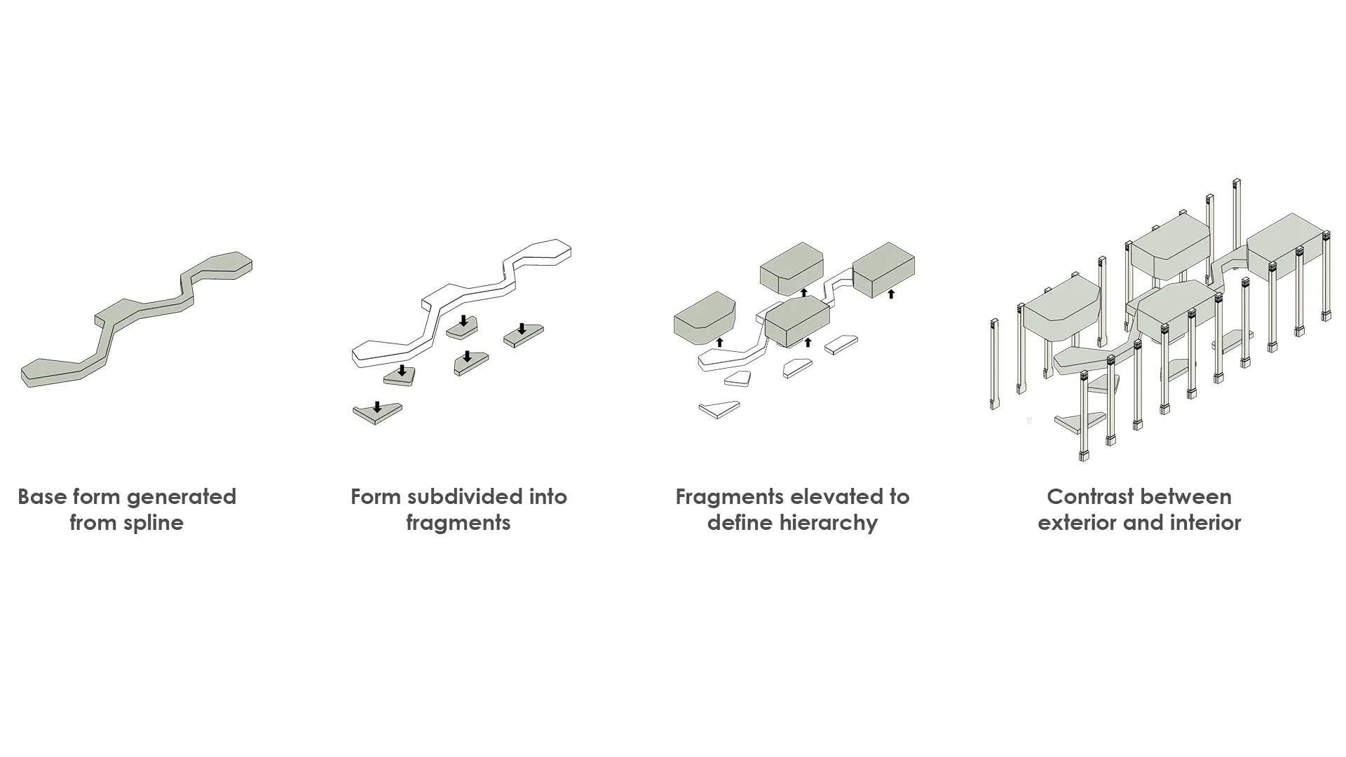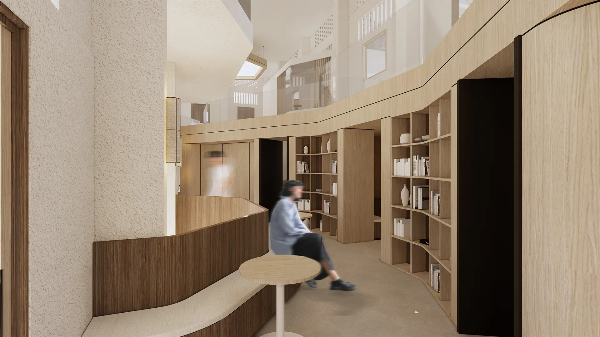 Within this controlled shell, the design introduces a fragmented interior as a contrasting spatial language. Spaces are organised as a gradual sequence, from intimate environments for personal reflection to open communal settings that support collective engagement.