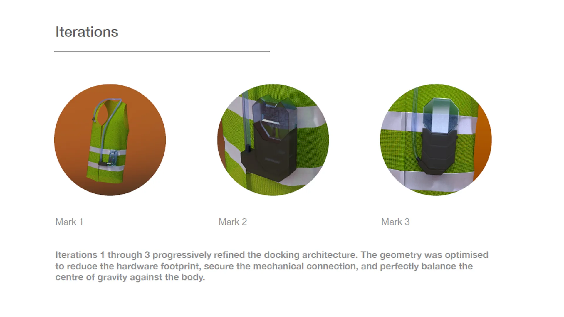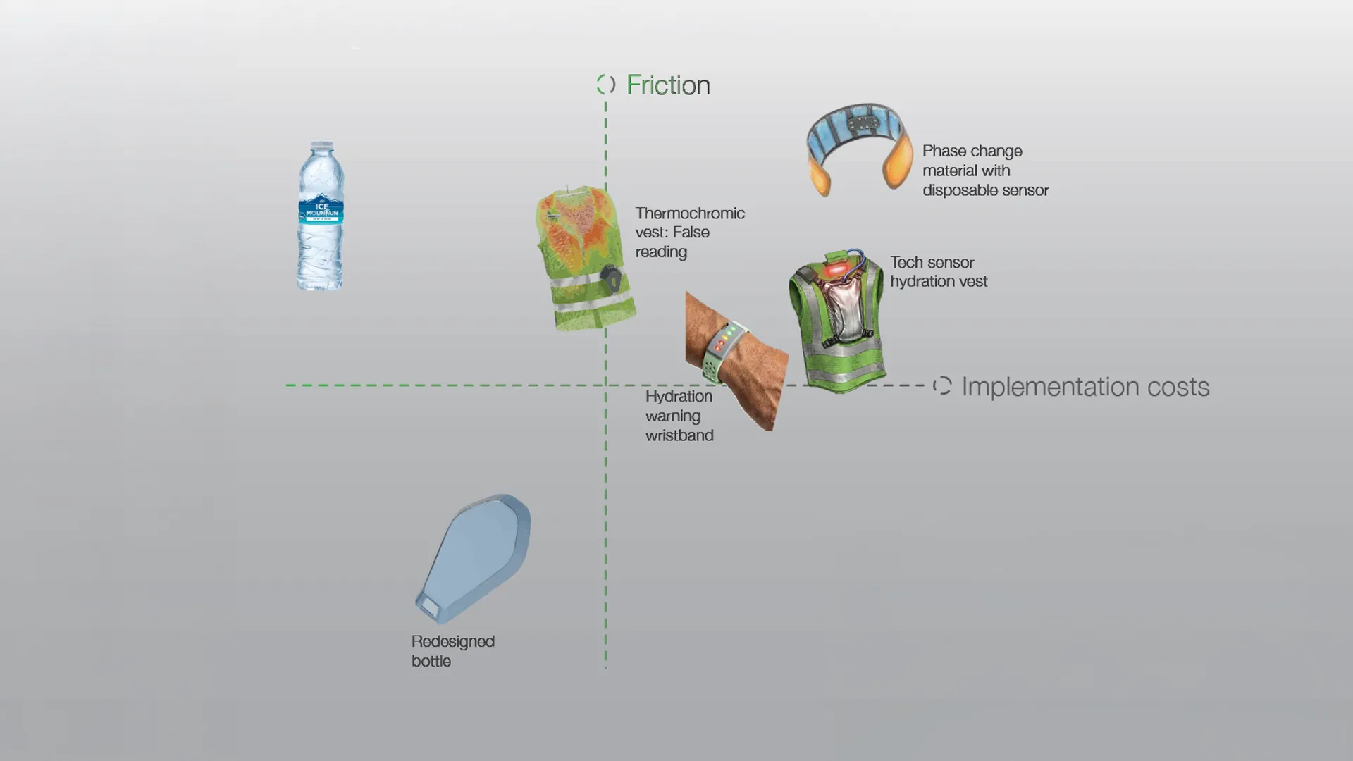 In Singapore’s hot, humid climate, migrant workers perform physically demanding tasks while wearing protective clothing that exacerbates heat stress. Many begin shifts already dehydrated, making early signs of overheating difficult to detect. Conventional water bottles disrupt workflow, requiring two-handed use and frequent pauses. Zero Friction reimagines hydration as a seamless, continuous behaviour. A flat 300 ml cartridge sits flush against the body to minimise movement, while an angular design and mechanical docking system enable quick, one-handed reloading, even with gloves. By removing physical barriers, the system encourages consistent hydration, helping reduce fatigue and heat-related risks during strenuous work.