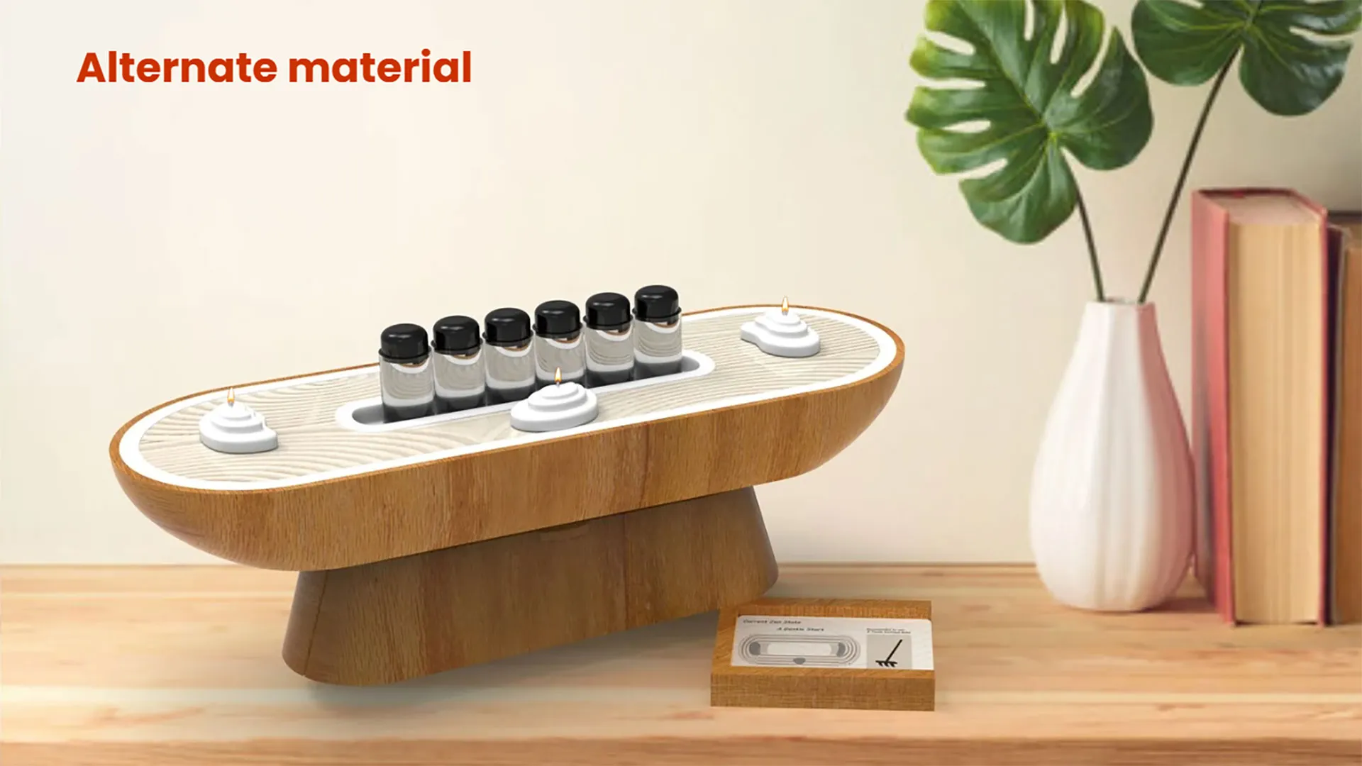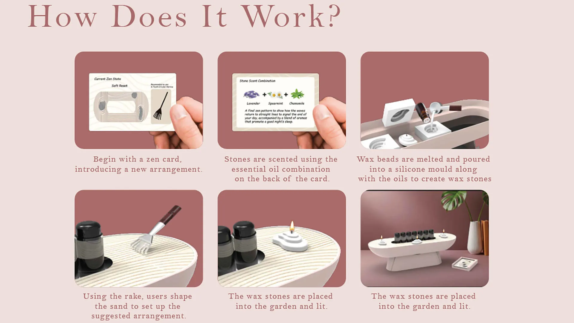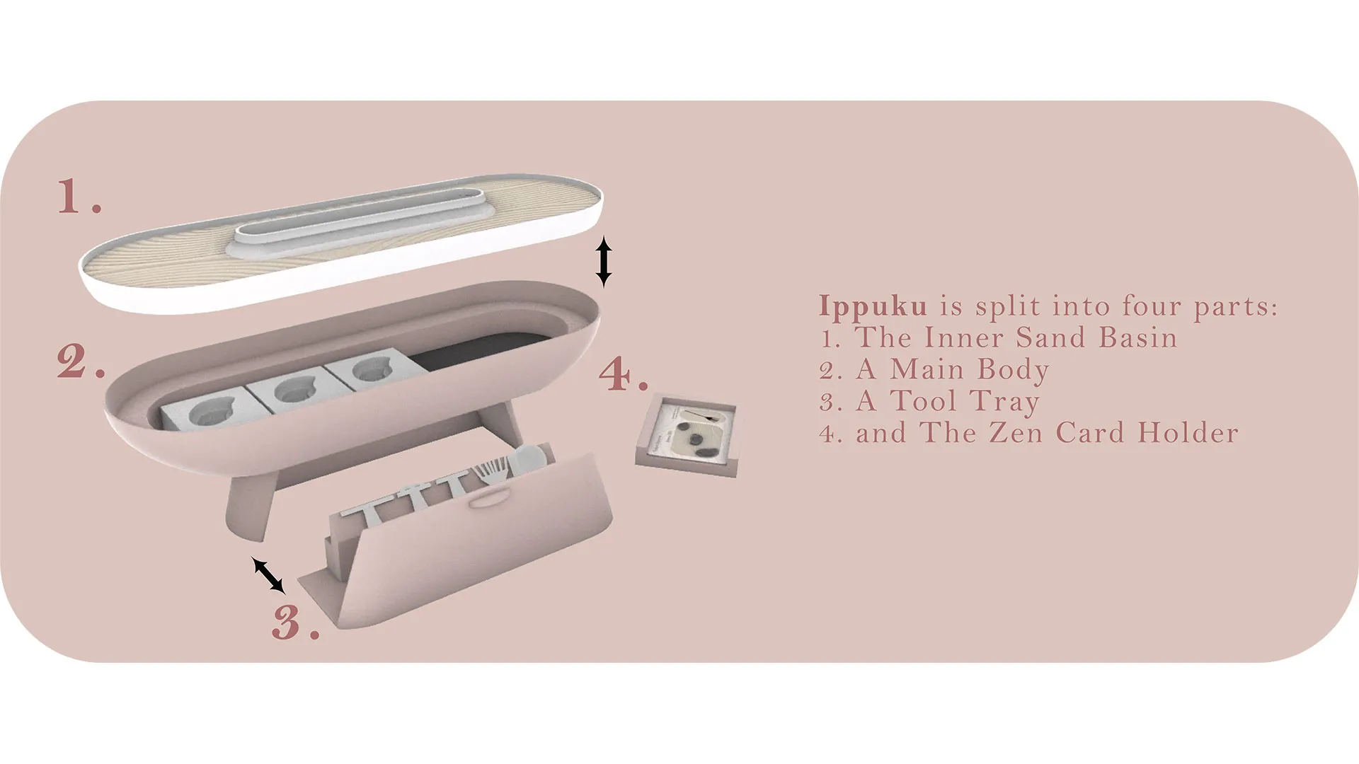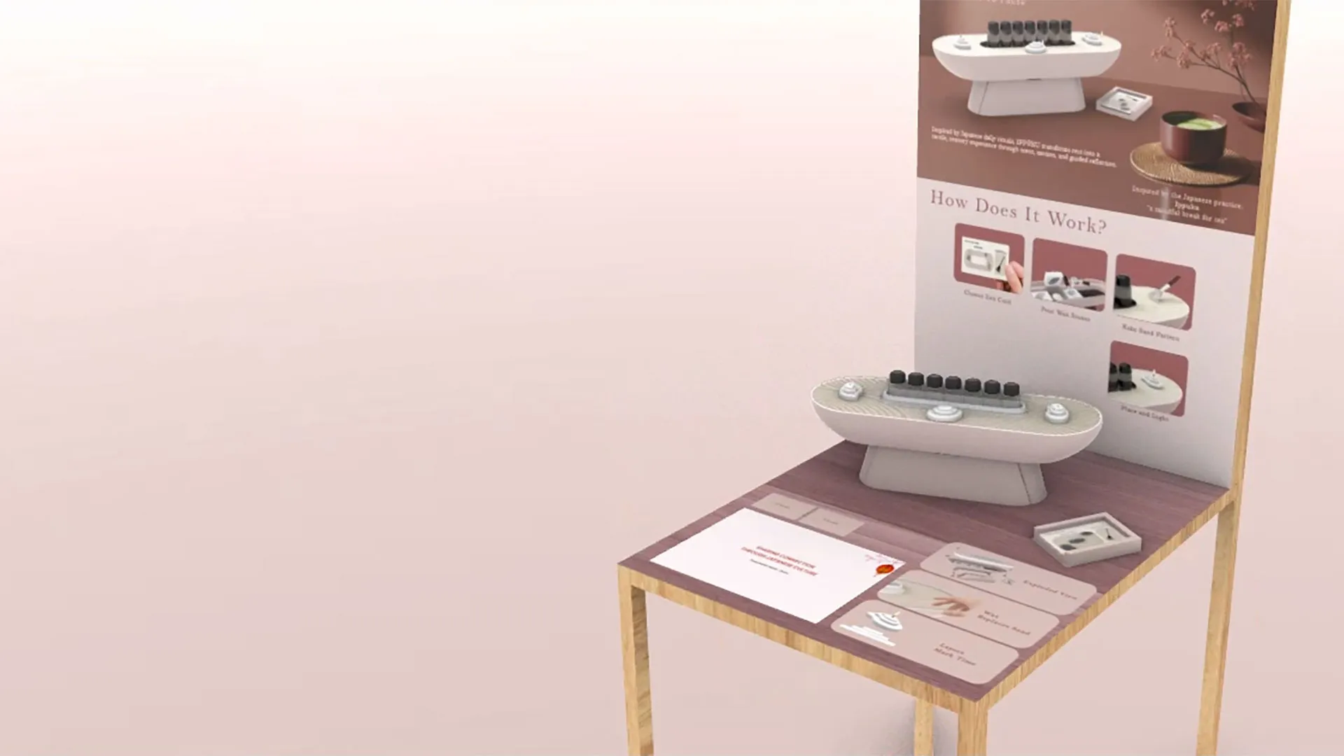 Ippuku is a guided mindfulness ritual kit that helps users decompress after overstimulating days. Combining tactile interaction and aromatherapy, it creates a multi-sensory wind-down experience. Each session begins with a Zen card that sets an intention, followed by shaping sand, arranging wax granules, and assembling essential oil stones into layered forms. When lit, the wax releases calming scents while visually marking the passage of time. By turning relaxation into an intentional ritual, Ippuku encourages users to step away from digital fatigue, pause mindfully, and reconnect with the present before transitioning into rest or personal time.