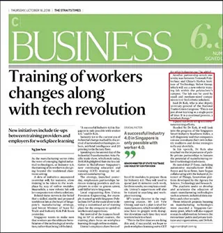 An article in The Straits Times (18 Oct 2018) reported on the collaboration between TP and HRG, as part of the new continuing education and training strategy announced by Senior Minister of State (Trade & Industry) Dr Koh Poh Koon at the Industrial Transformation Asia-Pacific trade show held on 17 & 18 Oct 2018.