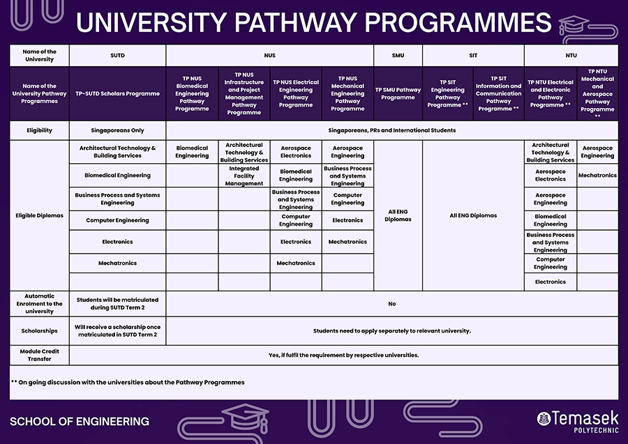 Jointly administered by Temasek Polytechnic (TP) in partnership with Singapore University of Technology and Design (SUTD), National University of Singapore (NUS) or Singapore Management University (SMU), these UPPs let you take modules taught by these universities in the final year of your diploma studies, thereby allowing you to earn credits which are recognised for selected degree programmes in SUTD, NUS or SMU.